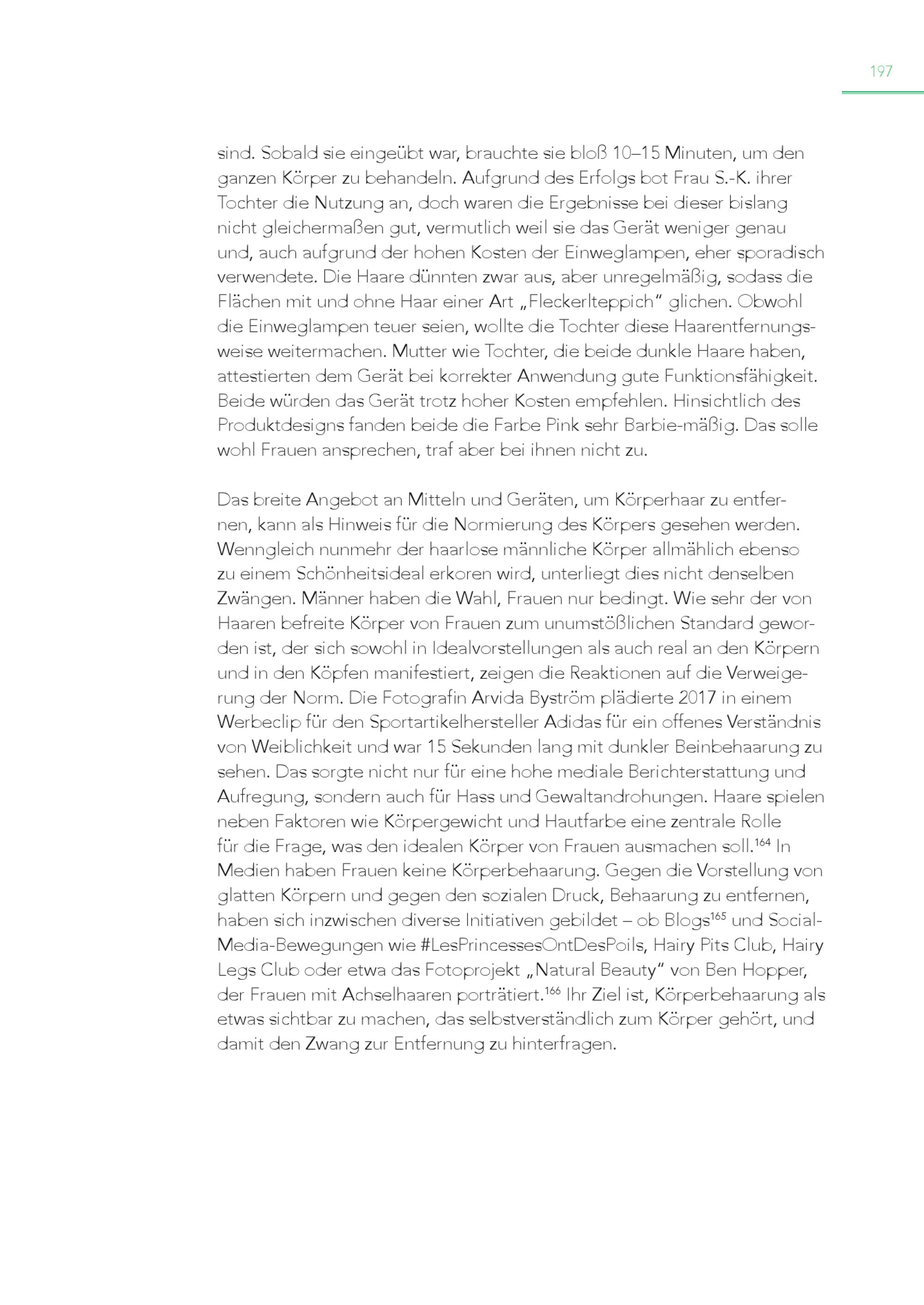 197 sind. Sobald sie eingeübt war, brauchte sie bloß 10–15 Minuten, um den ganzen Körper zu behandeln. Aufgrund des Erfolgs bot Frau S.-K. ihrer Tochter die Nutzung an, doch waren die Ergebnisse bei dieser bislang nicht gleichermaßen gut, vermutlich weil sie das Gerät weniger genau und, auch aufgrund der hohen Kosten der Einweglampen, eher sporadisch verwendete. Die Haare dünnten zwar aus, aber unregelmäßig, sodass die Flächen mit und ohne Haar einer Art„Fleckerlteppich“ glichen. Obwohl die Einweglampen teuer seien, wollte die Tochter diese Haarentfernungsweise weitermachen. Mutter wie Tochter, die beide dunkle Haare haben, attestierten dem Gerät bei korrekter Anwendung gute Funktionsfähigkeit. Beide würden das Gerät trotz hoher Kosten empfehlen. Hinsichtlich des Produktdesigns fanden beide die Farbe Pink sehr Barbie-mäßig. Das solle wohl Frauen ansprechen, traf aber bei ihnen nicht zu. Das breite Angebot an Mitteln und Geräten, um Körperhaar zu entfernen, kann als Hinweis für die Normierung des Körpers gesehen werden. Wenngleich nunmehr der haarlose männliche Körper allmählich ebenso zu einem Schönheitsideal erkoren wird, unterliegt dies nicht denselben Zwängen. Männer haben die Wahl, Frauen nur bedingt. Wie sehr der von Haaren befreite Körper von Frauen zum unumstößlichen Standard geworden ist, der sich sowohl in Idealvorstellungen als auch real an den Körpern und in den Köpfen manifestiert, zeigen die Reaktionen auf die Verweigerung der Norm. Die Fotografin Arvida Byström plädierte 2017 in einem Werbeclip für den Sportartikelhersteller Adidas für ein offenes Verständnis von Weiblichkeit und war 15 Sekunden lang mit dunkler Beinbehaarung zu sehen. Das sorgte nicht nur für eine hohe mediale Berichterstattung und Aufregung, sondern auch für Hass und Gewaltandrohungen. Haare spielen neben Faktoren wie Körpergewicht und Hautfarbe eine zentrale Rolle für die Frage, was den idealen Körper von Frauen ausmachen soll. 164 In Medien haben Frauen keine Körperbehaarung. Gegen die Vorstellung von glatten Körpern und gegen den sozialen Druck, Behaarung zu entfernen, haben sich inzwischen diverse Initiativen gebildet – ob Blogs 165 und SocialMedia-Bewegungen wie#LesPrincessesOntDesPoils, Hairy Pits Club, Hairy Legs Club oder etwa das Fotoprojekt„Natural Beauty“ von Ben Hopper, der Frauen mit Achselhaaren porträtiert. 166 Ihr Ziel ist, Körperbehaarung als etwas sichtbar zu machen, das selbstverständlich zum Körper gehört, und damit den Zwang zur Entfernung zu hinterfragen.