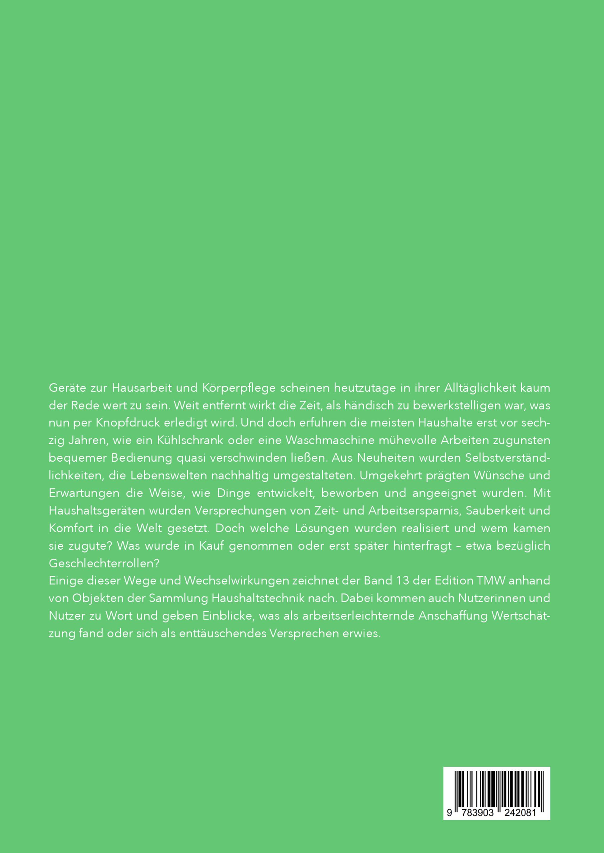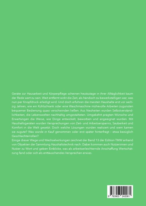 Geräte zur Hausarbeit und Körperpflege scheinen heutzutage in ihrer Alltäglichkeit kaum der Rede wert zu sein. Weit entfernt wirkt die Zeit, als händisch zu bewerkstelligen war, was nun per Knopfdruck erledigt wird. Und doch erfuhren die meisten Haushalte erst vor sech zig Jahren, wie ein Kühlschrank oder eine Waschmaschine mühevolle Arbeiten zugunsten bequemer Bedienung quasi verschwinden ließen. Aus Neuheiten wurden Selbstverständ lichkeiten, die Lebenswelten nachhaltig umgestalteten. Umgekehrt prägten Wünsche und Erwartungen die Weise, wie Dinge entwickelt, beworben und angeeignet wurden. Mit Haushaltsgeräten wurden Versprechungen von Zeit- und Arbeitsersparnis, Sauberkeit und Komfort in die Welt gesetzt. Doch welche Lösungen wurden realisiert und wem kamen sie zugute? Was wurde in Kauf genommen oder erst später hinterfragt – etwa bezüglich Geschlechterrollen? Einige dieser Wege und Wechselwirkungen zeichnet der Band 13 der Edition TMW anhand von Objekten der Sammlung Haushaltstechnik nach. Dabei kommen auch Nutzerinnen und Nutzer zu Wort und geben Einblicke, was als arbeitserleichternde Anschaffung Wertschät zung fand oder sich als enttäuschendes Versprechen erwies.