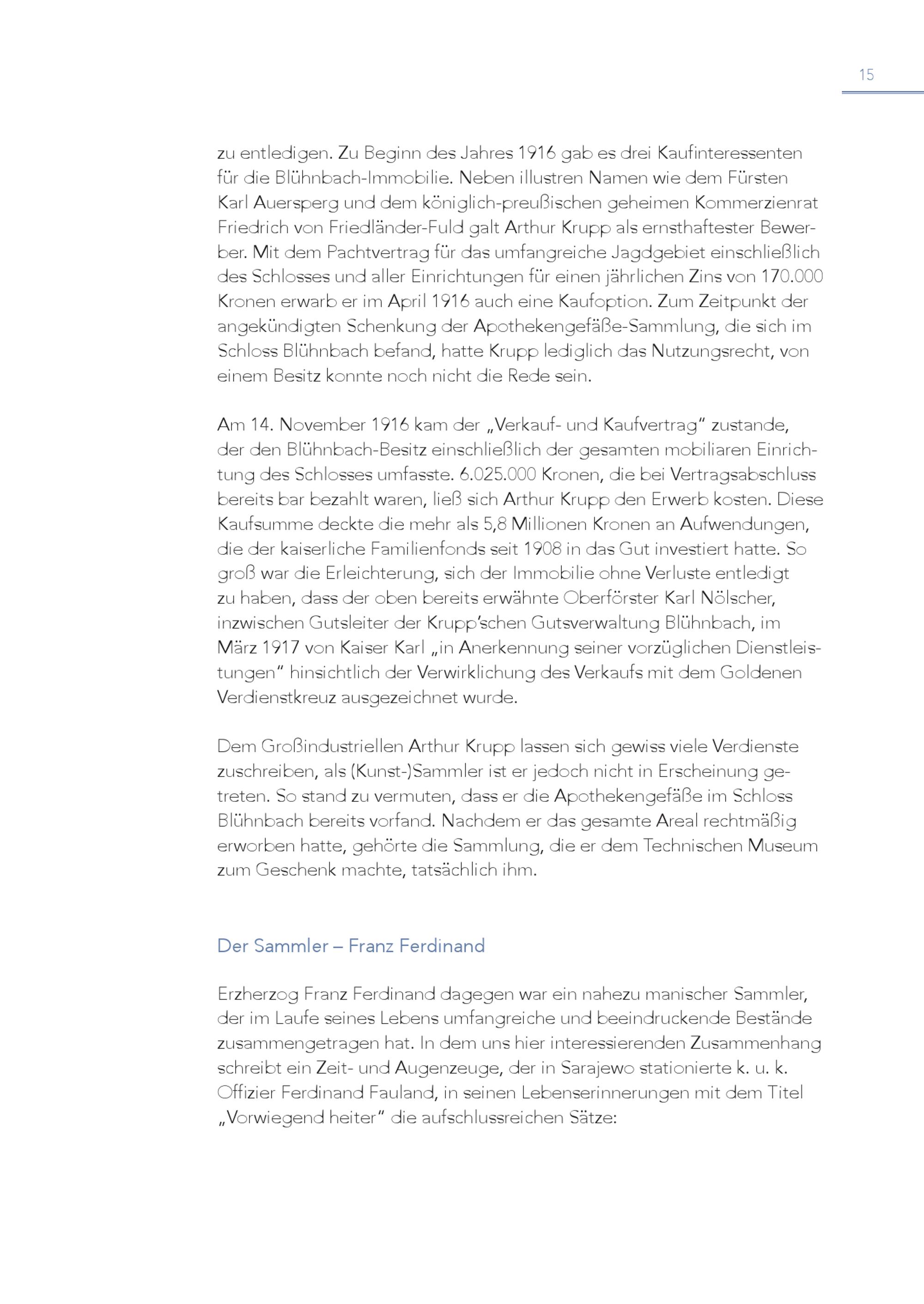 15 digen. Zu Beginn des Jahres 1916 gab es drei Kaufinteressenten für die Blühnbach-Immobilie. Neben illustren Namen wie dem Fürsten Karl Auersperg und dem königlich-preußischen geheimen Kommerzienrat Friedrich von Friedländer-Fuld galt Arthur Krupp als ernsthaftester Bewerber. Mit dem Pachtvertrag für das umfangreiche Jagdgebiet einschließlich des Schlosses und aller Einrichtungen für einen jährlichen Zins von 170.000 Kronen erwarb er im April 1916 auch eine Kaufoption. Zum Zeitpunkt der angekündigten Schenkung der Apothekengefäße-Sammlung, die sich im Schloss Blühnbach befand, hatte Krupp lediglich das Nutzungsrecht, von einem Besitz konnte noch nicht die Rede sein. Am 14. November 1916 kam der„Verkauf- und Kaufvertrag“ zustande, der den Blühnbach-Besitz einschließlich der gesamten mobiliaren Einrichtung des Schlosses umfasste. 6.025.000 Kronen, die bei Vertragsabschluss bereits bar bezahlt waren, ließ sich Arthur Krupp den Erwerb kosten. Diese Kaufsumme deckte die mehr als 5,8 Millionen Kronen an Aufwendungen, die der kaiserliche Familienfonds seit 1908 in das Gut investiert hatte. So groß war die Erleichterung, sich der Immobilie ohne Verluste entledigt zu haben, dass der oben bereits erwähnte Oberförster Karl Nölscher, inzwischen Gutsleiter der Krupp’schen Gutsverwaltung Blühnbach, im März 1917 von Kaiser Karl„in Anerkennung seiner vorzüglichen Dienstleistungen“ hinsichtlich der Verwirklichung des Verkaufs mit dem Goldenen Verdienstkreuz ausgezeichnet wurde. Dem Großindustriellen Arthur Krupp lassen sich gewiss viele Verdienste zuschreiben, als(Kunst-)Sammler ist er jedoch nicht in Erscheinung getreten. So stand zu vermuten, dass er die Apothekengefäße im Schloss Blühnbach bereits vorfand. Nachdem er das gesamte Areal rechtmäßig erworben hatte, gehörte die Sammlung, die er dem Technischen Museum zum Geschenk machte, tatsächlich ihm. Der Sammler – Franz Ferdinand Erzherzog Franz Ferdinand dagegen war ein nahezu manischer Sammler, der im Laufe seines Lebens umfangreiche und beeindruckende Bestände zusammengetragen hat. In dem uns hier interessierenden Zusammenhang schreibt ein Zeit- und Augenzeuge, der in Sarajewo stationierte k. u. k. Offizier Ferdinand Fauland, in seinen Lebenserinnerungen mit dem Titel „Vorwiegend heiter“ die aufschlussreichen Sätze: