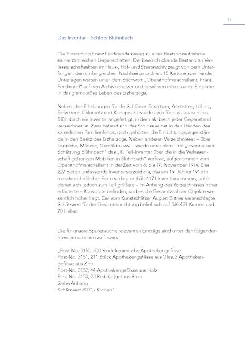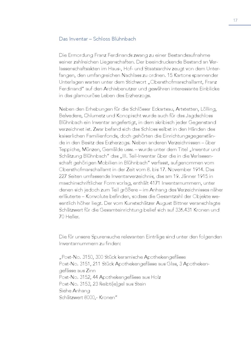 17 Das Inventar – Schloss Blühnbach Die Ermordung Franz Ferdinands zwang zu einer Bestandsaufnahme seiner zahlreichen Liegenschaften. Der beeindruckende Bestand an Verlassenschaftsakten im Haus-, Hof- und Staatsarchiv zeugt von dem Unterfangen, den umfangreichen Nachlass zu ordnen. 15 Kartons spannender Unterlagen warten unter dem Stichwort„Obersthofmarschallamt, Franz Ferdinand“ auf den Archivbenutzer und gewähren interessante Einblicke in das glamouröse Leben des Erzherzogs. Neben den Erhebungen für die Schlösser Eckartsau, Artstetten, Lölling, Belvedere, Chlumetz und Konopischt wurde auch für das Jagdschloss Blühnbach ein Inventar angefertigt, in dem akribisch jeder Gegenstand verzeichnet ist. Zwar befand sich das Schloss selbst in den Händen des kaiserlichen Familienfonds, doch gehörten die Einrichtungsgegenstände in den Besitz des Erzherzogs. Neben anderen Verzeichnissen – über Teppiche, Münzen, Gemälde usw. – wurde unter dem Titel„Inventur und Schätzung Blühnbach“ das„III. Teil-Inventar über die in die Verlassenschaft gehörigen Mobilien in Blühnbach“ verfasst, aufgenommen vom Obersthofmarschallamt in der Zeit vom 8. bis 17. November 1914. Das 227 Seiten umfassende Inventarverzeichnis, das am 19. Jänner 1915 in maschinschriftlicher Form vorlag, enthält 4171 Inventarnummern, unter denen sich jedoch zum Teil größere – im Anhang des Verzeichnisses näher erläuterte – Konvolute befinden, sodass die Gesamtzahl der Objekte wesentlich höher liegt. Der vom Kunstschätzer August Bittner veranschlagte Schätzwert für die Gesamteinrichtung belief sich auf 336.431 Kronen und 70 Heller. Die für unsere Spurensuche relevanten Einträge sind unter den folgenden Inventarnummern zu finden: „Post-No. 3150, 300 Stück keramische Apothekengefässe Post-No. 3151, 211 Stück Apothekengefässe aus Glas, 3 Apothekengefässe aus Zinn Post-No. 3152, 44 Apothekengefässe aus Holz Post-No. 3153, 23 Reibti[e]gel aus Stein Siehe Anhang Schätzwert 8000,- Kronen“
