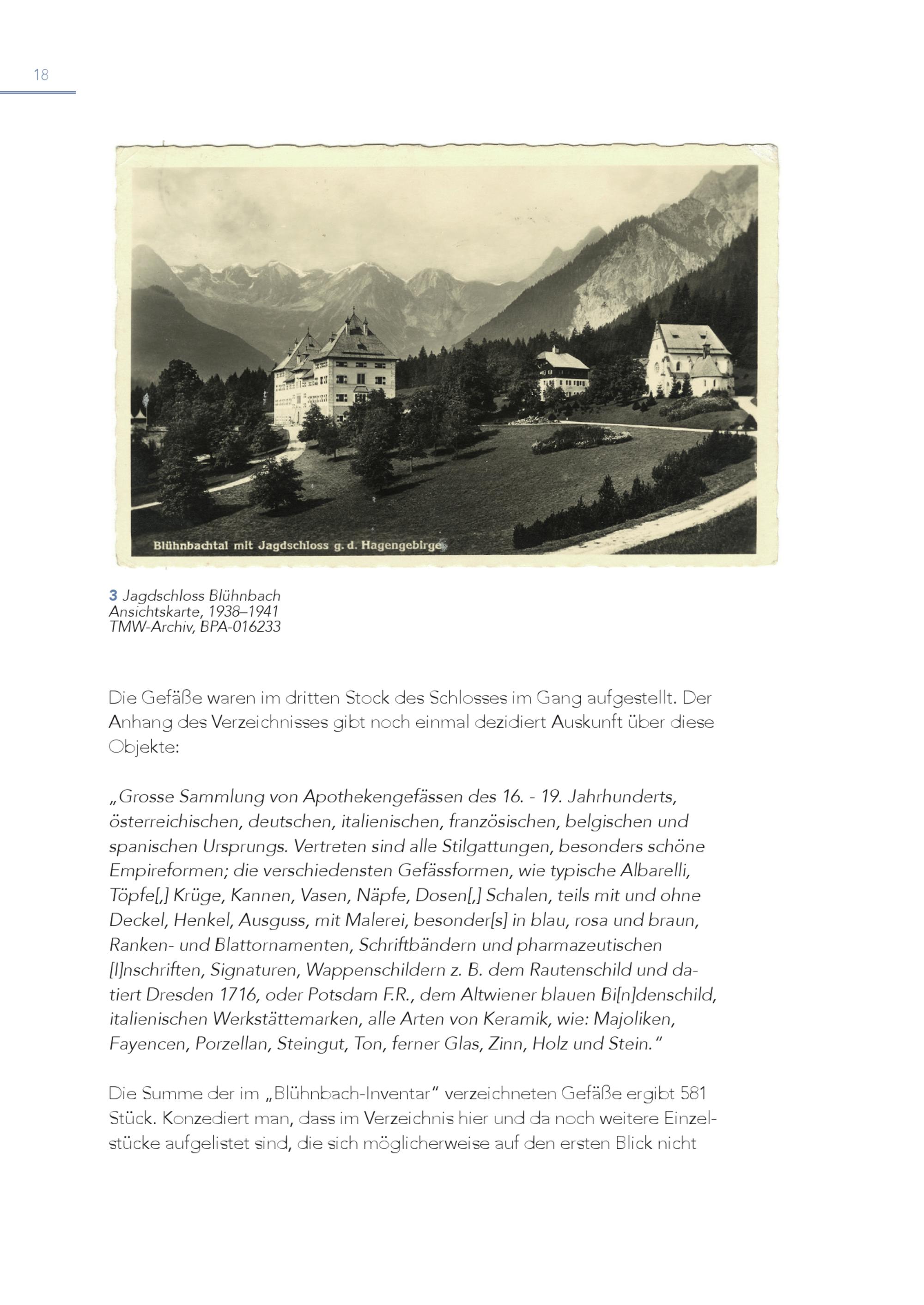 18 3 An J s a i g ch d t s s c k h a l r o te ss , Blühnbach 1938–1941 TMW-Archiv, BPA-016233 Die Gefäße waren im dritten Stock des Schlosses im Gang aufgestellt. Der Anhang des Verzeichnisses gibt noch einmal dezidiert Auskunft über diese Objekte: „Grosse Sammlung von Apothekengefässen des 16.- 19. Jahrhunderts, österreichischen, deutschen, italienischen, französischen, belgischen und spanischen Ursprungs. Vertreten sind alle Stilgattungen, besonders schöne Empireformen; die verschiedensten Gefässformen, wie typische Albarelli, Töpfe[,] Krüge, Kannen, Vasen, Näpfe, Dosen[,] Schalen, teils mit und ohne Deckel, Henkel, Ausguss, mit Malerei, besonder[s] in blau, rosa und braun, Ranken- und Blattornamenten, Schriftbändern und pharmazeutischen[I] nschriften, Signaturen, Wappenschildern z. B. dem Rautenschild und datiert Dresden 1716, oder Potsdam F.R., dem Altwiener blauen Bi[n]denschild, italienischen Werkstättemarken, alle Arten von Keramik, wie: Majoliken, Fayencen, Porzellan, Steingut, Ton, ferner Glas, Zinn, Holz und Stein.“ Die Summe der im„Blühnbach-Inventar“ verzeichneten Gefäße ergibt 581 Stück. Konzediert man, dass im Verzeichnis hier und da noch weitere Einzelstücke aufgelistet sind, die sich möglicherweise auf den ersten Blick nicht