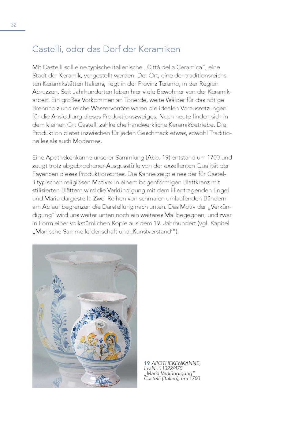 32 Castelli, oder das Dorf der Keramiken Mit Castelli soll eine typische italienische„Città della Ceramica“, eine Stadt der Keramik, vorgestellt werden. Der Ort, eine der traditionsreichsten Keramikstätten Italiens, liegt in der Provinz Teramo, in der Region Abruzzen. Seit Jahrhunderten leben hier viele Bewohner von der Keramikarbeit. Ein großes Vorkommen an Tonerde, weite Wälder für das nötige Brennholz und reiche Wasservorräte waren die idealen Voraussetzungen für die Ansiedlung dieses Produktionszweiges. Noch heute finden sich in dem kleinen Ort Castelli zahlreiche handwerkliche Keramikbetriebe. Die Produktion bietet inzwischen für jeden Geschmack etwas, sowohl Traditionelles als auch Modernes. Eine Apothekenkanne unserer Sammlung(Abb. 19) entstand um 1700 und zeugt trotz abgebrochener Ausgusstülle von der exzellenten Qualität der Fayencen dieses Produktionsortes. Die Kanne zeigt eines der für Castelli typischen religiösen Motive: In einem bogenförmigen Blattkranz mit stilisierten Blättern wird die Verkündigung mit dem lilientragenden Engel und Maria dargestellt. Zwei Reihen von schmalen umlaufenden Bändern am Ablauf begrenzen die Darstellung nach unten. Das Motiv der„Verkündigung“ wird uns weiter unten noch ein weiteres Mal begegnen, und zwar in Form einer volkstümlichen Kopie aus dem 19. Jahrhundert(vgl. Kapitel „Manische Sammelleidenschaft und ‚Kunstverstand‘“). 1 In 9 v.NAPr.O11T3H2E2K/4E7N5KANNE, „Mariä Verkündigung“ Castelli(Italien), um 1700