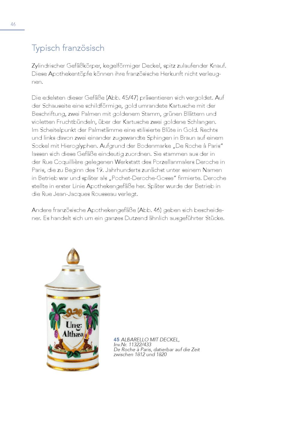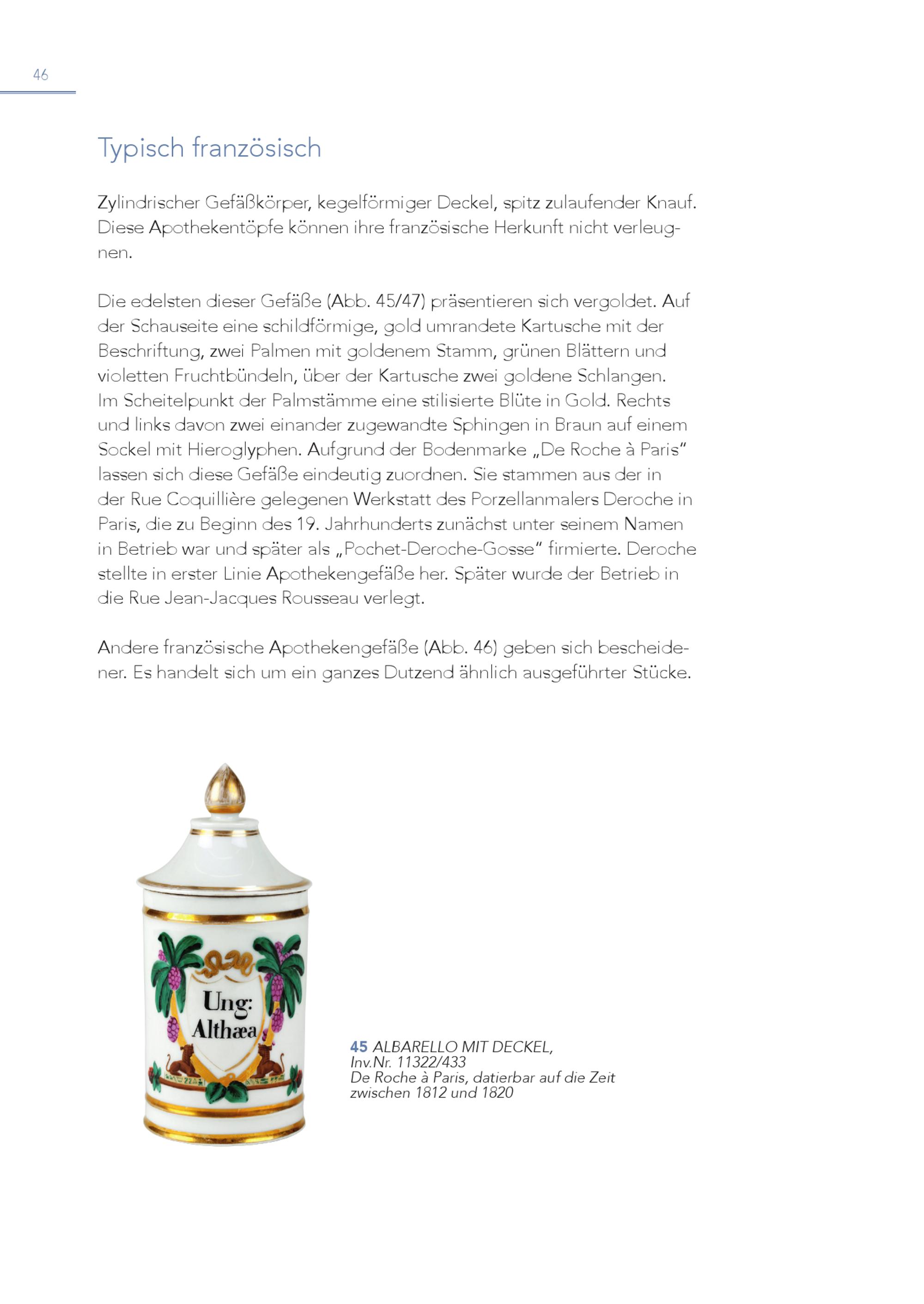 46 Typisch französisch Zylindrischer Gefäßkörper, kegelförmiger Deckel, spitz zulaufender Knauf. Diese Apothekentöpfe können ihre französische Herkunft nicht verleugnen. Die edelsten dieser Gefäße(Abb. 45/47) präsentieren sich vergoldet. Auf der Schauseite eine schildförmige, gold umrandete Kartusche mit der Beschriftung, zwei Palmen mit goldenem Stamm, grünen Blättern und violetten Fruchtbündeln, über der Kartusche zwei goldene Schlangen. Im Scheitelpunkt der Palmstämme eine stilisierte Blüte in Gold. Rechts und links davon zwei einander zugewandte Sphingen in Braun auf einem Sockel mit Hieroglyphen. Aufgrund der Bodenmarke„De Roche à Paris“ lassen sich diese Gefäße eindeutig zuordnen. Sie stammen aus der in der Rue Coquillière gelegenen Werkstatt des Porzellanmalers Deroche in Paris, die zu Beginn des 19. Jahrhunderts zunächst unter seinem Namen in Betrieb war und später als„Pochet-Deroche-Gosse“ firmierte. Deroche stellte in erster Linie Apothekengefäße her. Später wurde der Betrieb in die Rue Jean-Jacques Rousseau verlegt. Andere französische Apothekengefäße(Abb. 46) geben sich bescheidener. Es handelt sich um ein ganzes Dutzend ähnlich ausgeführter Stücke. Hier wird durch eine goldbraune Bemalung eine wesentlich kostbarere Bemalung 4 In 5 v.NALr.B1A1R32E2L/L4O33MIT DECKEL, De Roche à Paris, datierbar auf die Zeit zwischen 1812 und 1820