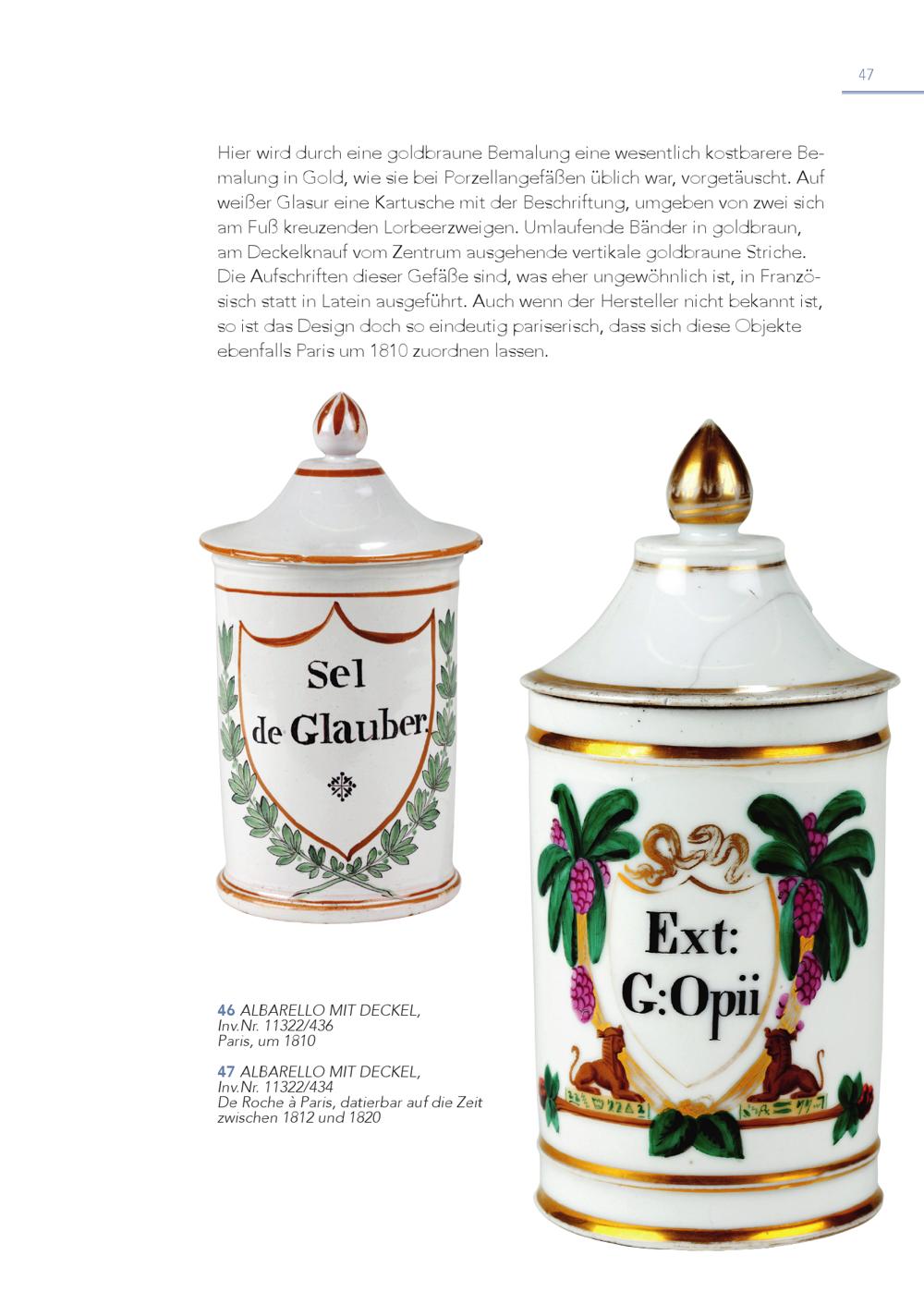 47 in Gold, wie sie bei Porzellangefäßen üblich war, vorgetäuscht. Auf weißer Glasur eine Kartusche mit der Beschriftung, umgeben von zwei sich am Fuß kreuzenden Lorbeerzweigen. Umlaufende Bänder in goldbraun, am Deckelknauf vom Zentrum ausgehende vertikale goldbraune Striche. Die Aufschriften dieser Gefäße sind, was eher ungewöhnlich ist, in Französisch statt in Latein ausgeführt. Auch wenn der Hersteller nicht bekannt ist, so ist das Design doch so eindeutig pariserisch, dass sich diese Objekte ebenfalls Paris um 1810 zuordnen lassen. 4 In 6 v.NALr.B1A1R32E2L/L4O36MIT DECKEL, Paris, um 1810 4 In 7 v.NALr.B1A1R32E2L/L4O34MIT DECKEL, De Roche à Paris, datierbar auf die Zeit zwischen 1812 und 1820
