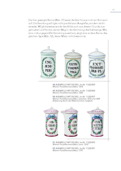49 Die hier gezeigte Kanne(Abb. 51) weist darüber hinaus noch ein Kuriosum auf: Die Bemalung erfolgte nicht parallel zum Ausgießer, sondern leicht versetzt. Möglicherweise wurde das Stück auch aus diesem Grunde ausgemustert und fand so seinen Weg in die Sammlung des Erzherzogs. Wie eine ordnungsgemäße Bemalung ausschaut, zeigt eine andere Kanne des gleichen Typs(Abb. 52), deren Maler nicht bekannt ist. 4 W 8 ieAnLeBrAPRoErzLeLlOlanMmIaTnDuEfaCkKtuEr,L1, 8In1v8.Nr. 11322/429 4 W 9 ieAnLeBrAPRoErzLeLlOlanMmIaTnDuEfaCkKtuEr,L1, 8In2v2.Nr. 11322/608 5 W 0 ieAnLeBrAPRoErzLeLlOlanMmIaTnDuEfaCkKtuEr,Lz, wInisv.cNhre.n111382122/4u5n7d 1824 (Datierung durch die Malernummer möglich) 5 W 1 ieAnLeBrAPRoErzLeLlOlanMmIaTnDuEfaCkKtuEr,Lv, eInrmv.N. 1r.81112322/493 5 W 2 ieAnLeBrAPRoErzLeLlOlanMmIaTnDuEfaCkKtuEr,L1, 7In9v7.Nr. 11322/491