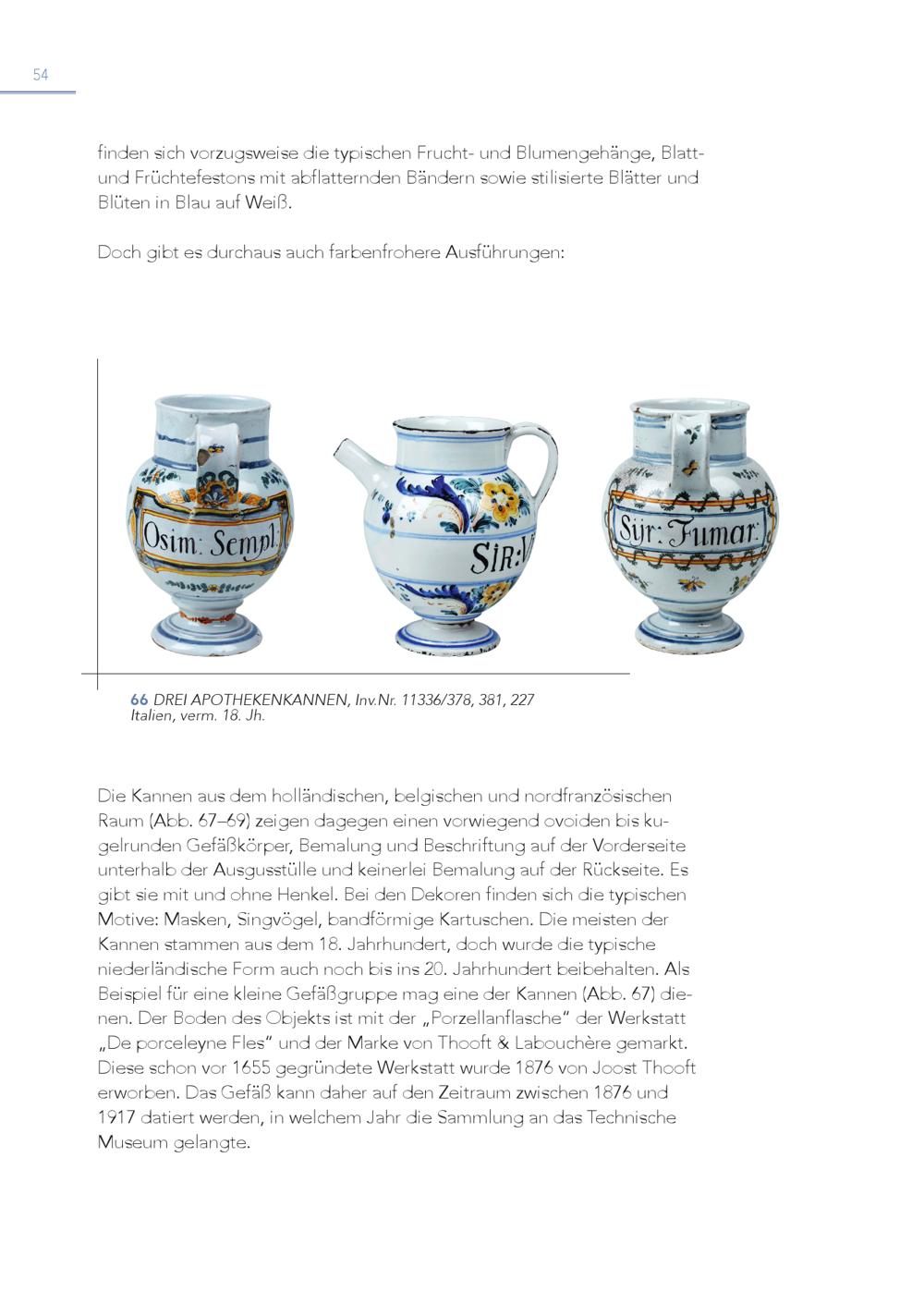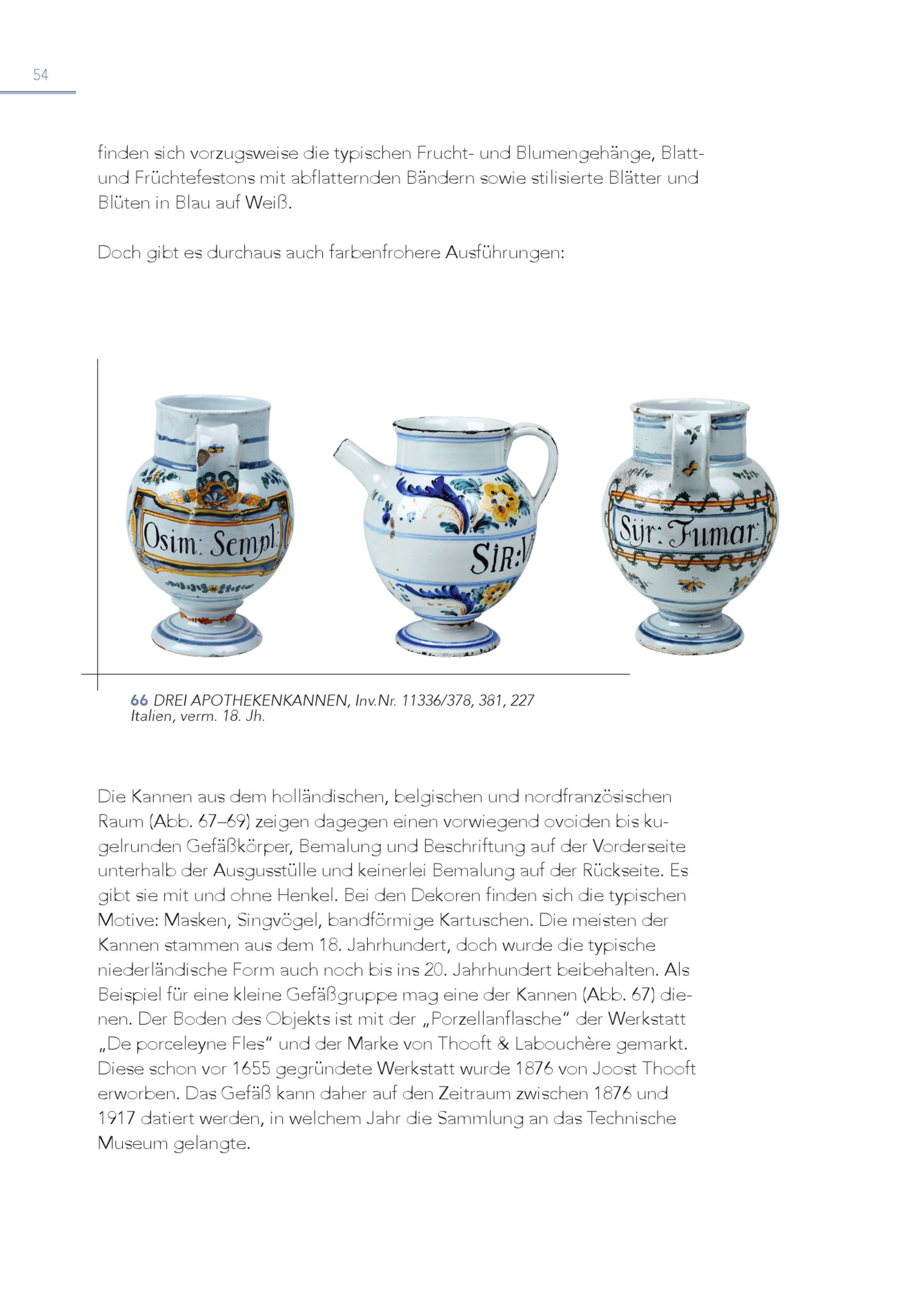 54 finden sich vorzugsweise die typischen Frucht- und Blumengehänge, Blattund Früchtefestons mit abflatternden Bändern sowie stilisierte Blätter und Blüten in Blau auf Weiß. Doch gibt es durchaus auch farbenfrohere Ausführungen: 6 It 6 aliDenR,EvIeArmPO. 1T8H.EJKhE. NKANNEN, Inv.Nr. 11336/378, 381, 227 Die Kannen aus dem holländischen, belgischen und nordfranzösischen Raum(Abb. 67–69) zeigen dagegen einen vorwiegend ovoiden bis kugelrunden Gefäßkörper, Bemalung und Beschriftung auf der Vorderseite unterhalb der Ausgusstülle und keinerlei Bemalung auf der Rückseite. Es gibt sie mit und ohne Henkel. Bei den Dekoren finden sich die typischen Motive: Masken, Singvögel, bandförmige Kartuschen. Die meisten der Kannen stammen aus dem 18. Jahrhundert, doch wurde die typische niederländische Form auch noch bis ins 20. Jahrhundert beibehalten. Als Beispiel für eine kleine Gefäßgruppe mag eine der Kannen(Abb. 67) dienen. Der Boden des Objekts ist mit der„Porzellanflasche“ der Werkstatt„De porceleyne Fles“ und der Marke von Thooft& Labouchère gemarkt. Diese schon vor 1655 gegründete Werkstatt wurde 1876 von Joost Thooft erworben. Das Gefäß kann daher auf den Zeitraum zwischen 1876 und 1917 datiert werden, in welchem Jahr die Sammlung an das Technische Museum gelangte.