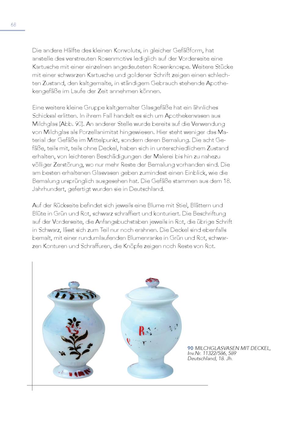 68 Die andere Hälfte des kleinen Konvoluts, in gleicher Gefäßform, hat anstelle des verstreuten Rosenmotivs lediglich auf der Vorderseite eine Kartusche mit einer einzelnen angedeuteten Rosenknospe. Weitere Stücke mit einer schwarzen Kartusche und goldener Schrift zeigen einen schlechten Zustand, den kaltgemalte, in ständigem Gebrauch stehende Apothekengefäße im Laufe der Zeit annehmen können. Eine weitere kleine Gruppe kaltgemalter Glasgefäße hat ein ähnliches Schicksal erlitten. In ihrem Fall handelt es sich um Apothekenvasen aus Milchglas(Abb. 90). An anderer Stelle wurde bereits auf die Verwendung von Milchglas als Porzellanimitat hingewiesen. Hier steht weniger das Material der Gefäße im Mittelpunkt, sondern deren Bemalung. Die acht Gefäße, teils mit, teils ohne Deckel, haben sich in unterschiedlichem Zustand erhalten, von leichteren Beschädigungen der Malerei bis hin zu nahezu völliger Zerstörung, wo nur mehr Reste der Bemalung vorhanden sind. Die am besten erhaltenen Glasvasen geben zumindest einen Einblick, wie die Bemalung ursprünglich ausgesehen hat. Die Gefäße stammen aus dem 18. Jahrhundert, gefertigt wurden sie in Deutschland. Auf der Rückseite befindet sich jeweils eine Blume mit Stiel, Blättern und Blüte in Grün und Rot, schwarz schraffiert und konturiert. Die Beschriftung auf der Vorderseite, die Anfangsbuchstaben jeweils in Rot, die übrige Schrift in Schwarz, lässt sich zum Teil nur noch erahnen. Die Deckel sind ebenfalls bemalt, mit einer rundumlaufenden Blumenranke in Grün und Rot, schwarzen Konturen und Schraffuren, die Knöpfe zeigen noch Reste von Rot. 9 In 0 v.MNrI.L1C1H3G22L/A58S6V,A5S8E9N MIT DECKEL, Deutschland, 18. Jh.