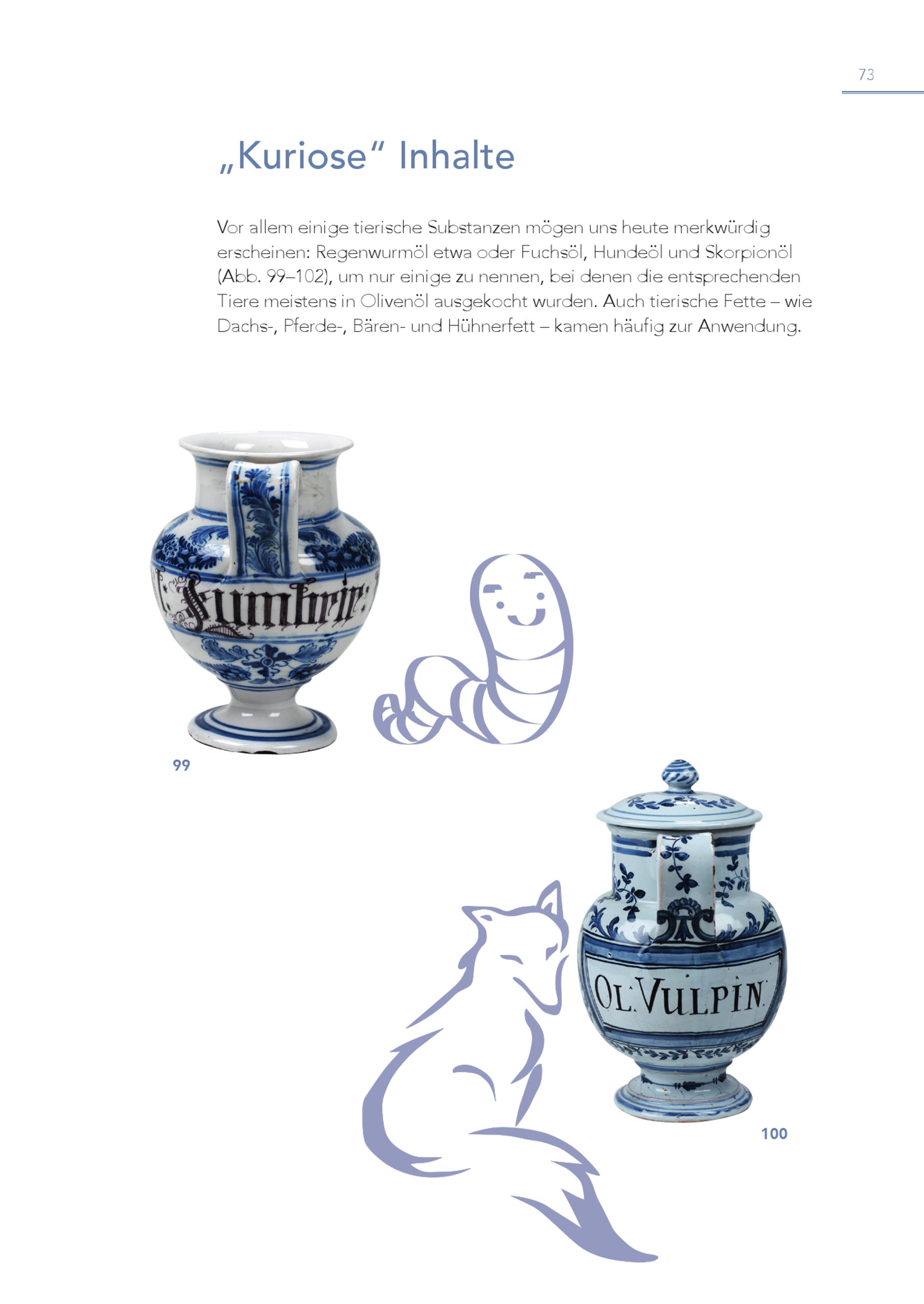 „Kuriose“ Inhalte 73 Vor allem einige tierische Substanzen mögen uns heute merkwürdig erscheinen: Regenwurmöl etwa oder Fuchsöl, Hundeöl und Skorpionöl (Abb. 99–102), um nur einige zu nennen, bei denen die entsprechenden Tiere meistens in Olivenöl ausgekocht wurden. Auch tierische Fette – wie Dachs-, Pferde-, Bären- und Hühnerfett – kamen häufig zur Anwendung. 99 100
