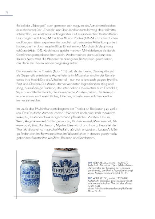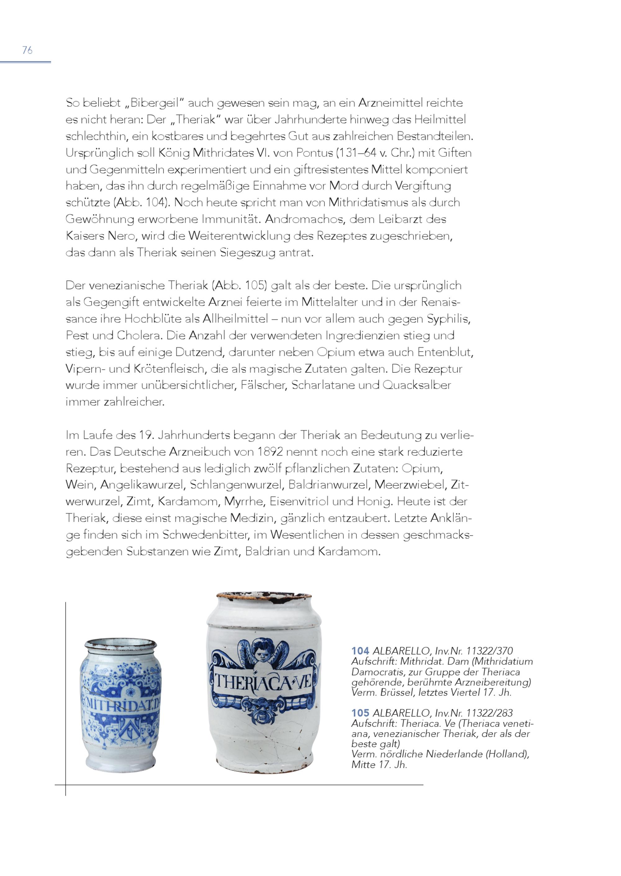 76 So beliebt„Bibergeil“ auch gewesen sein mag, an ein Arzneimittel reichte es nicht heran: Der„Theriak“ war über Jahrhunderte hinweg das Heilmittel schlechthin, ein kostbares und begehrtes Gut aus zahlreichen Bestandteilen. Ursprünglich soll König Mithridates VI. von Pontus(131–64 v. Chr.) mit Giften und Gegenmitteln experimentiert und ein giftresistentes Mittel komponiert haben, das ihn durch regelmäßige Einnahme vor Mord durch Vergiftung schützte(Abb. 104). Noch heute spricht man von Mithridatismus als durch Gewöhnung erworbene Immunität. Andromachos, dem Leibarzt des Kaisers Nero, wird die Weiterentwicklung des Rezeptes zugeschrieben, das dann als Theriak seinen Siegeszug antrat. Der venezianische Theriak(Abb. 105) galt als der beste. Die ursprünglich als Gegengift entwickelte Arznei feierte im Mittelalter und in der Renaissance ihre Hochblüte als Allheilmittel – nun vor allem auch gegen Syphilis, Pest und Cholera. Die Anzahl der verwendeten Ingredienzien stieg und stieg, bis auf einige Dutzend, darunter neben Opium etwa auch Entenblut, Vipern- und Krötenfleisch, die als magische Zutaten galten. Die Rezeptur wurde immer unübersichtlicher, Fälscher, Scharlatane und Quacksalber immer zahlreicher. Im Laufe des 19. Jahrhunderts begann der Theriak an Bedeutung zu verlieren. Das Deutsche Arzneibuch von 1892 nennt noch eine stark reduzierte Rezeptur, bestehend aus lediglich zwölf pflanzlichen Zutaten: Opium, Wein, Angelikawurzel, Schlangenwurzel, Baldrianwurzel, Meerzwiebel, Zitwerwurzel, Zimt, Kardamom, Myrrhe, Eisenvitriol und Honig. Heute ist der Theriak, diese einst magische Medizin, gänzlich entzaubert. Letzte Anklänge finden sich im Schwedenbitter, im Wesentlichen in dessen geschmacksgebenden Substanzen wie Zimt, Baldrian und Kardamom. 1 A 0 u 4 fscAhLrBiftA: RMEiLthLrOid,aInt.vD.Narm. 11(M32it2h/r3id70atium Damocratis, zur Gruppe der Theriaca gehörende, berühmte Arzneibereitung) Verm. Brüssel, letztes Viertel 17. Jh. 1 A 0 u 5 fscAhLrBiftA: RTEhLeLriOac, aIn. vV.eNr(.T1h1e3ri2a2c/a28v3enetiana, venezianischer Theriak, der als der beste galt) Verm. nördliche Niederlande(Holland), Mitte 17. Jh.