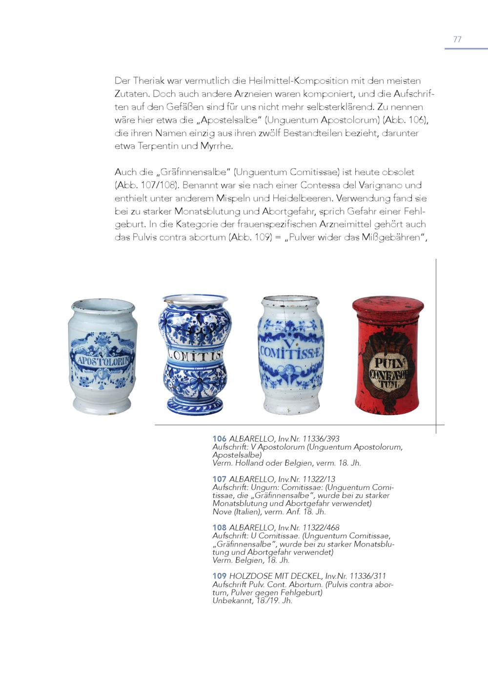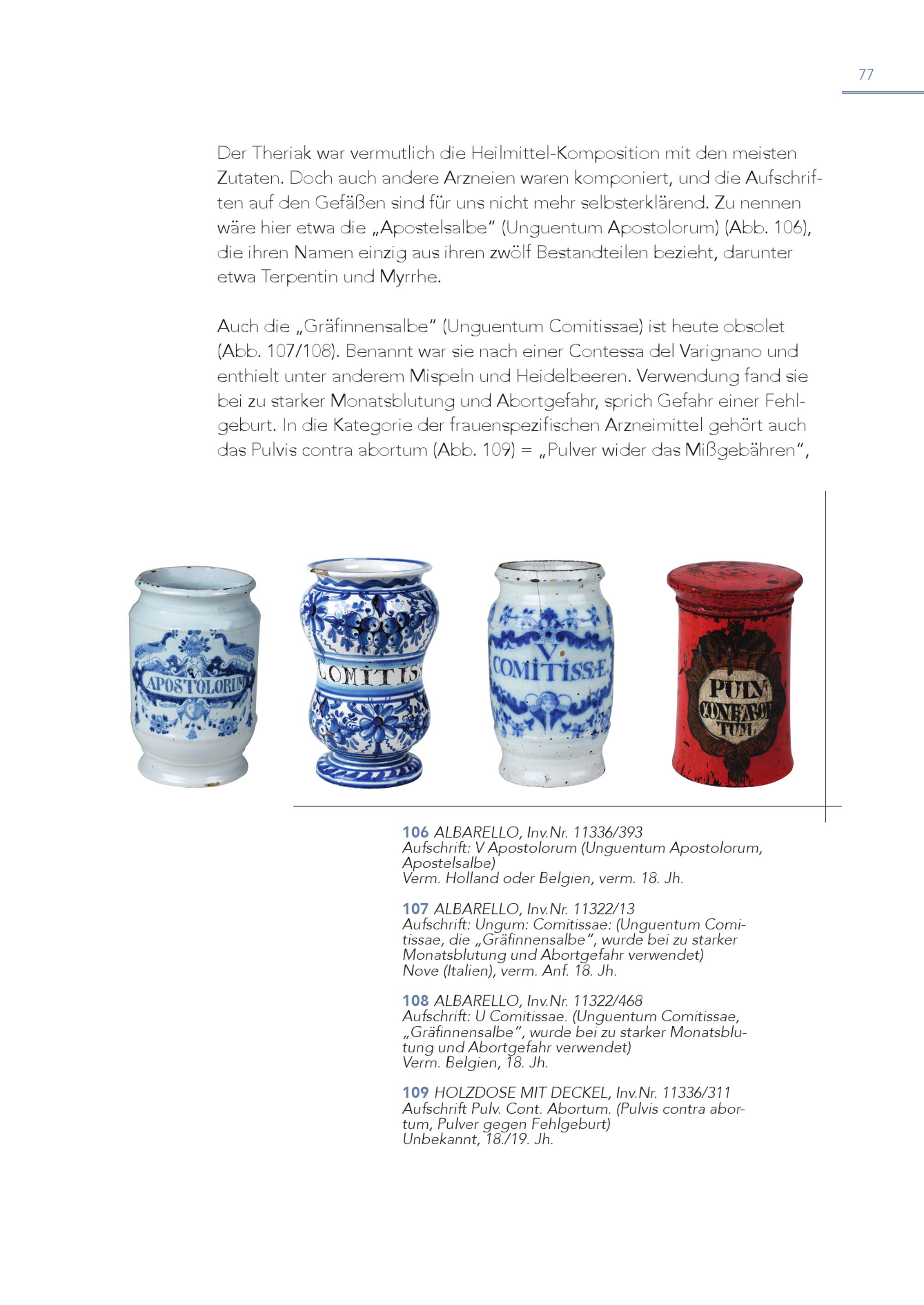 77 Der Theriak war vermutlich die Heilmittel-Komposition mit den meisten Zutaten. Doch auch andere Arzneien waren komponiert, und die Aufschriften auf den Gefäßen sind für uns nicht mehr selbsterklärend. Zu nennen wäre hier etwa die„Apostelsalbe“(Unguentum Apostolorum)(Abb. 106), die ihren Namen einzig aus ihren zwölf Bestandteilen bezieht, darunter etwa Terpentin und Myrrhe. Auch die„Gräfinnensalbe“(Unguentum Comitissae) ist heute obsolet(Abb. 107/108). Benannt war sie nach einer Contessa del Varignano und enthielt unter anderem Mispeln und Heidelbeeren. Verwendung fand sie bei zu starker Monatsblutung und Abortgefahr, sprich Gefahr einer Fehlgeburt. In die Kategorie der frauenspezifischen Arzneimittel gehört auch das Pulvis contra abortum(Abb. 109)=„Pulver wider das Mißgebähren“, wie es in der 1 A 0 u 6 fscAhLrBiftA: RVEALpLOos,tIonlvo.Nrurm. 11(U3n3g6/u3e9n3tum Apostolorum, Apostelsalbe) Verm. Holland oder Belgien, verm. 18. Jh. 1 A 0 u 7 fscAhLrBiftA: RUEnLgLuOm, :InCvo.Nmr.it1is1s3a2e2:/(1U3nguentum Comitissae, die„Gräfinnensalbe“, wurde bei zu starker Monatsblutung und Abortgefahr verwendet) Nove(Italien), verm. Anf. 18. Jh. 1 A 0 u 8 fscAhLrBiftA: RUECLLoOm,itInisvs.aNer.. 11322/468 (Unguentum Comitissae, „Gräfinnensalbe“, wurde bei zu starker Monatsblu tung und Abortgefahr verwendet) Verm. Belgien, 18. Jh. 1 A 0 u 9 fscHhOrifLtZPDuOlv.SCEoMnItT. ADbEoCrtKuEmL,. Inv.Nr. (Pulvis 11336/311 contra abortum, Pulver gegen Fehlgeburt) Unbekannt, 18./19. Jh.