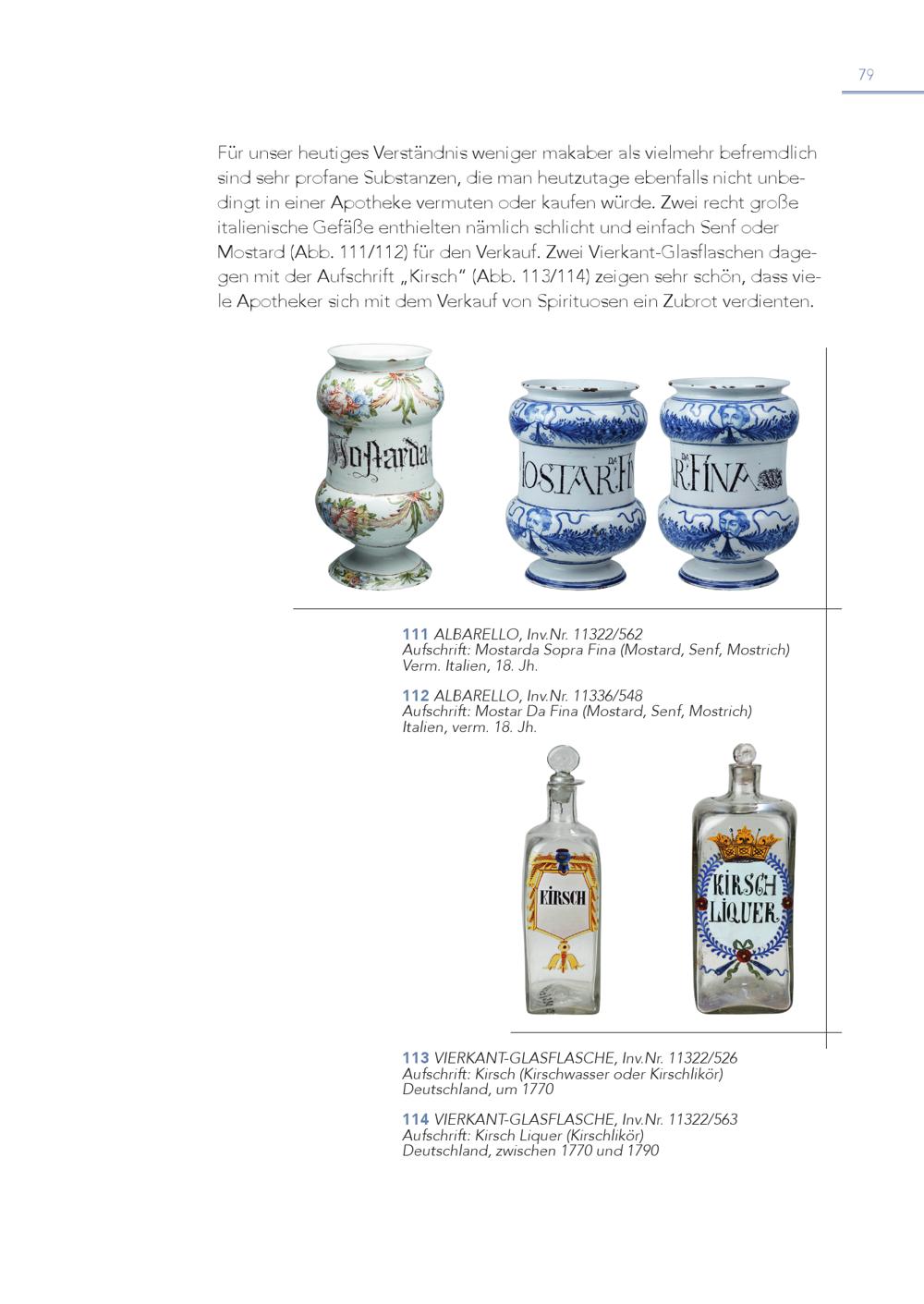 79 Für unser heutiges Verständnis weniger makaber als vielmehr befremdlich sind sehr profane Substanzen, die man heutzutage ebenfalls nicht unbedingt in einer Apotheke vermuten oder kaufen würde. Zwei recht große italienische Gefäße enthielten nämlich schlicht und einfach Senf oder Mostard(Abb. 111/112) für den Verkauf. Zwei Vierkant-Glasflaschen dagegen mit der Aufschrift„Kirsch“(Abb. 113/114) zeigen sehr schön, dass viele Apotheker sich mit dem Verkauf von Spirituosen ein Zubrot verdienten. 1 A 1 u 1 fscAhLrBiftA: RMEoLsLtOar,dInavS.Nopr.r1a1F3i2n2a/5(M62ostard, Senf, Mostrich) Verm. Italien, 18. Jh. 1 A 1 u 2 fscAhLrBiftA: RMEoLsLtOar, Inv.Nr. 11336/548 Da Fina(Mostard, Senf, Mostrich) Italien, verm. 18. Jh. 1 A 1 u 3 fscVhIEriRftK: AKiNrsTc-hG(LKAirSsFchLwASasCsHerEo, Idnevr.NKri.rs1c1h3l2ik2ö/5r)26 Deutschland, um 1770 1 A 1 u 4 fscVhIEriRftK: AKiNrsTc-hGLLiAqSuFeLr A(KSiCrsHchEl,ikIönvr).Nr. 11322/563 Deutschland, zwischen 1770 und 1790