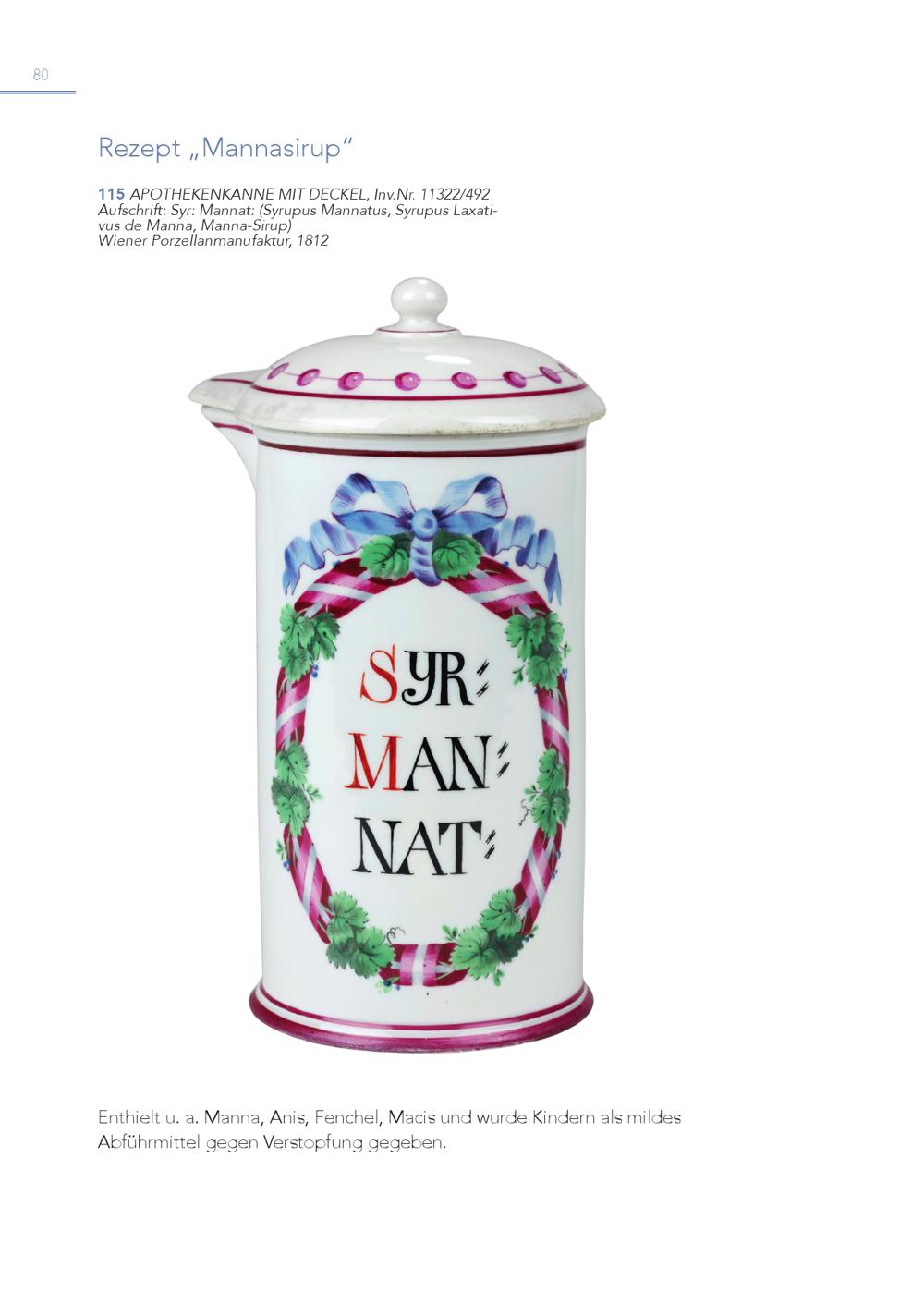 80 Rezept„Mannasirup“ 1 A 1 u 5 fscAhPrOiftT: SHyErK: MENanKnAaNt:N(SEyMruIpTuDs EMCaKnEnLa,tuInsv,.SNyrr.u1p1u3s22L/a4x9a2tivus de Manna, Manna-Sirup) Wiener Porzellanmanufaktur, 1812 Enthielt u. a. Manna, Anis, Fenchel, Macis und wurde Kindern als mildes Abführmittel gegen Verstopfung gegeben.