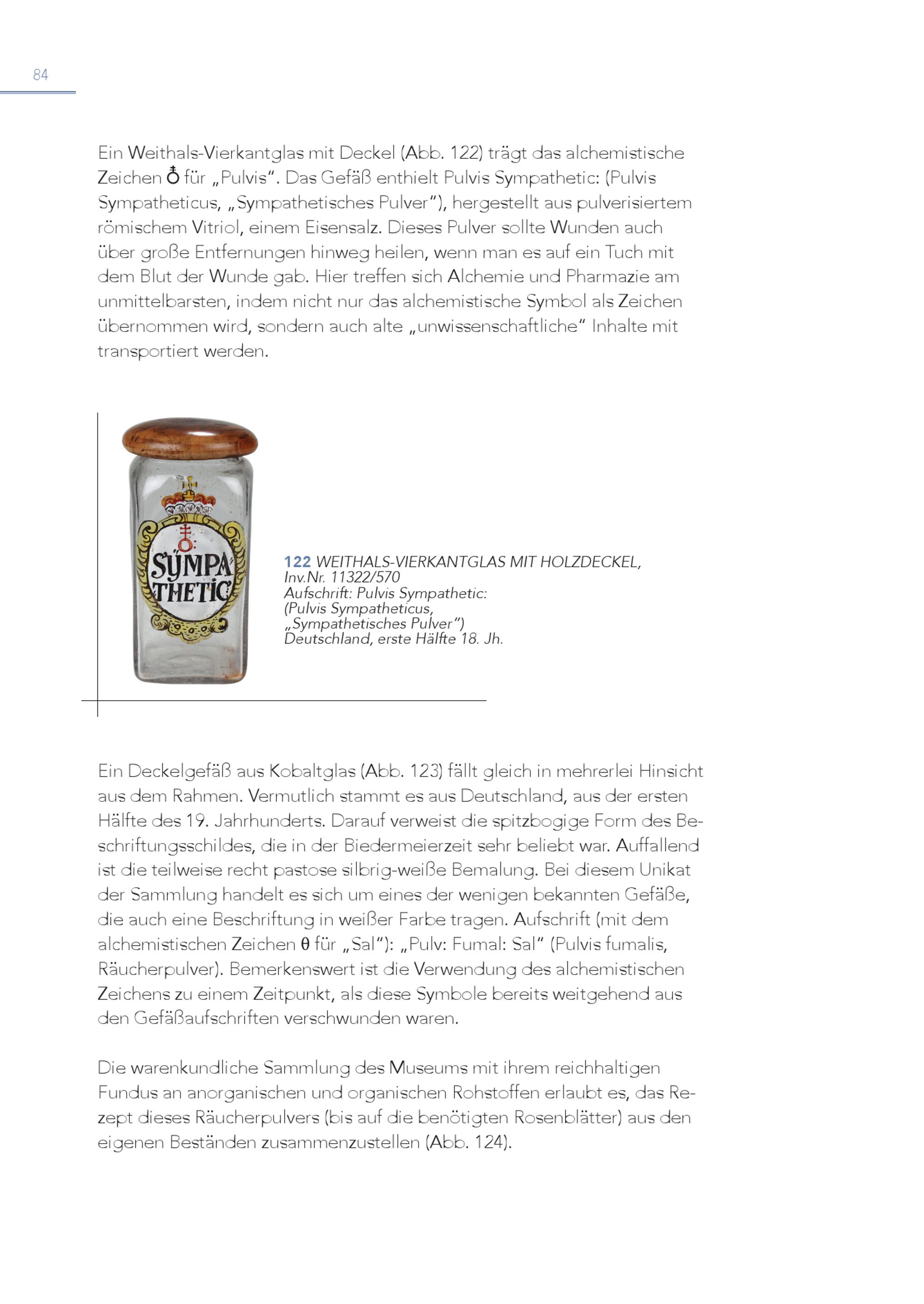 84 Ein Weithals-Vierkantglas mit Deckel(Abb. 122) trägt das alchemistische Zeichen für„Pulvis“. Das Gefäß enthielt Pulvis Sympathetic:(Pulvis Sympatheticus,„Sympathetisches Pulver“), hergestellt aus pulverisiertem römischem Vitriol, einem Eisensalz. Dieses Pulver sollte Wunden auch über große Entfernungen hinweg heilen, wenn man es auf ein Tuch mit dem Blut der Wunde gab. Hier treffen sich Alchemie und Pharmazie am unmittelbarsten, indem nicht nur das alchemistische Symbol als Zeichen übernommen wird, sondern auch alte„unwissenschaftliche“ Inhalte mit transportiert werden. 1 In 2 v 2 .N W r. 1 E 1 IT 3 H 22 A / L 5 S 7 0 VIERKANTGLAS MIT HOLZDECKEL, Aufschrift: Pulvis Sympathetic: (Pulvis Sympatheticus, „Sympathetisches Pulver“) Deutschland, erste Hälfte 18. Jh. Ein Deckelgefäß aus Kobaltglas(Abb. 123) fällt gleich in mehrerlei Hinsicht aus dem Rahmen. Vermutlich stammt es aus Deutschland, aus der ersten Hälfte des 19. Jahrhunderts. Darauf verweist die spitzbogige Form des Beschriftungsschildes, die in der Biedermeierzeit sehr beliebt war. Auffallend ist die teilweise recht pastose silbrig-weiße Bemalung. Bei diesem Unikat der Sammlung handelt es sich um eines der wenigen bekannten Gefäße, die auch eine Beschriftung in weißer Farbe tragen. Aufschrift(mit dem alchemistischen Zeichen θ für„Sal“):„Pulv: Fumal: Sal“(Pulvis fumalis, Räucherpulver). Bemerkenswert ist die Verwendung des alchemistischen Zeichens zu einem Zeitpunkt, als diese Symbole bereits weitgehend aus den Gefäßaufschriften verschwunden waren. Die warenkundliche Sammlung des Museums mit ihrem reichhaltigen Fundus an anorganischen und organischen Rohstoffen erlaubt es, das Rezept dieses Räucherpulvers(bis auf die benötigten Rosenblätter) aus den eigenen Beständen zusammenzustellen(Abb. 124).