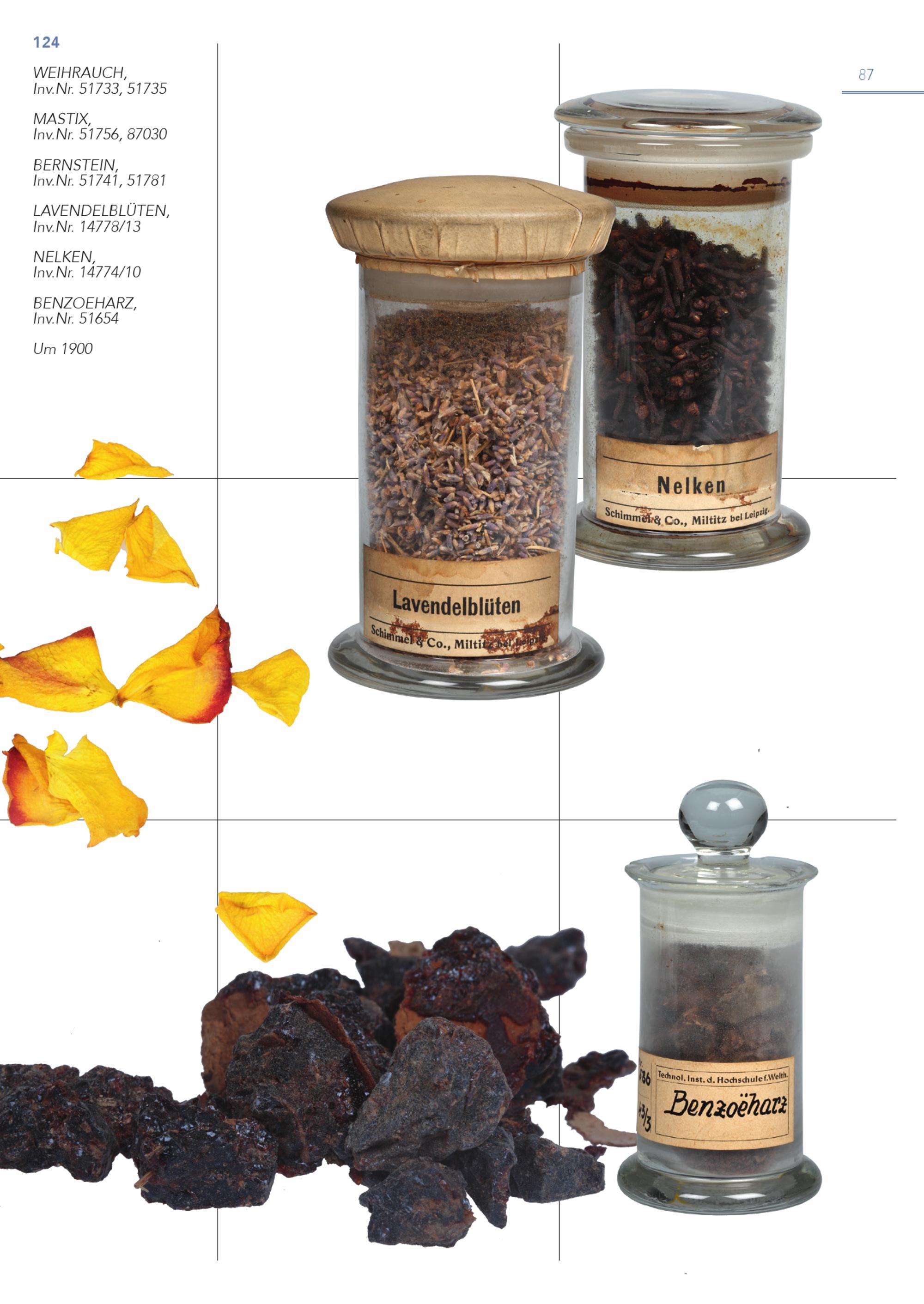 124 WEIHRAUCH, Inv.Nr. 51733, 51735 MASTIX, Inv.Nr. 51756, 87030 BERNSTEIN, Inv.Nr. 51741, 51781 LAVENDELBLÜTEN, Inv.Nr. 14778/13 NELKEN, Inv.Nr. 14774/10 BENZOEHARZ, Inv.Nr. 51654 Um 1900 87