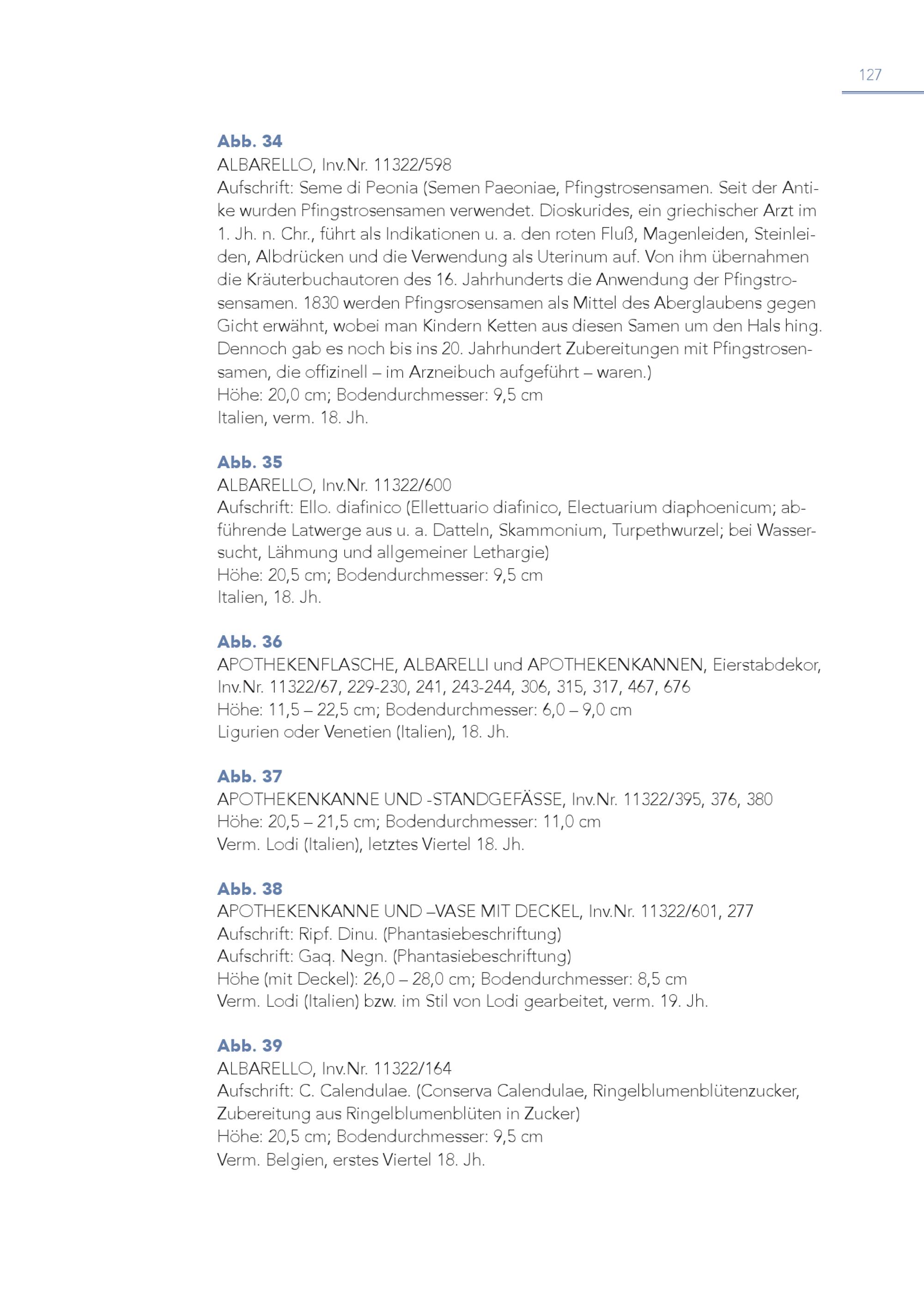 127 Abb. 34 ALBARELLO , Inv.Nr. 11322/598 Aufschrift: Seme di Peonia(Semen Paeoniae, Pfingstrosensamen. Seit der Antike wurden Pfingstrosensamen verwendet. Dioskurides, ein griechischer Arzt im 1. Jh. n. Chr., führt als Indikationen u. a. den roten Fluß, Magenleiden, Steinleiden, Albdrücken und die Verwendung als Uterinum auf. Von ihm übernahmen die Kräuterbuchautoren des 16. Jahrhunderts die Anwendung der Pfingstrosensamen. 1830 werden Pfingsrosensamen als Mittel des Aberglaubens gegen Gicht erwähnt, wobei man Kindern Ketten aus diesen Samen um den Hals hing. Dennoch gab es noch bis ins 20. Jahrhundert Zubereitungen mit Pfingstrosensamen, die offizinell – im Arzneibuch aufgeführt – waren.) Höhe: 20,0 cm; Bodendurchmesser: 9,5 cm Italien, verm. 18. Jh. Abb. 35 ALBARELLO , Inv.Nr. 11322/600 Aufschrift: Ello. diafinico(Ellettuario diafinico, Electuarium diaphoenicum; abführende Latwerge aus u. a. Datteln, Skammonium, Turpethwurzel; bei Wassersucht, Lähmung und allgemeiner Lethargie) Höhe: 20,5 cm; Bodendurchmesser: 9,5 cm Italien, 18. Jh. Abb. 36 APOTHEKENFLASCHE , ALBARELLI und APOTHEKENKANNEN , Eierstabdekor, Inv.Nr. 11322/67, 229-230, 241, 243-244, 306, 315, 317, 467, 676 Höhe: 11,5 – 22,5 cm; Bodendurchmesser: 6,0 – 9,0 cm Ligurien oder Venetien(Italien), 18. Jh. Abb. 37 APOTHEKENKANNE UND-STANDGEFÄSSE , Inv.Nr. 11322/395, 376, 380 Höhe: 20,5 – 21,5 cm; Bodendurchmesser: 11,0 cm Verm. Lodi(Italien), letztes Viertel 18. Jh. Abb. 38 APOTHEKENKANNE UND –VASE MIT DECKEL , Inv.Nr. 11322/601, 277 Aufschrift: Ripf. Dinu.(Phantasiebeschriftung) Aufschrift: Gaq. Negn.(Phantasiebeschriftung) Höhe(mit Deckel): 26,0 – 28,0 cm; Bodendurchmesser: 8,5 cm Verm. Lodi(Italien) bzw. im Stil von Lodi gearbeitet, verm. 19. Jh. Abb. 39 ALBARELLO , Inv.Nr. 11322/164 Aufschrift: C. Calendulae.(Conserva Calendulae, Ringelblumenblütenzucker, Zubereitung aus Ringelblumenblüten in Zucker) Höhe: 20,5 cm; Bodendurchmesser: 9,5 cm Verm. Belgien, erstes Viertel 18. Jh.