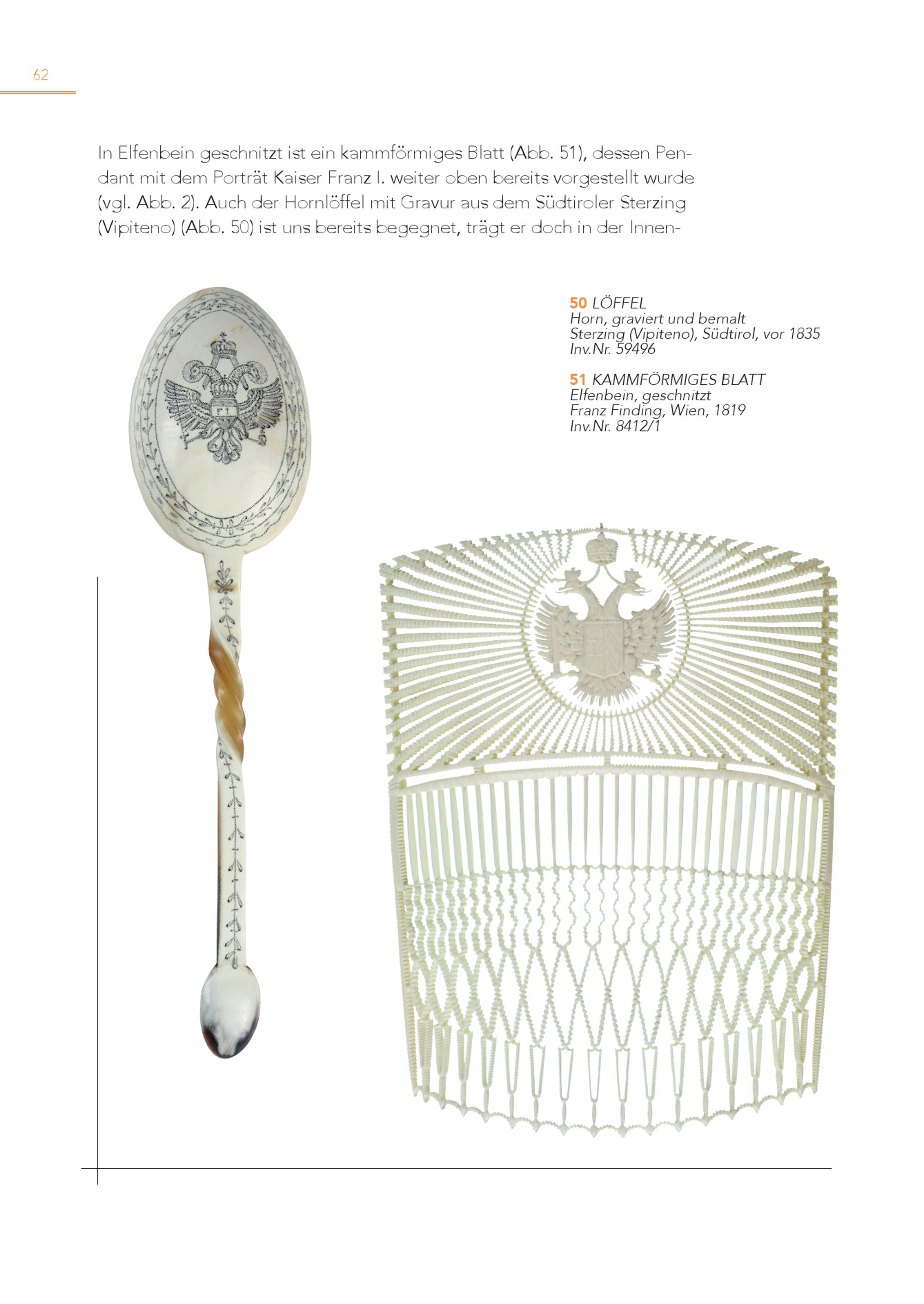 62 In Elfenbein geschnitzt ist ein kammförmiges Blatt(Abb. 51), dessen Pen dant mit dem Porträt Kaiser Franz I. weiter oben bereits vorgestellt wurde (vgl. Abb. 2). Auch der Hornlöffel mit Gravur aus dem Südtiroler Sterzing (Vipiteno)(Abb. 50) ist uns bereits begegnet, trägt er doch in der Innen 5 H 0 orLnÖ, gFFraEvLiert und bemalt Sterzing(Vipiteno), Südtirol, vor 1835 Inv.Nr. 59496 5 E 1 lfeKnAbMeiMn,FgÖesRcMhnIGitEztS BLATT Franz Finding, Wien, 1819 Inv.Nr. 8412/1