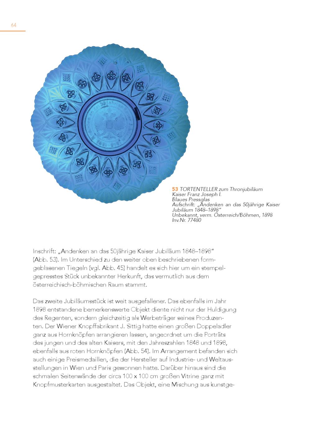 64 5 K 3 aisTeOr RFTraEnNzTJEoLseLEpRh zum I. Thronjubiläum Blaues Pressglas Aufschrift:„Andenken an das 50jährige Kaiser Jubiläum 1848–1898“ Unbekannt, verm. Österreich/Böhmen, 1898 Inv.Nr. 77480 Inschrift:„Andenken an das 50jährige Kaiser Jubiläum 1848–1898“ (Abb. 53). Im Unterschied zu den weiter oben beschriebenen formgeblasenen Tiegeln(vgl. Abb. 45) handelt es sich hier um ein stempelgepresstes Stück unbekannter Herkunft, das vermutlich aus dem österreichisch-böhmischen Raum stammt. Das zweite Jubiläumsstück ist weit ausgefallener. Das ebenfalls im Jahr 1898 entstandene bemerkenswerte Objekt diente nicht nur der Huldigung des Regenten, sondern gleichzeitig als Werbeträger seines Produzen ten. Der Wiener Knopffabrikant J. Sittig hatte einen großen Doppeladler ganz aus Hornknöpfen arrangieren lassen, angeordnet um die Porträts des jungen und des alten Kaisers, mit den Jahreszahlen 1848 und 1898, ebenfalls aus roten Hornknöpfen(Abb. 54). Im Arrangement befanden sich auch einige Preismedaillen, die der Hersteller auf Industrie- und Weltaus stellungen in Wien und Paris gewonnen hatte. Darüber hinaus sind die schmalen Seitenwände der circa 100 x 100 cm großen Vitrine ganz mit Knopfmusterkarten ausgestaltet. Das Objekt, eine Mischung aus kunstge -