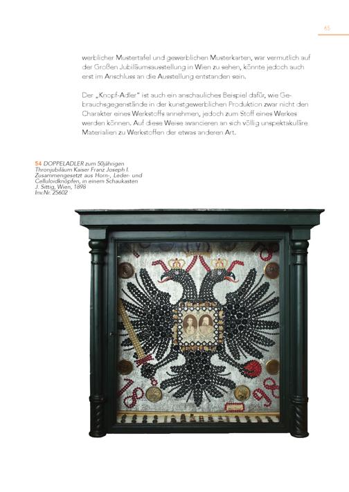 65 werblicher Mustertafel und gewerblichen Musterkarten, war vermutlich auf der Großen Jubiläumsausstellung in Wien zu sehen, könnte jedoch auch erst im Anschluss an die Ausstellung entstanden sein. Der„Knopf-Adler“ ist auch ein anschauliches Beispiel dafür, wie Ge brauchsgegenstände in der kunstgewerblichen Produktion zwar nicht den Charakter eines Werkstoffs annehmen, jedoch zum Stoff eines Werkes werden können. Auf diese Weise avancieren an sich völlig unspektakuläre Materialien zu Werkstoffen der etwas anderen Art. 5 Th 4 roDnOjuPbPiEläLuAmDKLEaiRsezruFmra5n0zjäJhorsigeepnh I. Zusammengesetzt aus Horn-, Leder- und Celluloidknöpfen, in einem Schaukasten J. Sittig, Wien, 1898 Inv.Nr. 25602