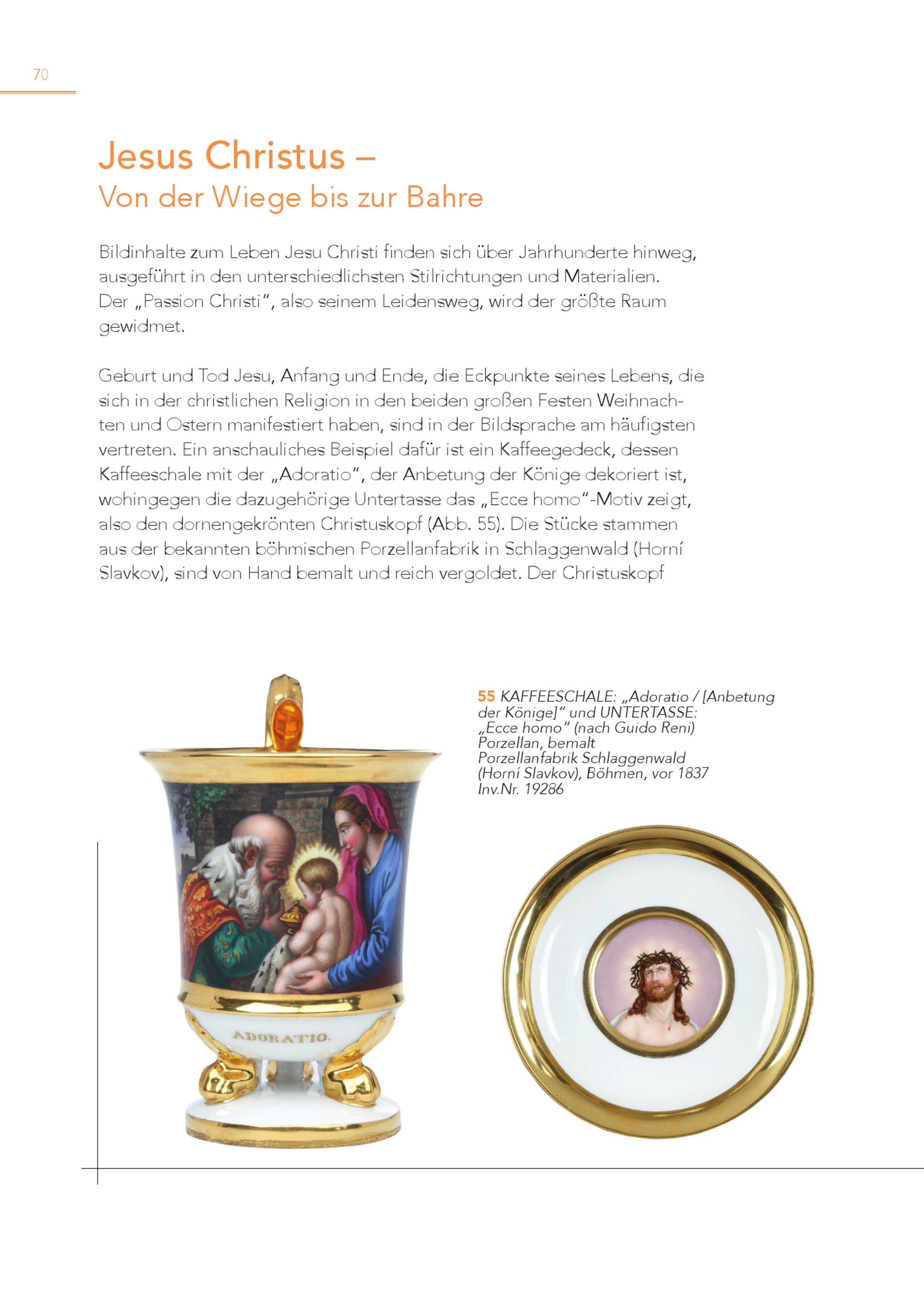 70 Jesus Christus – Von der Wiege bis zur Bahre Bildinhalte zum Leben Jesu Christi finden sich über Jahrhunderte hinweg, ausgeführt in den unterschiedlichsten Stilrichtungen und Materialien. Der„Passion Christi“, also seinem Leidensweg, wird der größte Raum gewidmet. Geburt und Tod Jesu, Anfang und Ende, die Eckpunkte seines Lebens, die sich in der christlichen Religion in den beiden großen Festen Weihnachten und Ostern manifestiert haben, sind in der Bildsprache am häufigsten vertreten. Ein anschauliches Beispiel dafür ist ein Kaffeegedeck, dessen Kaffeeschale mit der„Adoratio“, der Anbetung der Könige dekoriert ist, wohingegen die dazugehörige Untertasse das„Ecce homo“-Motiv zeigt, also den dornengekrönten Christuskopf(Abb. 55). Die Stücke stammen aus der bekannten böhmischen Porzellanfabrik in Schlaggenwald(Horní Slavkov), sind von Hand bemalt und reich vergoldet. Der Christuskopf 5 d 5 erKKAöFnFigEeE]S“CuHnAdLUEN: „TAEdRoTAraStSioE/:[Anbetung „Ecce homo“(nach Guido Reni) Porzellan, bemalt Porzellanfabrik Schlaggenwald (Horní Slavkov), Böhmen, vor 1837 Inv.Nr. 19286