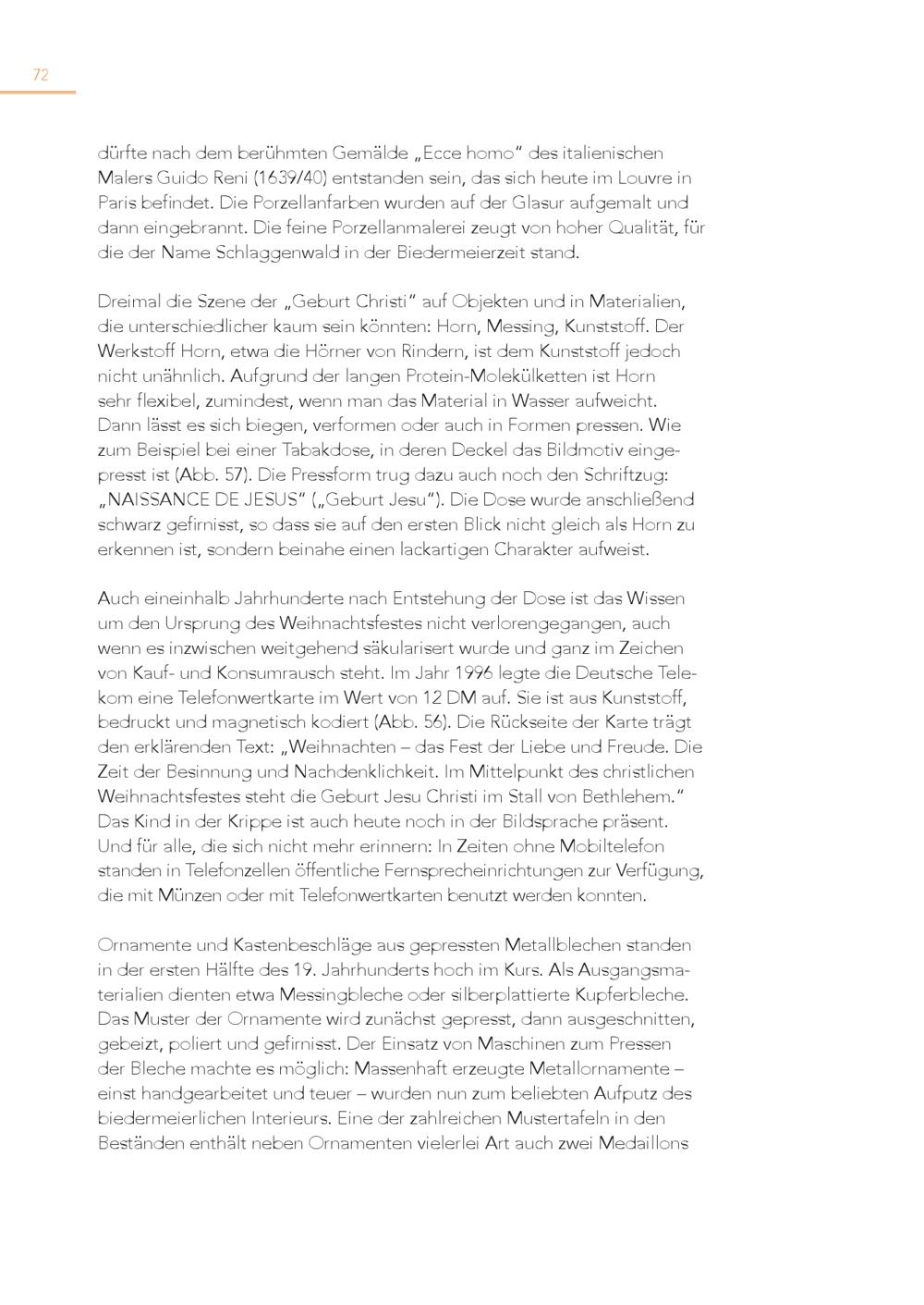 72 dürfte nach dem berühmten Gemälde„Ecce homo“ des italienischen Malers Guido Reni(1639/40) entstanden sein, das sich heute im Louvre in Paris befindet. Die Porzellanfarben wurden auf der Glasur aufgemalt und dann eingebrannt. Die feine Porzellanmalerei zeugt von hoher Qualität, für die der Name Schlaggenwald in der Biedermeierzeit stand. Dreimal die Szene der„Geburt Christi“ auf Objekten und in Materialien, die unterschiedlicher kaum sein könnten: Horn, Messing, Kunststoff. Der Werkstoff Horn, etwa die Hörner von Rindern, ist dem Kunststoff jedoch nicht unähnlich. Aufgrund der langen Protein-Molekülketten ist Horn sehr flexibel, zumindest, wenn man das Material in Wasser aufweicht. Dann lässt es sich biegen, verformen oder auch in Formen pressen. Wie zum Beispiel bei einer Tabakdose, in deren Deckel das Bildmotiv eingepresst ist(Abb. 57). Die Pressform trug dazu auch noch den Schriftzug: „NAISSANCE DE JESUS“(„Geburt Jesu“). Die Dose wurde anschließend schwarz gefirnisst, so dass sie auf den ersten Blick nicht gleich als Horn zu erkennen ist, sondern beinahe einen lackartigen Charakter aufweist. Auch eineinhalb Jahrhunderte nach Entstehung der Dose ist das Wissen um den Ursprung des Weihnachtsfestes nicht verlorengegangen, auch wenn es inzwischen weitgehend säkularisert wurde und ganz im Zeichen von Kauf- und Konsumrausch steht. Im Jahr 1996 legte die Deutsche Telekom eine Telefonwertkarte im Wert von 12 DM auf. Sie ist aus Kunststoff, bedruckt und magnetisch kodiert(Abb. 56). Die Rückseite der Karte trägt den erklärenden Text:„Weihnachten – das Fest der Liebe und Freude. Die Zeit der Besinnung und Nachdenklichkeit. Im Mittelpunkt des christlichen Weihnachtsfestes steht die Geburt Jesu Christi im Stall von Bethlehem.“ Das Kind in der Krippe ist auch heute noch in der Bildsprache präsent. Und für alle, die sich nicht mehr erinnern: In Zeiten ohne Mobiltelefon standen in Telefonzellen öffentliche Fernsprecheinrichtungen zur Verfügung, die mit Münzen oder mit Telefonwertkarten benutzt werden konnten. Ornamente und Kastenbeschläge aus gepressten Metallblechen standen in der ersten Hälfte des 19. Jahrhunderts hoch im Kurs. Als Ausgangsmaterialien dienten etwa Messingbleche oder silberplattierte Kupferbleche. Das Muster der Ornamente wird zunächst gepresst, dann ausgeschnitten, gebeizt, poliert und gefirnisst. Der Einsatz von Maschinen zum Pressen der Bleche machte es möglich: Massenhaft erzeugte Metallornamente – einst handgearbeitet und teuer – wurden nun zum beliebten Aufputz des biedermeierlichen Interieurs. Eine der zahlreichen Mustertafeln in den Beständen enthält neben Ornamenten vielerlei Art auch zwei Medaillons