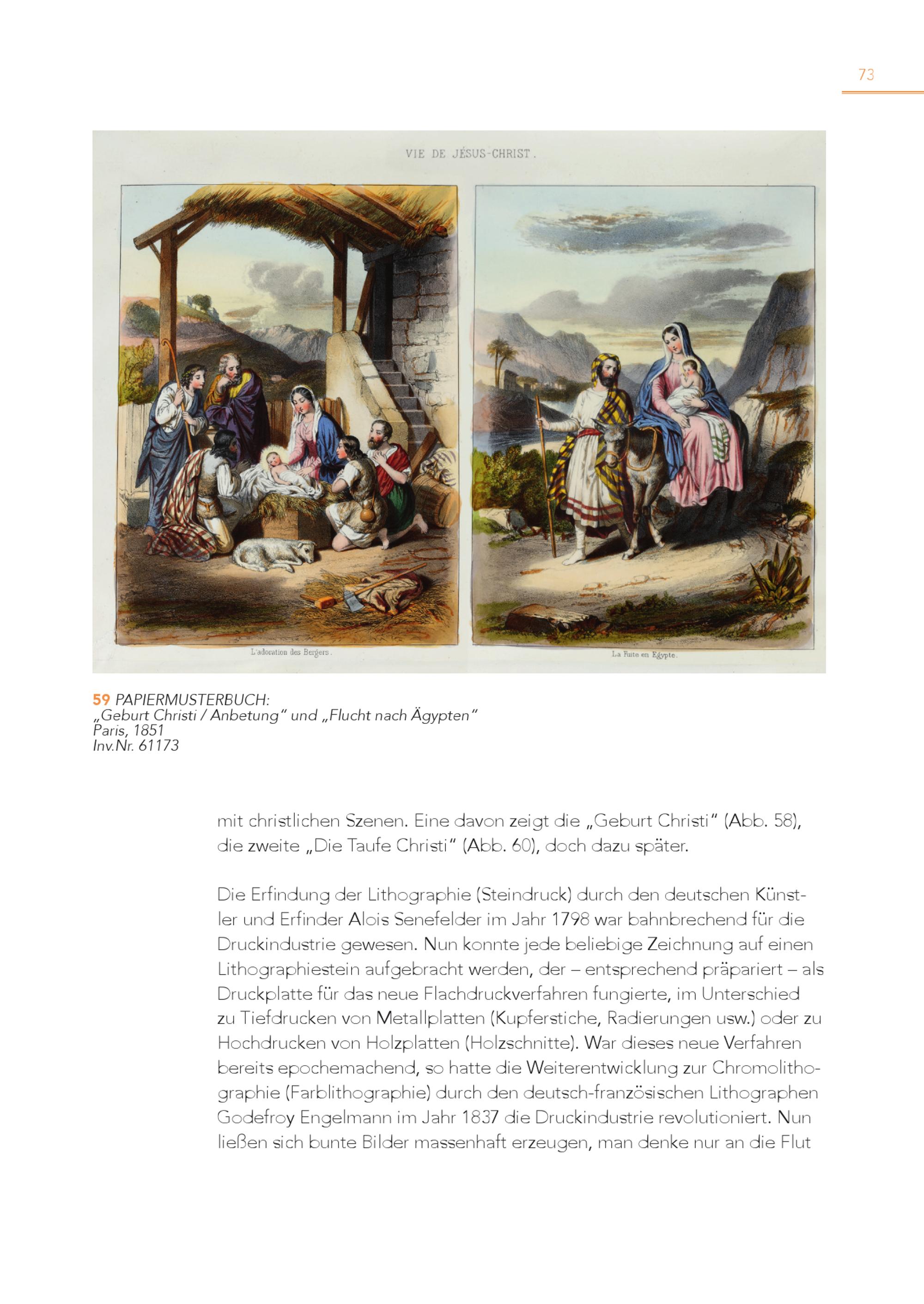 73 5 „G 9 ePbAuPrItECRhMriUstSiT/EARnBbUeCtuHn:g“ und„Flucht nach Ägypten“ Paris, 1851 Inv.Nr. 61173 mit christlichen Szenen. Eine davon zeigt die„Geburt Christi“(Abb. 58), die zweite„Die Taufe Christi“(Abb. 60), doch dazu später. Die Erfindung der Lithographie(Steindruck) durch den deutschen Künst ler und Erfinder Alois Senefelder im Jahr 1798 war bahnbrechend für die Druckindustrie gewesen. Nun konnte jede beliebige Zeichnung auf einen Lithographiestein aufgebracht werden, der – entsprechend präpariert – als Druckplatte für das neue Flachdruckverfahren fungierte, im Unterschied zu Tiefdrucken von Metallplatten(Kupferstiche, Radierungen usw.) oder zu Hochdrucken von Holzplatten(Holzschnitte). War dieses neue Verfahren bereits epochemachend, so hatte die Weiterentwicklung zur Chromolithographie(Farblithographie) durch den deutsch-französischen Lithographen Godefroy Engelmann im Jahr 1837 die Druckindustrie revolutioniert. Nun ließen sich bunte Bilder massenhaft erzeugen, man denke nur an die Flut