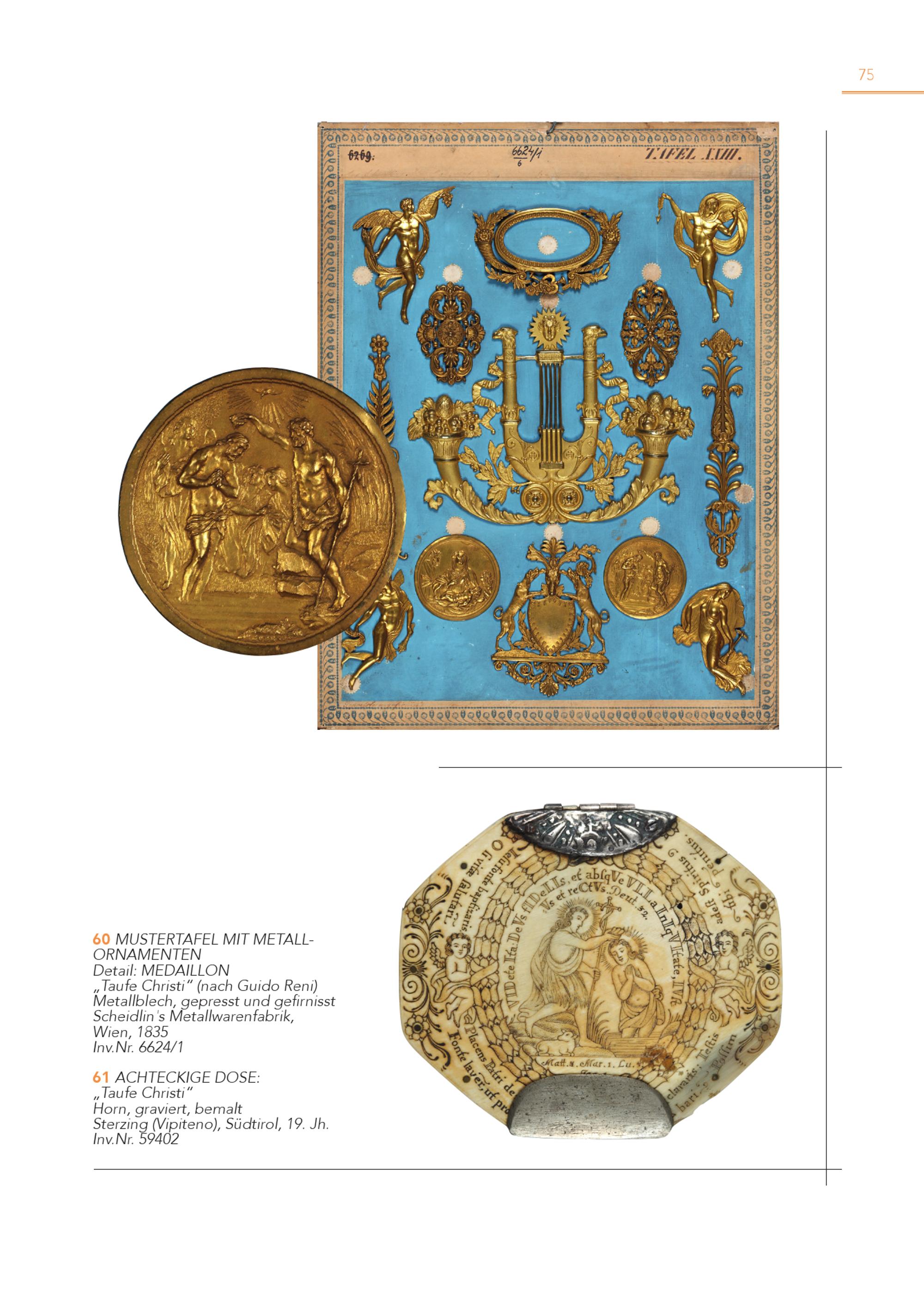 75 6 O 0 RNMAUMSTEENRTTEANFEL MIT METALLDetail: MEDAILLON „Taufe Christi“(nach Guido Reni) Metallblech, gepresst und gefirnisst Scheidlin's Metallwarenfabrik, Wien, 1835 Inv.Nr. 6624/1 6 „T 1 aAufCeHCThErCistKi“IGE DOSE: Horn, graviert, bemalt Sterzing(Vipiteno), Südtirol, 19. Jh. Inv.Nr. 59402