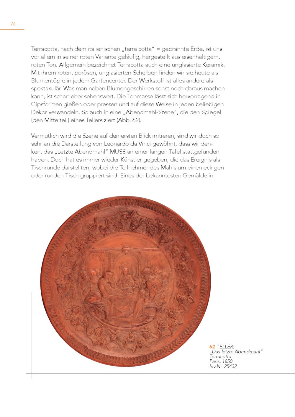 76 Terracotta, nach dem italienischen„terra cotta“= gebrannte Erde, ist uns vor allem in seiner roten Variante geläufig, hergestellt aus eisenhaltigem, roten Ton. Allgemein bezeichnet Terracotta auch eine unglasierte Keramik. Mit ihrem roten, porösen, unglasierten Scherben finden wir sie heute als Blumentöpfe in jedem Gartencenter. Der Werkstoff ist alles andere als spektakulär. Was man neben Blumengeschirren sonst noch daraus machen kann, ist schon eher sehenswert. Die Tonmasse lässt sich hervorragend in Gipsformen gießen oder pressen und auf diese Weise in jeden beliebigen Dekor verwandeln. So auch in eine„Abendmahl-Szene“, die den Spiegel (den Mittelteil) eines Tellers ziert(Abb. 62). Vermutlich wird die Szene auf den ersten Blick irritieren, sind wir doch so sehr an die Darstellung von Leonardo da Vinci gewöhnt, dass wir denken, das„Letzte Abendmahl“ MUSS an einer langen Tafel stattgefunden haben. Doch hat es immer wieder Künstler gegeben, die das Ereignis als Tischrunde darstellten, wobei die Teilnehmer des Mahls um einen eckigen oder runden Tisch gruppiert sind. Eines der bekanntesten Gemälde in 6 „D 2 aTsElLeLtzEtRe: Abendmahl“ Terracotta Paris, 1850 Inv.Nr. 25432