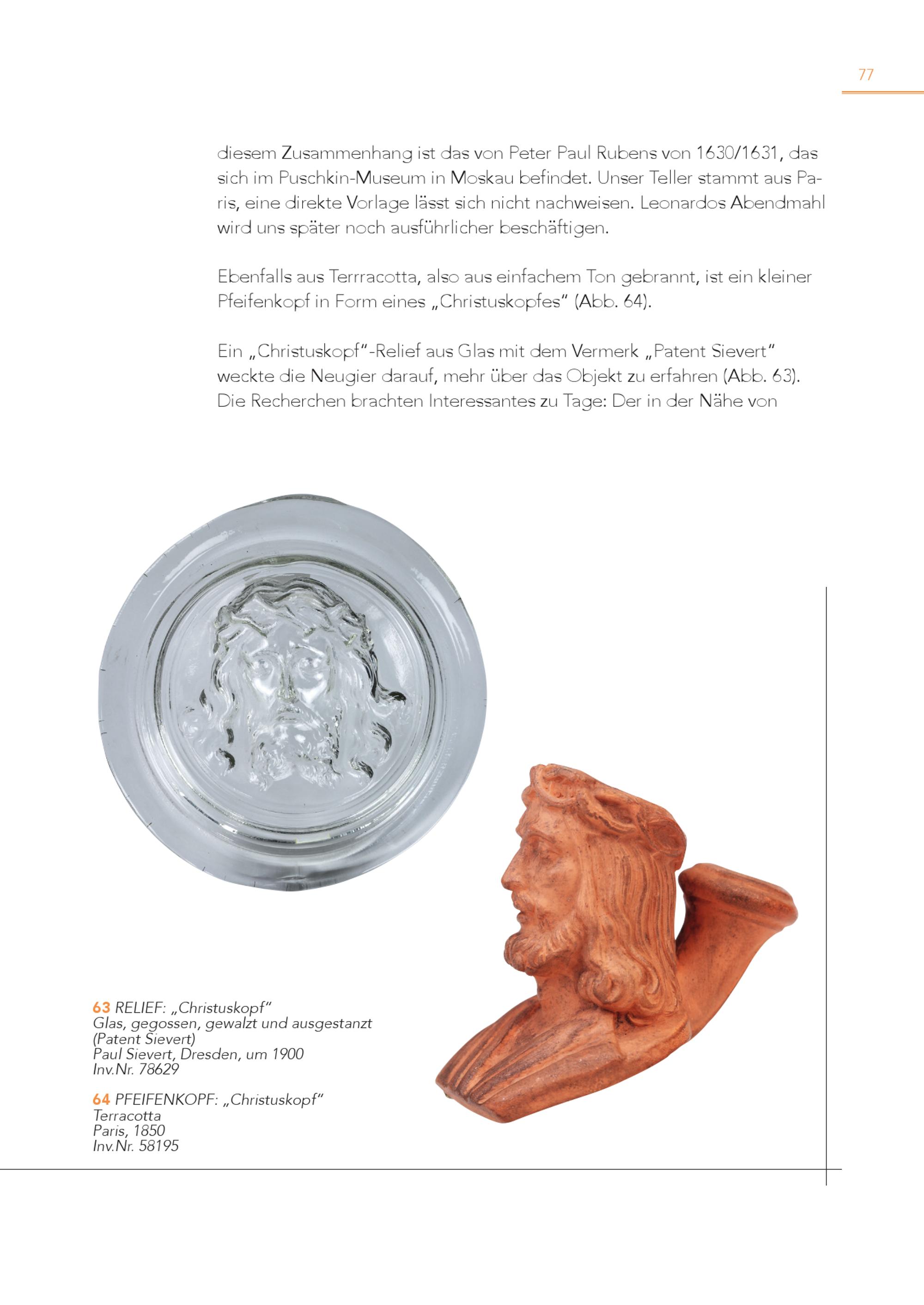 77 diesem Zusammenhang ist das von Peter Paul Rubens von 1630/1631, das sich im Puschkin-Museum in Moskau befindet. Unser Teller stammt aus Pa ris, eine direkte Vorlage lässt sich nicht nachweisen. Leonardos Abendmahl wird uns später noch ausführlicher beschäftigen. Ebenfalls aus Terrracotta, also aus einfachem Ton gebrannt, ist ein kleiner Pfeifenkopf in Form eines„Christuskopfes“(Abb. 64). Ein„Christuskopf“-Relief aus Glas mit dem Vermerk„Patent Sievert“ weckte die Neugier darauf, mehr über das Objekt zu erfahren(Abb. 63). Die Recherchen brachten Interessantes zu Tage: Der in der Nähe von 6 G 3 laRs,EgLeIEgFo:s„sCenh,rigsteuwskaolzpt fu“nd ausgestanzt (Patent Sievert) Paul Sievert, Dresden, um 1900 Inv.Nr. 78629 6 Te 4 rrPaFcEoItFtaENKOPF: „Christuskopf“ Paris, 1850 Inv.Nr. 58195