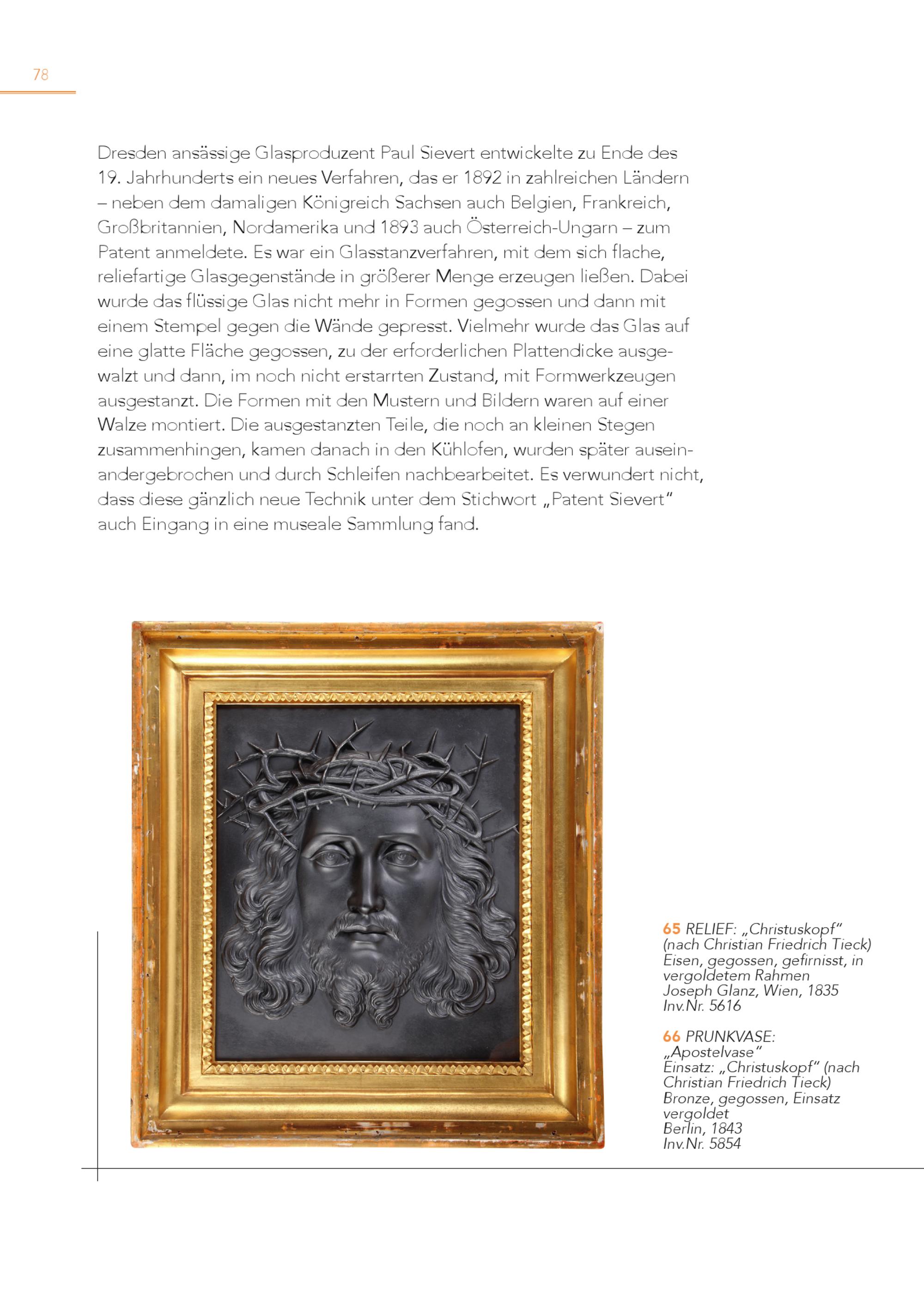 78 Dresden ansässige Glasproduzent Paul Sievert entwickelte zu Ende des 19. Jahrhunderts ein neues Verfahren, das er 1892 in zahlreichen Ländern – neben dem damaligen Königreich Sachsen auch Belgien, Frankreich, Großbritannien, Nordamerika und 1893 auch Österreich-Ungarn – zum Patent anmeldete. Es war ein Glasstanzverfahren, mit dem sich flache, reliefartige Glasgegenstände in größerer Menge erzeugen ließen. Dabei wurde das flüssige Glas nicht mehr in Formen gegossen und dann mit einem Stempel gegen die Wände gepresst. Vielmehr wurde das Glas auf eine glatte Fläche gegossen, zu der erforderlichen Plattendicke ausgewalzt und dann, im noch nicht erstarrten Zustand, mit Formwerkzeugen ausgestanzt. Die Formen mit den Mustern und Bildern waren auf einer Walze montiert. Die ausgestanzten Teile, die noch an kleinen Stegen zusammenhingen, kamen danach in den Kühlofen, wurden später auseinandergebrochen und durch Schleifen nachbearbeitet. Es verwundert nicht, dass diese gänzlich neue Technik unter dem Stichwort„Patent Sievert“ auch Eingang in eine museale Sammlung fand. 6 (n 5 acRhECLIhErFis: t„iaCnhFrirsiteudsrkiochpfT“ieck) Eisen, gegossen, gefirnisst, in vergoldetem Rahmen Joseph Glanz, Wien, 1835 Inv.Nr. 5616 6 „A 6 pPoRsUteNlvKaVsAeS“E: Einsatz:„Christuskopf“(nach Christian Friedrich Tieck) Bronze, gegossen, Einsatz vergoldet Berlin, 1843 Inv.Nr. 5854