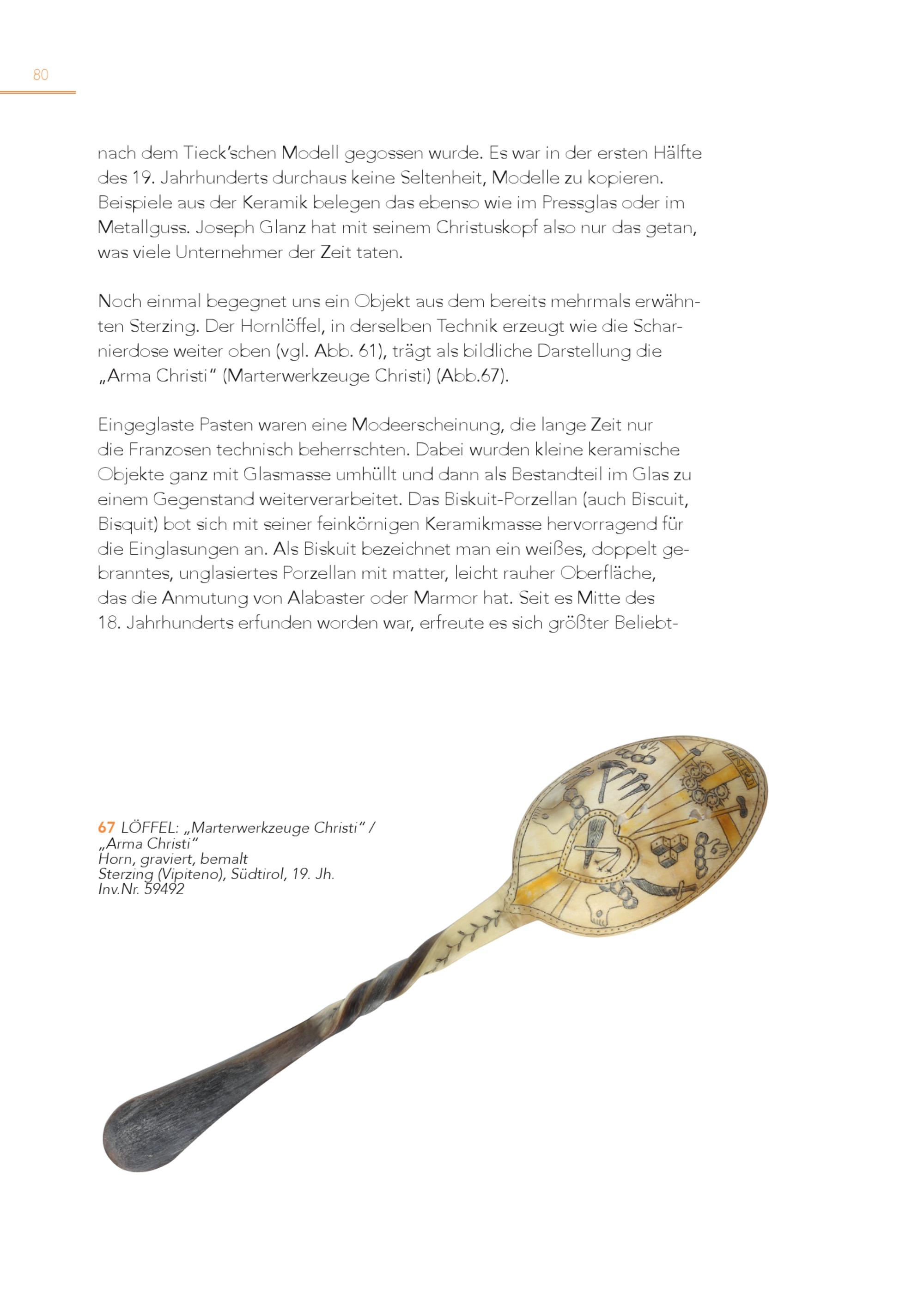 80 nach dem Tieck’schen Modell gegossen wurde. Es war in der ersten Hälfte des 19. Jahrhunderts durchaus keine Seltenheit, Modelle zu kopieren. Beispiele aus der Keramik belegen das ebenso wie im Pressglas oder im Metallguss. Joseph Glanz hat mit seinem Christuskopf also nur das getan, was viele Unternehmer der Zeit taten. Noch einmal begegnet uns ein Objekt aus dem bereits mehrmals erwähnten Sterzing. Der Hornlöffel, in derselben Technik erzeugt wie die Scharnierdose weiter oben(vgl. Abb. 61), trägt als bildliche Darstellung die „Arma Christi“(Marterwerkzeuge Christi)(Abb.67). Eingeglaste Pasten waren eine Modeerscheinung, die lange Zeit nur die Franzosen technisch beherrschten. Dabei wurden kleine keramische Objekte ganz mit Glasmasse umhüllt und dann als Bestandteil im Glas zu einem Gegenstand weiterverarbeitet. Das Biskuit-Porzellan(auch Biscuit, Bisquit) bot sich mit seiner feinkörnigen Keramikmasse hervorragend für die Einglasungen an. Als Biskuit bezeichnet man ein weißes, doppelt gebranntes, unglasiertes Porzellan mit matter, leicht rauher Oberfläche, das die Anmutung von Alabaster oder Marmor hat. Seit es Mitte des 18. Jahrhunderts erfunden worden war, erfreute es sich größter Beliebt6 „A 7 rLmÖaFCFhErLis: t„i“Marterwerkzeuge Christi“/ Horn, graviert, bemalt Sterzing(Vipiteno), Südtirol, 19. Jh. Inv.Nr. 59492