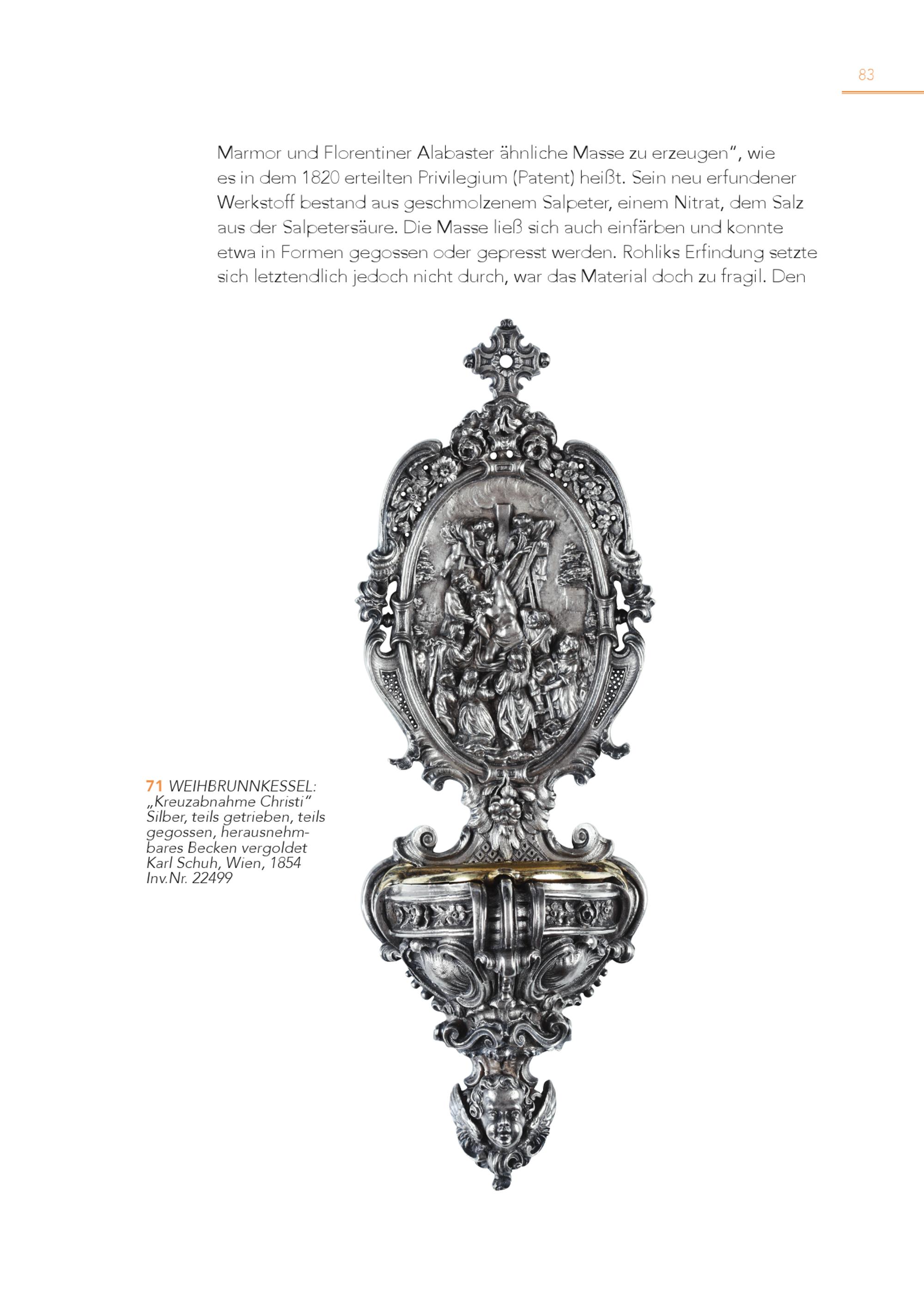 83 Marmor und Florentiner Alabaster ähnliche Masse zu erzeugen“, wie es in dem 1820 erteilten Privilegium(Patent) heißt. Sein neu erfundener Werkstoff bestand aus geschmolzenem Salpeter, einem Nitrat, dem Salz aus der Salpetersäure. Die Masse ließ sich auch einfärben und konnte etwa in Formen gegossen oder gepresst werden. Rohliks Erfindung setzte sich letztendlich jedoch nicht durch, war das Material doch zu fragil. Den 7 „K 1 reWuEzaIHbBnRahUmNeNCKEhSriSstEi“L: Silber, teils getrieben, teils gegossen, herausnehmbares Becken vergoldet Karl Schuh, Wien, 1854 Inv.Nr. 22499