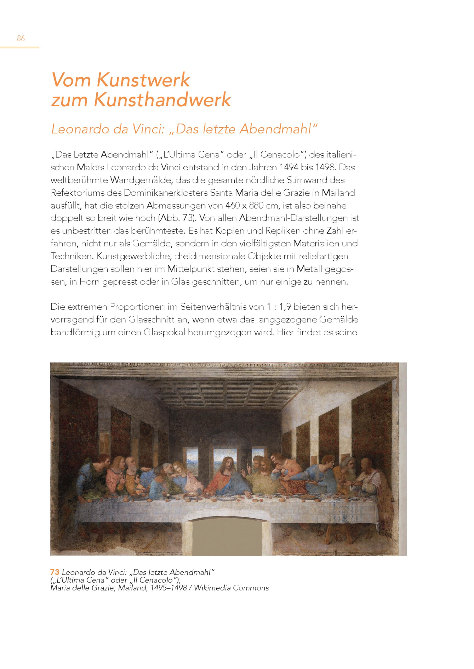 86 Vom Kunstwerk zum Kunsthandwerk Leonardo da Vinci:„Das letzte Abendmahl“ „Das Letzte Abendmahl“(„L’Ultima Cena“ oder„Il Cenacolo“) des italienischen Malers Leonardo da Vinci entstand in den Jahren 1494 bis 1498. Das weltberühmte Wandgemälde, das die gesamte nördliche Stirnwand des Refektoriums des Dominikanerklosters Santa Maria delle Grazie in Mailand ausfüllt, hat die stolzen Abmessungen von 460 x 880 cm, ist also beinahe doppelt so breit wie hoch(Abb. 73). Von allen Abendmahl-Darstellungen ist es unbestritten das berühmteste. Es hat Kopien und Repliken ohne Zahl erfahren, nicht nur als Gemälde, sondern in den vielfältigsten Materialien und Techniken. Kunstgewerbliche, dreidimensionale Objekte mit reliefartigen Darstellungen sollen hier im Mittelpunkt stehen, seien sie in Metall gegossen, in Horn gepresst oder in Glas geschnitten, um nur einige zu nennen. Die extremen Proportionen im Seitenverhältnis von 1: 1,9 bieten sich hervorragend für den Glasschnitt an, wenn etwa das langgezogene Gemälde bandförmig um einen Glaspokal herumgezogen wird. Hier findet es seine 7 („ 3 L’ULeltoimnaardCoendaa“Voindceir: „Das letzte Abendmahl“ „Il Cenacolo“), Maria delle Grazie, Mailand, 1495–1498/ Wikimedia Commons