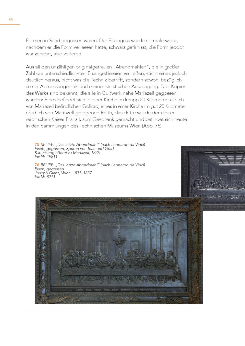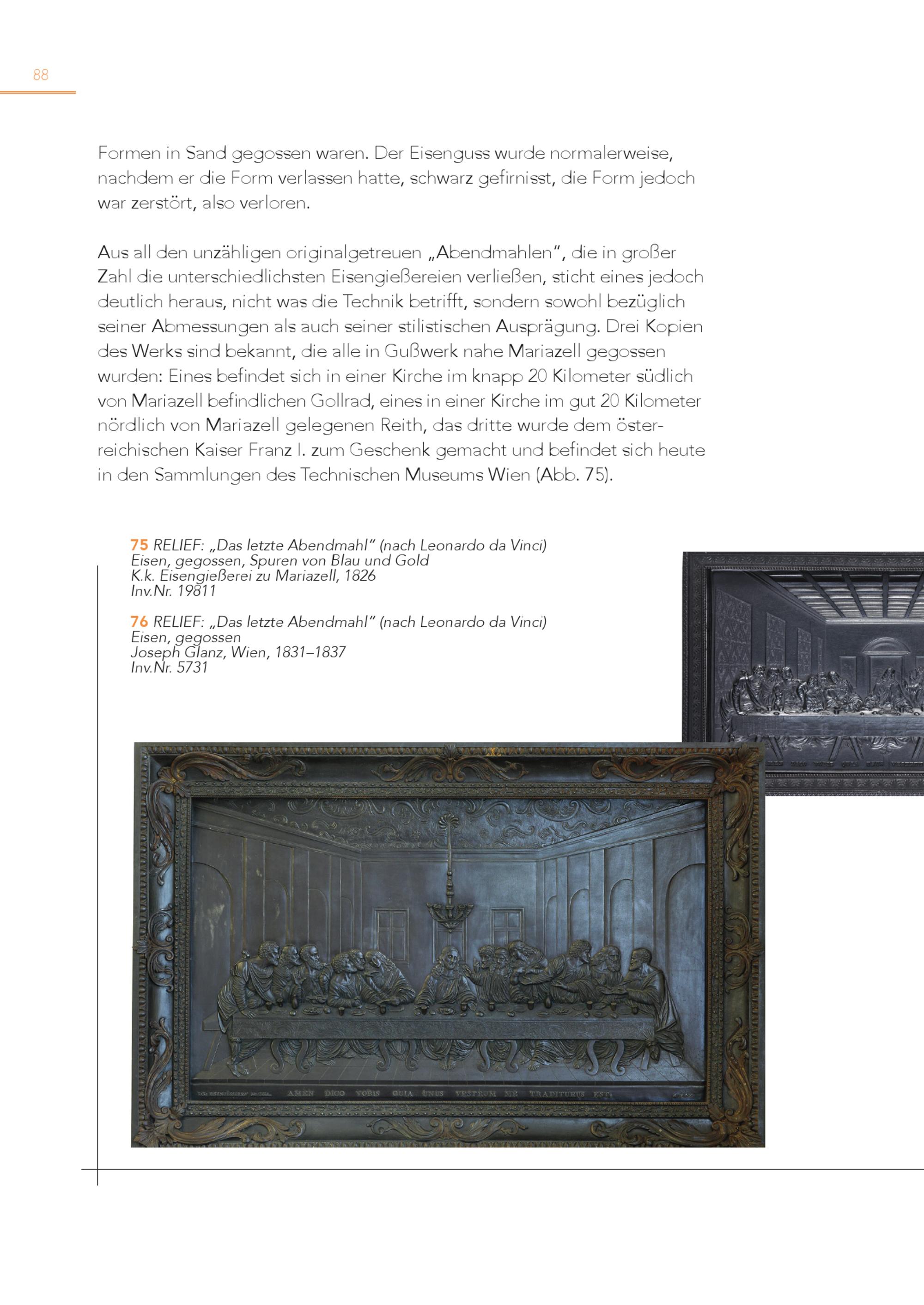 88 Formen in Sand gegossen waren. Der Eisenguss wurde normalerweise, nachdem er die Form verlassen hatte, schwarz gefirnisst, die Form jedoch war zerstört, also verloren. Aus all den unzähligen originalgetreuen„Abendmahlen“, die in großer Zahl die unterschiedlichsten Eisengießereien verließen, sticht eines jedoch deutlich heraus, nicht was die Technik betrifft, sondern sowohl bezüglich seiner Abmessungen als auch seiner stilistischen Ausprägung. Drei Kopien des Werks sind bekannt, die alle in Gußwerk nahe Mariazell gegossen wurden: Eines befindet sich in einer Kirche im knapp 20 Kilometer südlich von Mariazell befindlichen Gollrad, eines in einer Kirche im gut 20 Kilometer nördlich von Mariazell gelegenen Reith, das dritte wurde dem österreichischen Kaiser Franz I. zum Geschenk gemacht und befindet sich heute in den Sammlungen des Technischen Museums Wien(Abb. 75). 7 E 5 iseRnE,LgIEeFg:o„sDseans,lSeptzutereAnbveonndBmlaauhlu“n(dnaGcohldLeonardo da Vinci) K.k. Eisengießerei zu Mariazell, 1826 Inv.Nr. 19811 7 E 6 iseRnE,LgIEeFg:o„sDseans letzte Abendmahl“(nach Leonardo da Vinci) Joseph Glanz, Wien, 1831–1837 Inv.Nr. 5731