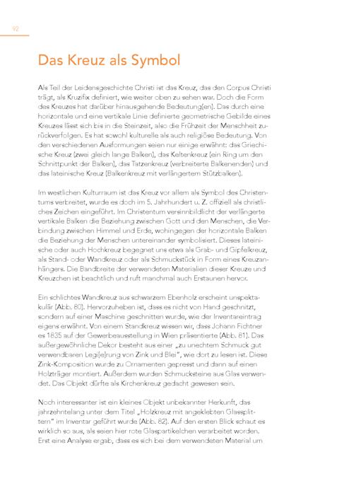 92 Das Kreuz als Symbol Als Teil der Leidensgeschichte Christi ist das Kreuz, das den Corpus Christi trägt, als Kruzifix definiert, wie weiter oben zu sehen war. Doch die Form des Kreuzes hat darüber hinausgehende Bedeutung(en). Das durch eine horizontale und eine vertikale Linie definierte geometrische Gebilde eines Kreuzes lässt sich bis in die Steinzeit, also die Frühzeit der Menschheit zu rückverfolgen. Es hat sowohl kulturelle als auch religiöse Bedeutung. Von den verschiedenen Ausformungen seien nur einige erwähnt: das Griechi sche Kreuz(zwei gleich lange Balken), das Keltenkreuz(ein Ring um den Schnittpunkt der Balken), das Tatzenkreuz(verbreiterte Balkenenden) und das lateinische Kreuz(Balkenkreuz mit verlängertem Stützbalken). Im westlichen Kulturraum ist das Kreuz vor allem als Symbol des Christen tums verbreitet, wurde es doch im 5. Jahrhundert u. Z. offiziell als christli ches Zeichen eingeführt. Im Christentum versinnbildlicht der verlängerte vertikale Balken die Beziehung zwischen Gott und den Menschen, die Ver bindung zwischen Himmel und Erde, wohingegen der horizontale Balken die Beziehung der Menschen untereinander symbolisiert. Dieses lateini sche oder auch Hochkreuz begegnet uns etwa als Grab- und Gipfelkreuz, als Stand- oder Wandkreuz oder als Schmuckstück in Form eines Kreuzan hängers. Die Bandbreite der verwendeten Materialien dieser Kreuze und Kreuzchen ist beachtlich und ruft manchmal auch Erstaunen hervor. Ein schlichtes Wandkreuz aus schwarzem Ebenholz erscheint unspekta kulär(Abb. 80). Hervorzuheben ist, dass es nicht von Hand geschnitzt, sondern auf einer Maschine geschnitten wurde, wie der Inventareintrag eigens erwähnt. Von einem Standkreuz wissen wir, dass Johann Fichtner es 1835 auf der Gewerbeausstellung in Wien präsentierte(Abb. 81). Das außergewöhnliche Dekor besteht aus einer„zu unechtem Schmuck gut verwendbaren Legi[e]rung von Zink und Blei“, wie dort zu lesen ist. Diese Zink-Komposition wurde zu Ornamenten gepresst und dann auf einen Holzträger montiert. Außerdem wurden Schmucksteine aus Glas verwen det. Das Objekt dürfte als Kirchenkreuz gedacht gewesen sein. Noch interessanter ist ein kleines Objekt unbekannter Herkunft, das jahrzehntelang unter dem Titel„Holzkreuz mit angeklebten Glassplit tern“ im Inventar geführt wurde(Abb. 82). Auf den ersten Blick schaut es wirklich so aus, als seien hier rote Glaspartikelchen verarbeitet worden. Erst eine Analyse ergab, dass es sich bei dem verwendeten Material um