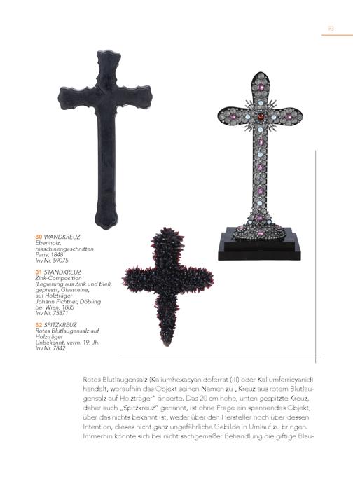 93 8 E 0 beWnhAoNlzD, KREUZ maschinengeschnitten Paris, 1848 Inv.Nr. 59075 8 Zi 1 nkS-TCAoNmDpKoRsEitiUoZn (Legierung aus Zink und Blei), gepresst, Glassteine, auf Holzträger Johann Fichtner, Döbling bei Wien, 1885 Inv.Nr. 75371 8 R 2 otSePsIBTlZuKtlRaEuUgeZnsalz auf Holzträger Unbekannt, verm. 19. Jh. Inv.Nr. 7842 Rotes Blutlaugensalz(Kaliumhexacyanidoferrat(III) oder Kaliumferricyanid) handelt, woraufhin das Objekt seinen Namen zu„Kreuz aus rotem Blutlau gensalz auf Holzträger“ änderte. Das 20 cm hohe, unten gespitzte Kreuz, daher auch„Spitzkreuz“ genannt, ist ohne Frage ein spannendes Objekt, über das nichts bekannt ist, weder über den Hersteller noch über dessen Intention, dieses nicht ganz ungefährliche Gebilde in Umlauf zu bringen. Immerhin könnte sich bei nicht sachgemäßer Behandlung die giftige Blau -