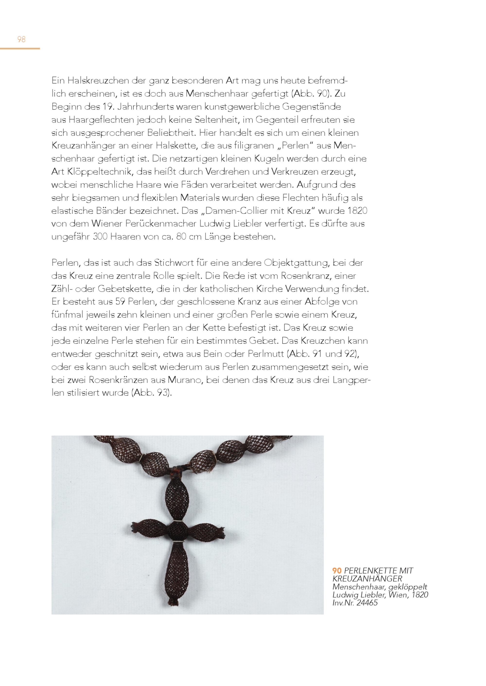 98 Ein Halskreuzchen der ganz besonderen Art mag uns heute befremd lich erscheinen, ist es doch aus Menschenhaar gefertigt(Abb. 90). Zu Beginn des 19. Jahrhunderts waren kunstgewerbliche Gegenstände aus Haargeflechten jedoch keine Seltenheit, im Gegenteil erfreuten sie sich ausgesprochener Beliebtheit. Hier handelt es sich um einen kleinen Kreuzanhänger an einer Halskette, die aus filigranen„Perlen“ aus Men schenhaar gefertigt ist. Die netzartigen kleinen Kugeln werden durch eine Art Klöppeltechnik, das heißt durch Verdrehen und Verkreuzen erzeugt, wobei menschliche Haare wie Fäden verarbeitet werden. Aufgrund des sehr biegsamen und flexiblen Materials wurden diese Flechten häufig als elastische Bänder bezeichnet. Das„Damen-Collier mit Kreuz“ wurde 1820 von dem Wiener Perückenmacher Ludwig Liebler verfertigt. Es dürfte aus ungefähr 300 Haaren von ca. 80 cm Länge bestehen. Perlen, das ist auch das Stichwort für eine andere Objektgattung, bei der das Kreuz eine zentrale Rolle spielt. Die Rede ist vom Rosenkranz, einer Zähl- oder Gebetskette, die in der katholischen Kirche Verwendung findet. Er besteht aus 59 Perlen, der geschlossene Kranz aus einer Abfolge von fünfmal jeweils zehn kleinen und einer großen Perle sowie einem Kreuz, das mit weiteren vier Perlen an der Kette befestigt ist. Das Kreuz sowie jede einzelne Perle stehen für ein bestimmtes Gebet. Das Kreuzchen kann entweder geschnitzt sein, etwa aus Bein oder Perlmutt(Abb. 91 und 92), oder es kann auch selbst wiederum aus Perlen zusammengesetzt sein, wie bei zwei Rosenkränzen aus Murano, bei denen das Kreuz aus drei Langper len stilisiert wurde(Abb. 93). 9 K 0 REPUEZRALENNHKÄENTGTEERMIT Menschenhaar, geklöppelt Ludwig Liebler, Wien, 1820 Inv.Nr. 24465