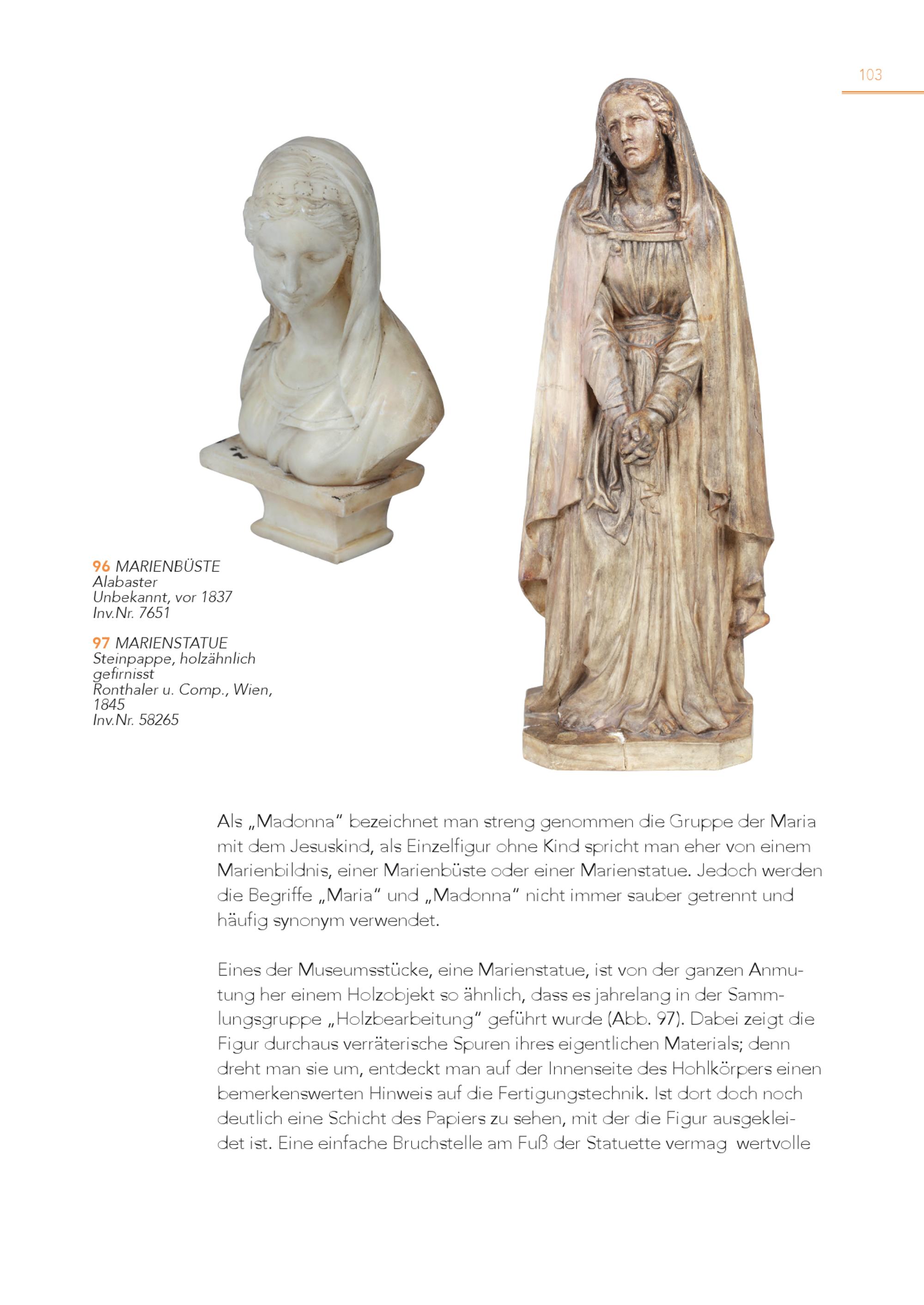 103 9 A 6 labMaAstReIrENBÜSTE Unbekannt, vor 1837 Inv.Nr. 7651 9 St 7 eiMnpAaRpIEpNe,ShToAlTzäUhEnlich gefirnisst Ronthaler u. Comp., Wien, 1845 Inv.Nr. 58265 Als„Madonna“ bezeichnet man streng genommen die Gruppe der Maria mit dem Jesuskind, als Einzelfigur ohne Kind spricht man eher von einem Marienbildnis, einer Marienbüste oder einer Marienstatue. Jedoch werden die Begriffe„Maria“ und„Madonna“ nicht immer sauber getrennt und häufig synonym verwendet. Eines der Museumsstücke, eine Marienstatue, ist von der ganzen Anmu tung her einem Holzobjekt so ähnlich, dass es jahrelang in der Samm lungsgruppe„Holzbearbeitung“ geführt wurde(Abb. 97). Dabei zeigt die Figur durchaus verräterische Spuren ihres eigentlichen Materials; denn dreht man sie um, entdeckt man auf der Innenseite des Hohlkörpers einen bemerkenswerten Hinweis auf die Fertigungstechnik. Ist dort doch noch deutlich eine Schicht des Papiers zu sehen, mit der die Figur ausgeklei det ist. Eine einfache Bruchstelle am Fuß der Statuette vermag wertvolle