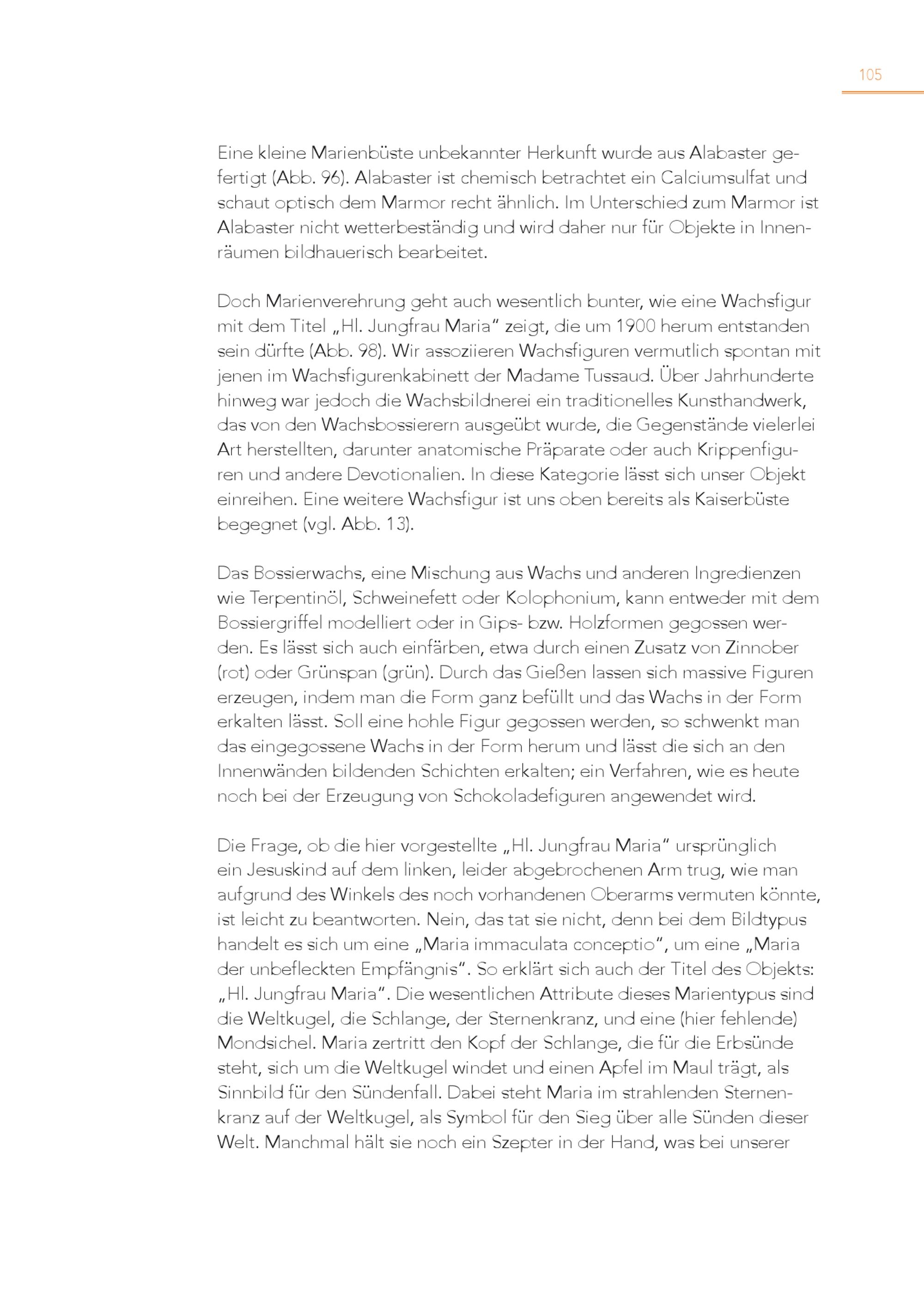 105 Eine kleine Marienbüste unbekannter Herkunft wurde aus Alabaster ge fertigt(Abb. 96). Alabaster ist chemisch betrachtet ein Calciumsulfat und schaut optisch dem Marmor recht ähnlich. Im Unterschied zum Marmor ist Alabaster nicht wetterbeständig und wird daher nur für Objekte in Innen räumen bildhauerisch bearbeitet. Doch Marienverehrung geht auch wesentlich bunter, wie eine Wachsfigur mit dem Titel„Hl. Jungfrau Maria“ zeigt, die um 1900 herum entstanden sein dürfte(Abb. 98). Wir assoziieren Wachsfiguren vermutlich spontan mit jenen im Wachsfigurenkabinett der Madame Tussaud. Über Jahrhunderte hinweg war jedoch die Wachsbildnerei ein traditionelles Kunsthandwerk, das von den Wachsbossierern ausgeübt wurde, die Gegenstände vielerlei Art herstellten, darunter anatomische Präparate oder auch Krippenfigu ren und andere Devotionalien. In diese Kategorie lässt sich unser Objekt einreihen. Eine weitere Wachsfigur ist uns oben bereits als Kaiserbüste begegnet(vgl. Abb. 13). Das Bossierwachs, eine Mischung aus Wachs und anderen Ingredienzen wie Terpentinöl, Schweinefett oder Kolophonium, kann entweder mit dem Bossiergriffel modelliert oder in Gips- bzw. Holzformen gegossen wer den. Es lässt sich auch einfärben, etwa durch einen Zusatz von Zinnober (rot) oder Grünspan(grün). Durch das Gießen lassen sich massive Figuren erzeugen, indem man die Form ganz befüllt und das Wachs in der Form erkalten lässt. Soll eine hohle Figur gegossen werden, so schwenkt man das eingegossene Wachs in der Form herum und lässt die sich an den Innenwänden bildenden Schichten erkalten; ein Verfahren, wie es heute noch bei der Erzeugung von Schokoladefiguren angewendet wird. Die Frage, ob die hier vorgestellte„Hl. Jungfrau Maria“ ursprünglich ein Jesuskind auf dem linken, leider abgebrochenen Arm trug, wie man aufgrund des Winkels des noch vorhandenen Oberarms vermuten könnte, ist leicht zu beantworten. Nein, das tat sie nicht, denn bei dem Bildtypus handelt es sich um eine„Maria immaculata conceptio“, um eine„Maria der unbefleckten Empfängnis“. So erklärt sich auch der Titel des Objekts: „Hl. Jungfrau Maria“. Die wesentlichen Attribute dieses Marientypus sind die Weltkugel, die Schlange, der Sternenkranz, und eine(hier fehlende) Mondsichel. Maria zertritt den Kopf der Schlange, die für die Erbsünde steht, sich um die Weltkugel windet und einen Apfel im Maul trägt, als Sinnbild für den Sündenfall. Dabei steht Maria im strahlenden Sternen kranz auf der Weltkugel, als Symbol für den Sieg über alle Sünden dieser Welt. Manchmal hält sie noch ein Szepter in der Hand, was bei unserer