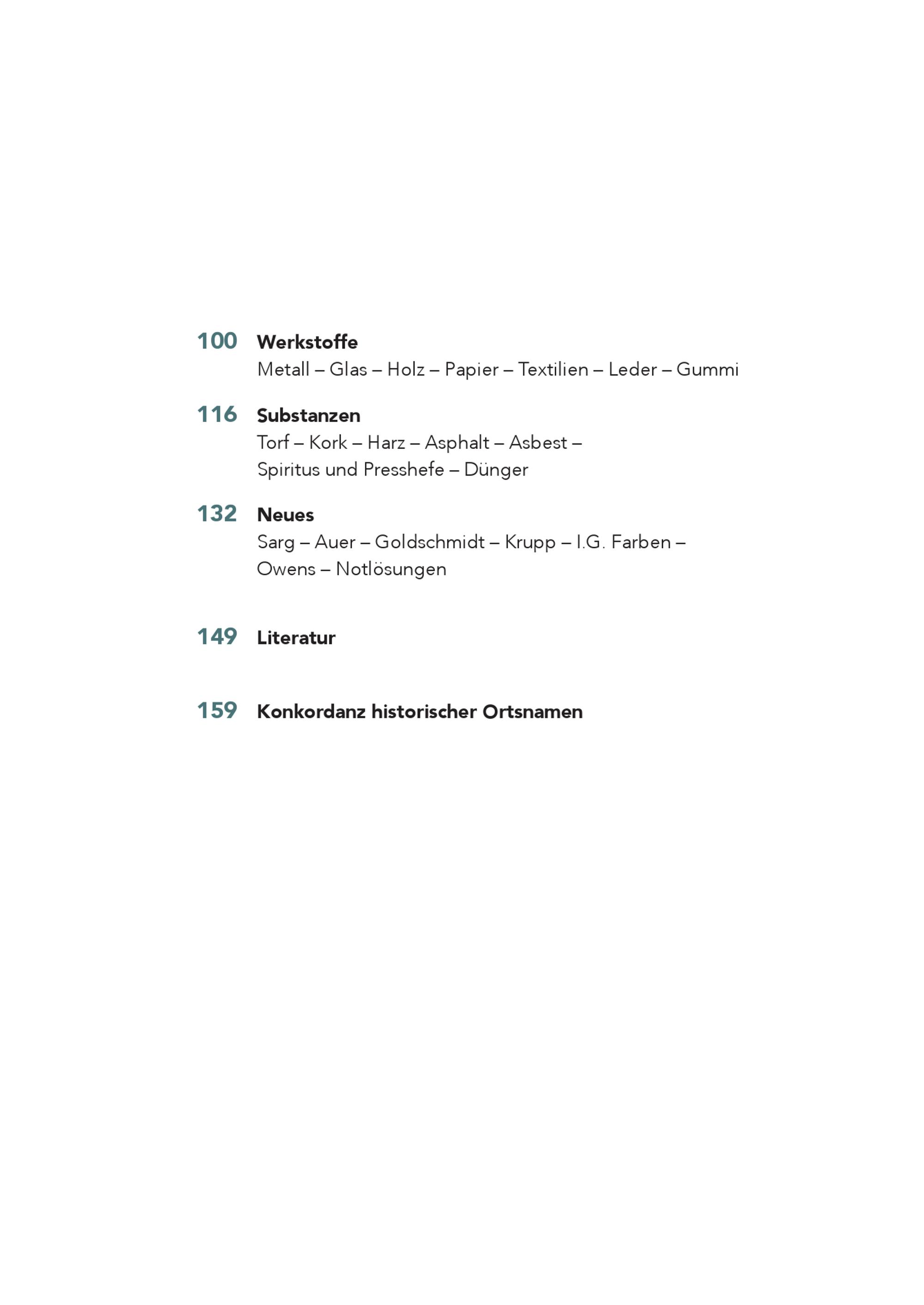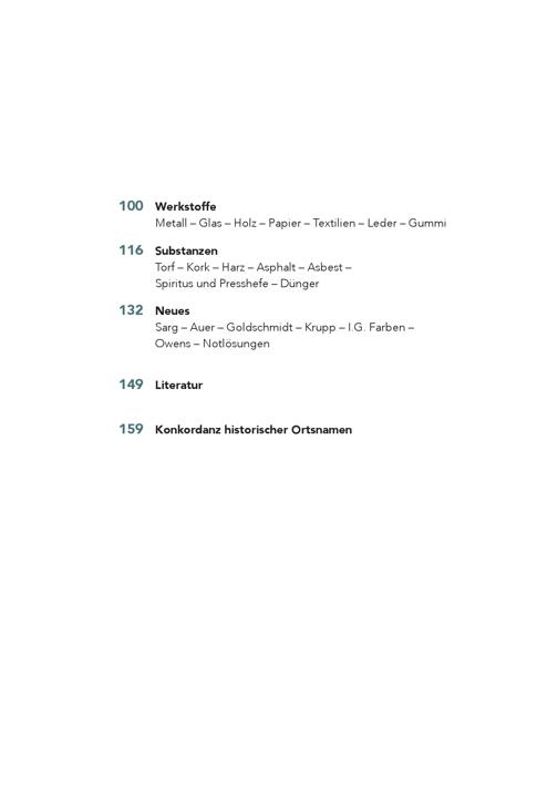 100 Werkstoffe Metall – Glas – Holz – Papier – Textilien – Leder – Gummi 116 Substanzen Torf – Kork – Harz – Asphalt – Asbest – Spiritus und Presshefe – Dünger 132 Neues Sarg – Auer – Goldschmidt – Krupp – I.G. Farben – Owens – Notlösungen 149 Literatur 159 Konkordanz historischer Ortsnamen