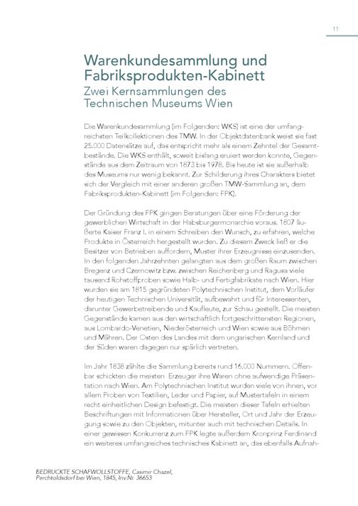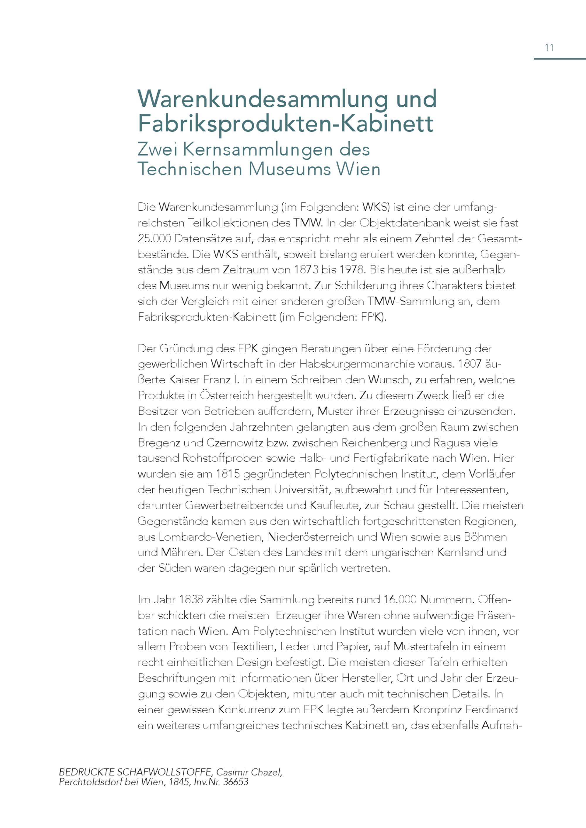 11 Warenkundesammlung und Fabriksprodukten-Kabinett Zwei Kernsammlungen des Technischen Museums Wien Die Warenkundesammlung(im Folgenden: WKS) ist eine der umfangreichsten Teilkollektionen des TMW. In der Objektdatenbank weist sie fast 25.000 Datensätze auf, das entspricht mehr als einem Zehntel der Gesamtbestände. Die WKS enthält, soweit bislang eruiert werden konnte, Gegenstände aus dem Zeitraum von 1873 bis 1978. Bis heute ist sie außerhalb des Museums nur wenig bekannt. Zur Schilderung ihres Charakters bietet sich der Vergleich mit einer anderen großen TMW-Sammlung an, dem Fabriksprodukten-Kabinett(im Folgenden: FPK). Der Gründung des FPK gingen Beratungen über eine Förderung der gewerblichen Wirtschaft in der Habsburgermonarchie voraus. 1807 äußerte Kaiser Franz I. in einem Schreiben den Wunsch, zu erfahren, welche Produkte in Österreich hergestellt wurden. Zu diesem Zweck ließ er die Besitzer von Betrieben auffordern, Muster ihrer Erzeugnisse einzusenden. In den folgenden Jahrzehnten gelangten aus dem großen Raum zwischen Bregenz und Czernowitz bzw. zwischen Reichenberg und Ragusa viele tausend Rohstoffproben sowie Halb- und Fertigfabrikate nach Wien. Hier wurden sie am 1815 gegründeten Polytechnischen Institut, dem Vorläufer der heutigen Technischen Universität, aufbewahrt und für Interessenten, darunter Gewerbetreibende und Kaufleute, zur Schau gestellt. Die meisten Gegenstände kamen aus den wirtschaftlich fortgeschrittensten Regionen, aus Lombardo-Venetien, Niederösterreich und Wien sowie aus Böhmen und Mähren. Der Osten des Landes mit dem ungarischen Kernland und der Süden waren dagegen nur spärlich vertreten. Im Jahr 1838 zählte die Sammlung bereits rund 16.000 Nummern. Offenbar schickten die meisten Erzeuger ihre Waren ohne aufwendige Präsentation nach Wien. Am Polytechnischen Institut wurden viele von ihnen, vor allem Proben von Textilien, Leder und Papier, auf Mustertafeln in einem recht einheitlichen Design befestigt. Die meisten dieser Tafeln erhielten Beschriftungen mit Informationen über Hersteller, Ort und Jahr der Erzeugung sowie zu den Objekten, mitunter auch mit technischen Details. In einer gewissen Konkurrenz zum FPK legte außerdem Kronprinz Ferdinand ein weiteres umfangreiches technisches Kabinett an, das ebenfalls AufnahBEDRUCKTE SCHAFWOLLSTOFFE, Casimir Chazel, Perchtoldsdorf bei Wien, 1845, Inv.Nr. 36653
