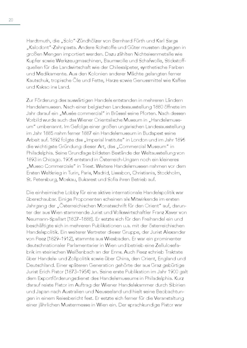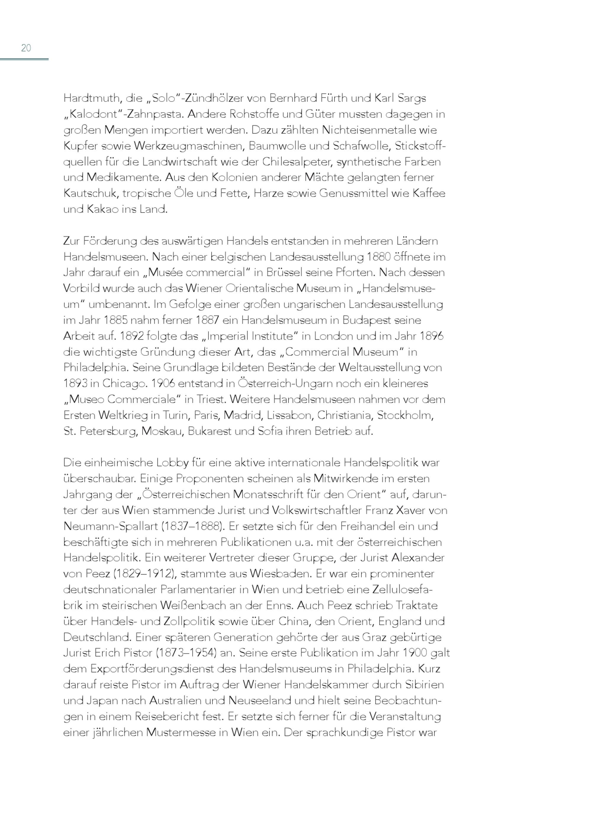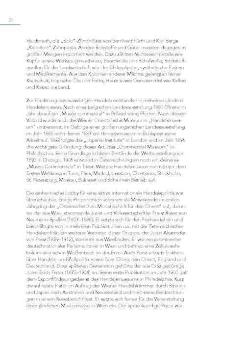 20 Hardtmuth, die„Solo“-Zündhölzer von Bernhard Fürth und Karl Sargs „Kalodont“-Zahnpasta. Andere Rohstoffe und Güter mussten dagegen in großen Mengen importiert werden. Dazu zählten Nichteisenmetalle wie Kupfer sowie Werkzeugmaschinen, Baumwolle und Schafwolle, Stickstoffquellen für die Landwirtschaft wie der Chilesalpeter, synthetische Farben und Medikamente. Aus den Kolonien anderer Mächte gelangten ferner Kautschuk, tropische Öle und Fette, Harze sowie Genussmittel wie Kaffee und Kakao ins Land. Zur Förderung des auswärtigen Handels entstanden in mehreren Ländern Handelsmuseen. Nach einer belgischen Landesausstellung 1880 öffnete im Jahr darauf ein„Musée commercial“ in Brüssel seine Pforten. Nach dessen Vorbild wurde auch das Wiener Orientalische Museum in„Handelsmuseum“ umbenannt. Im Gefolge einer großen ungarischen Landesausstellung im Jahr 1885 nahm ferner 1887 ein Handelsmuseum in Budapest seine Arbeit auf. 1892 folgte das„Imperial Institute“ in London und im Jahr 1896 die wichtigste Gründung dieser Art, das„Commercial Museum“ in Philadelphia. Seine Grundlage bildeten Bestände der Weltausstellung von 1893 in Chicago. 1906 entstand in Österreich-Ungarn noch ein kleineres „Museo Commerciale“ in Triest. Weitere Handelsmuseen nahmen vor dem Ersten Weltkrieg in Turin, Paris, Madrid, Lissabon, Christiania, Stockholm, St. Petersburg, Moskau, Bukarest und Sofia ihren Betrieb auf. Die einheimische Lobby für eine aktive internationale Handelspolitik war überschaubar. Einige Proponenten scheinen als Mitwirkende im ersten Jahrgang der„Österreichischen Monatsschrift für den Orient“ auf, darunter der aus Wien stammende Jurist und Volkswirtschaftler Franz Xaver von Neumann-Spallart(1837–1888). Er setzte sich für den Freihandel ein und beschäftigte sich in mehreren Publikationen u.a. mit der österreichischen Handelspolitik. Ein weiterer Vertreter dieser Gruppe, der Jurist Alexander von Peez(1829–1912), stammte aus Wiesbaden. Er war ein prominenter deutschnationaler Parlamentarier in Wien und betrieb eine Zellulosefabrik im steirischen Weißenbach an der Enns. Auch Peez schrieb Traktate über Handels- und Zollpolitik sowie über China, den Orient, England und Deutschland. Einer späteren Generation gehörte der aus Graz gebürtige Jurist Erich Pistor(1873–1954) an. Seine erste Publikation im Jahr 1900 galt dem Exportförderungsdienst des Handelsmuseums in Philadelphia. Kurz darauf reiste Pistor im Auftrag der Wiener Handelskammer durch Sibirien und Japan nach Australien und Neuseeland und hielt seine Beobachtungen in einem Reisebericht fest. Er setzte sich ferner für die Veranstaltung einer jährlichen Mustermesse in Wien ein. Der sprachkundige Pistor war