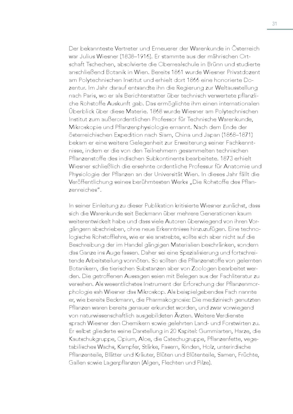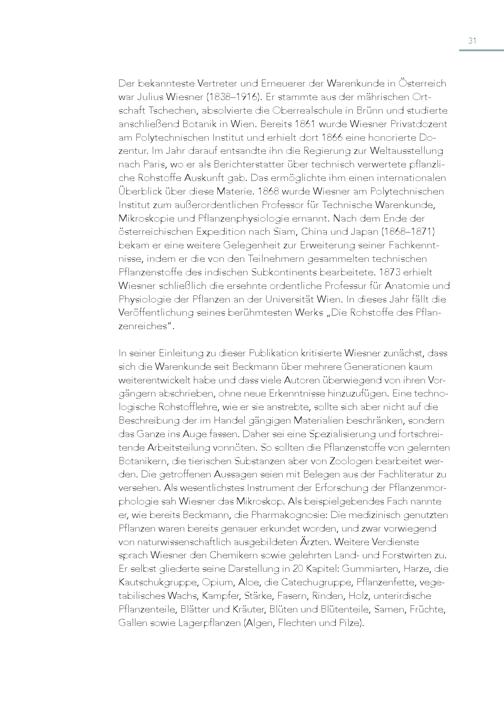 31 Der bekannteste Vertreter und Erneuerer der Warenkunde in Österreich war Julius Wiesner(1838–1916). Er stammte aus der mährischen Ortschaft Tschechen, absolvierte die Oberrealschule in Brünn und studierte anschließend Botanik in Wien. Bereits 1861 wurde Wiesner Privatdozent am Polytechnischen Institut und erhielt dort 1866 eine honorierte Dozentur. Im Jahr darauf entsandte ihn die Regierung zur Weltausstellung nach Paris, wo er als Berichterstatter über technisch verwertete pflanzli che Rohstoffe Auskunft gab. Das ermöglichte ihm einen internationalen Überblick über diese Materie. 1868 wurde Wiesner am Polytechnischen Institut zum außerordentlichen Professor für Technische Warenkunde, Mikroskopie und Pflanzenphysiologie ernannt. Nach dem Ende der österreichischen Expedition nach Siam, China und Japan(1868–1871) bekam er eine weitere Gelegenheit zur Erweiterung seiner Fachkenntnisse, indem er die von den Teilnehmern gesammelten technischen Pflanzenstoffe des indischen Subkontinents bearbeitete. 1873 erhielt Wiesner schließlich die ersehnte ordentliche Professur für Anatomie und Physiologie der Pflanzen an der Universität Wien. In dieses Jahr fällt die Veröffentlichung seines berühmtesten Werks„Die Rohstoffe des Pflan zenreiches“. In seiner Einleitung zu dieser Publikation kritisierte Wiesner zunächst, dass sich die Warenkunde seit Beckmann über mehrere Generationen kaum weiterentwickelt habe und dass viele Autoren überwiegend von ihren Vorgängern abschrieben, ohne neue Erkenntnisse hinzuzufügen. Eine technologische Rohstofflehre, wie er sie anstrebte, sollte sich aber nicht auf die Beschreibung der im Handel gängigen Materialien beschränken, sondern das Ganze ins Auge fassen. Daher sei eine Spezialisierung und fortschreitende Arbeitsteilung vonnöten. So sollten die Pflanzenstoffe von gelernten Botanikern, die tierischen Substanzen aber von Zoologen bearbeitet werden. Die getroffenen Aussagen seien mit Belegen aus der Fachliteratur zu versehen. Als wesentlichstes Instrument der Erforschung der Pflanzenmor phologie sah Wiesner das Mikroskop. Als beispielgebendes Fach nannte er, wie bereits Beckmann, die Pharmakognosie: Die medizinisch genutzten Pflanzen waren bereits genauer erkundet worden, und zwar vorwiegend von naturwissenschaftlich ausgebildeten Ärzten. Weitere Verdienste sprach Wiesner den Chemikern sowie gelehrten Land- und Forstwirten zu. Er selbst gliederte seine Darstellung in 20 Kapitel: Gummiarten, Harze, die Kautschukgruppe, Opium, Aloe, die Catechugruppe, Pflanzenfette, vege tabilisches Wachs, Kampfer, Stärke, Fasern, Rinden, Holz, unterirdische Pflanzenteile, Blätter und Kräuter, Blüten und Blütenteile, Samen, Früchte, Gallen sowie Lagerpflanzen(Algen, Flechten und Pilze).