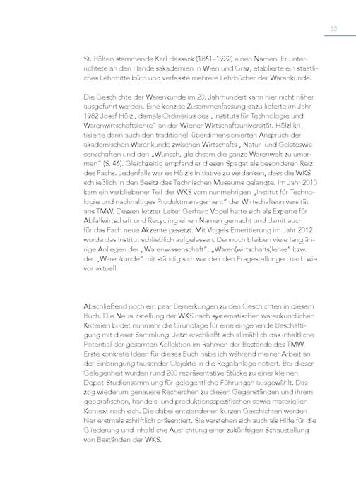 33 St. Pölten stammende Karl Hassack(1861–1922) einen Namen. Er unterrichtete an den Handelsakademien in Wien und Graz, etablierte ein staatliches Lehrmittelbüro und verfasste mehrere Lehrbücher der Warenkunde. Die Geschichte der Warenkunde im 20. Jahrhundert kann hier nicht näher ausgeführt werden. Eine konzise Zusammenfassung dazu lieferte im Jahr 1982 Josef Hölzl, damals Ordinarius des„Instituts für Technologie und Warenwirtschaftslehre“ an der Wiener Wirtschaftsuniversität. Hölzl kritisierte darin auch den traditionell überdimensionierten Anspruch der akademischen Warenkunde zwischen Wirtschafts-, Natur- und Geisteswissenschaften und den„Wunsch, gleichsam die ganze Warenwelt zu umarmen“(S. 46). Gleichzeitig empfand er diesen Spagat als besonderen Reiz des Fachs. Jedenfalls war es Hölzls Initiative zu verdanken, dass die WKS schließlich in den Besitz des Technischen Museums gelangte. Im Jahr 2010 kam ein verbliebener Teil der WKS vom nunmehrigen„Institut für Technologie und nachhaltiges Produktmanagement“ der Wirtschaftsuniversität ans TMW. Dessen letzter Leiter Gerhard Vogel hatte sich als Experte für Abfallwirtschaft und Recycling einen Namen gemacht und damit auch für das Fach neue Akzente gesetzt. Mit Vogels Emeritierung im Jahr 2012 wurde das Institut schließlich aufgelassen. Dennoch bleiben viele langjährige Anliegen der„Warenwissenschaft“,„Waren(wirtschafts)lehre“ bzw. der„Warenkunde“ mit ständig sich wandelnden Fragestellungen nach wie vor aktuell. Abschließend noch ein paar Bemerkungen zu den Geschichten in diesem Buch. Die Neuaufstellung der WKS nach systematischen warenkundlichen Kriterien bildet nunmehr die Grundlage für eine eingehende Beschäftigung mit dieser Sammlung. Jetzt erschließt sich allmählich das inhaltliche Potential der gesamten Kollektion im Rahmen der Bestände des TMW. Erste konkrete Ideen für dieses Buch habe ich während meiner Arbeit an der Einbringung tausender Objekte in die Regalanlage notiert. Bei dieser Gelegenheit wurden rund 200 repräsentative Stücke zu einer kleinen Depot-Studiensammlung für gelegentliche Führungen ausgewählt. Das zog wiederum genauere Recherchen zu diesen Gegenständen und ihrem geografischen, handels- und produktionsspezifischen sowie materiellen Kontext nach sich. Die dabei entstandenen kurzen Geschichten werden hier erstmals schriftlich präsentiert. Sie verstehen sich auch als Hilfe für die Gliederung und inhaltliche Ausrichtung einer zukünftigen Schaustellung von Beständen der WKS.