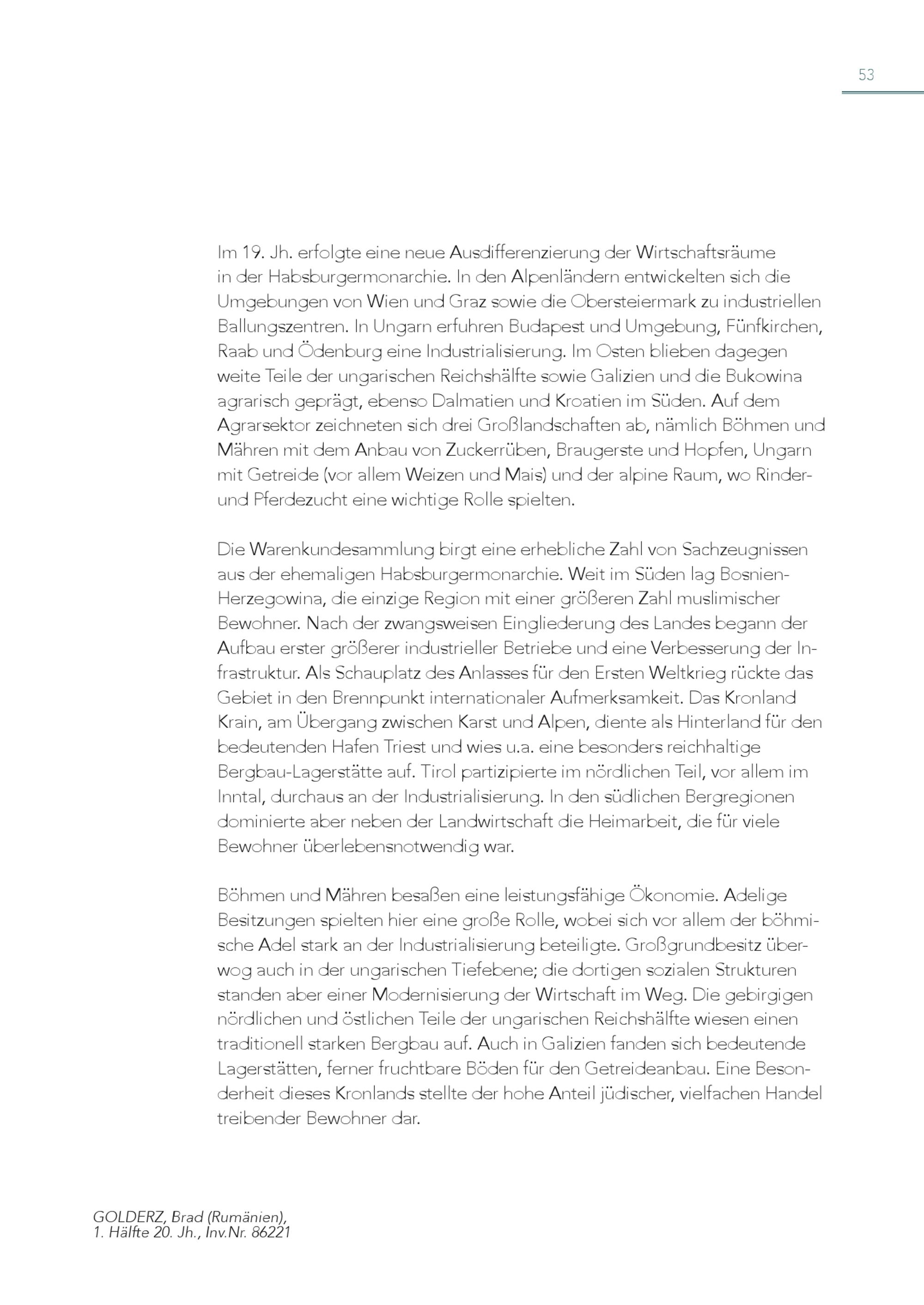 53 Im 19. Jh. erfolgte eine neue Ausdifferenzierung der Wirtschaftsräume in der Habsburgermonarchie. In den Alpenländern entwickelten sich die Umgebungen von Wien und Graz sowie die Obersteiermark zu industriellen Ballungszentren. In Ungarn erfuhren Budapest und Umgebung, Fünfkirchen, Raab und Ödenburg eine Industrialisierung. Im Osten blieben dagegen weite Teile der ungarischen Reichshälfte sowie Galizien und die Bukowina agrarisch geprägt, ebenso Dalmatien und Kroatien im Süden. Auf dem Agrarsektor zeichneten sich drei Großlandschaften ab, nämlich Böhmen und Mähren mit dem Anbau von Zuckerrüben, Braugerste und Hopfen, Ungarn mit Getreide(vor allem Weizen und Mais) und der alpine Raum, wo Rinderund Pferdezucht eine wichtige Rolle spielten. Die Warenkundesammlung birgt eine erhebliche Zahl von Sachzeugnissen aus der ehemaligen Habsburgermonarchie. Weit im Süden lag BosnienHerzegowina, die einzige Region mit einer größeren Zahl muslimischer Bewohner. Nach der zwangsweisen Eingliederung des Landes begann der Aufbau erster größerer industrieller Betriebe und eine Verbesserung der Infrastruktur. Als Schauplatz des Anlasses für den Ersten Weltkrieg rückte das Gebiet in den Brennpunkt internationaler Aufmerksamkeit. Das Kronland Krain, am Übergang zwischen Karst und Alpen, diente als Hinterland für den bedeutenden Hafen Triest und wies u.a. eine besonders reichhaltige Bergbau-Lagerstätte auf. Tirol partizipierte im nördlichen Teil, vor allem im Inntal, durchaus an der Industrialisierung. In den südlichen Bergregionen dominierte aber neben der Landwirtschaft die Heimarbeit, die für viele Bewohner überlebensnotwendig war. Böhmen und Mähren besaßen eine leistungsfähige Ökonomie. Adelige Besitzungen spielten hier eine große Rolle, wobei sich vor allem der böhmische Adel stark an der Industrialisierung beteiligte. Großgrundbesitz überwog auch in der ungarischen Tiefebene; die dortigen sozialen Strukturen standen aber einer Modernisierung der Wirtschaft im Weg. Die gebirgigen nördlichen und östlichen Teile der ungarischen Reichshälfte wiesen einen traditionell starken Bergbau auf. Auch in Galizien fanden sich bedeutende Lagerstätten, ferner fruchtbare Böden für den Getreideanbau. Eine Besonderheit dieses Kronlands stellte der hohe Anteil jüdischer, vielfachen Handel treibender Bewohner dar. GOLDERZ, Brad(Rumänien), 1. Hälfte 20. Jh., Inv.Nr. 86221