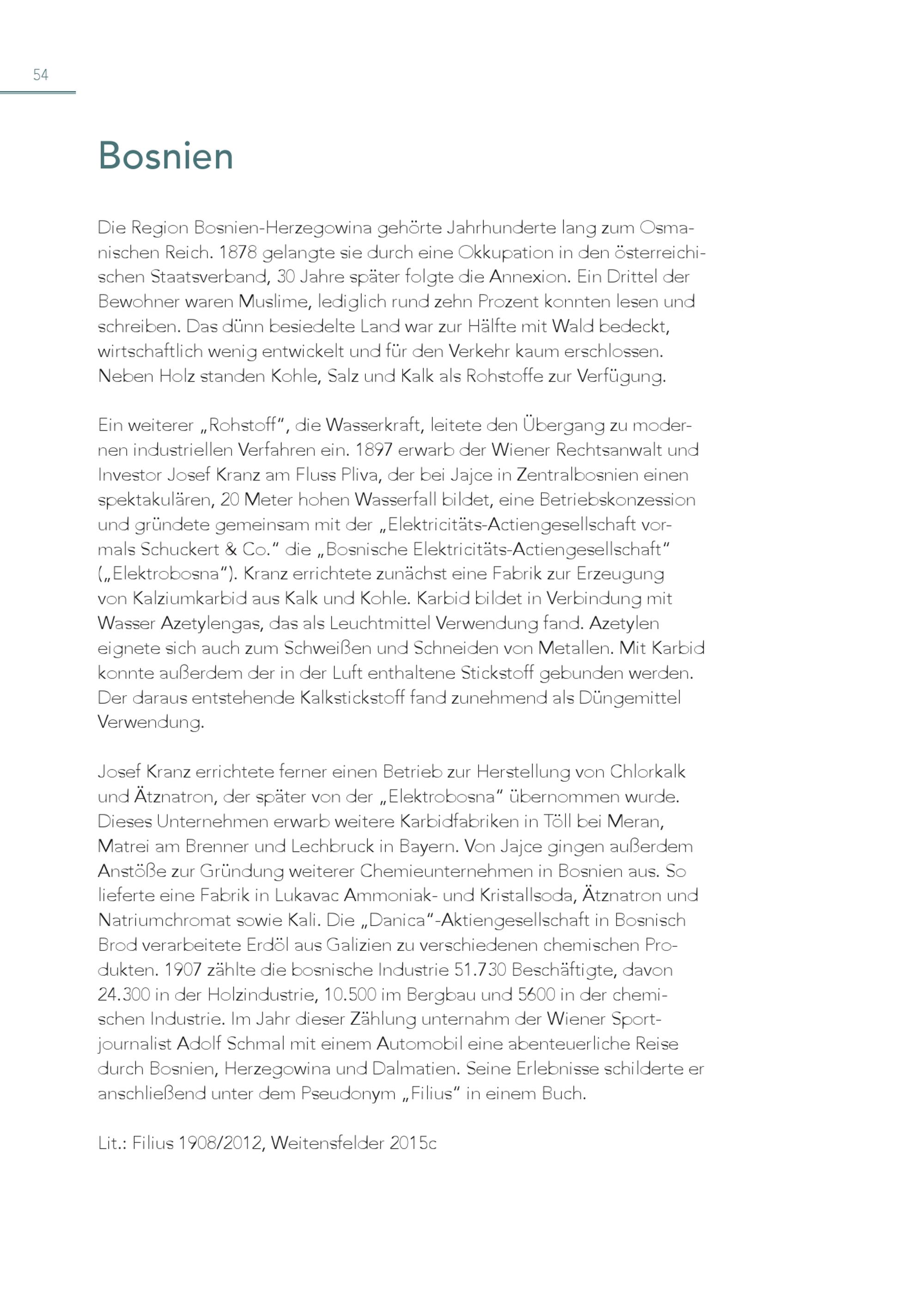 54 Bosnien Die Region Bosnien-Herzegowina gehörte Jahrhunderte lang zum Osmanischen Reich. 1878 gelangte sie durch eine Okkupation in den österreichischen Staatsverband, 30 Jahre später folgte die Annexion. Ein Drittel der Bewohner waren Muslime, lediglich rund zehn Prozent konnten lesen und schreiben. Das dünn besiedelte Land war zur Hälfte mit Wald bedeckt, wirtschaftlich wenig entwickelt und für den Verkehr kaum erschlossen. Neben Holz standen Kohle, Salz und Kalk als Rohstoffe zur Verfügung. Ein weiterer„Rohstoff“, die Wasserkraft, leitete den Übergang zu modernen industriellen Verfahren ein. 1897 erwarb der Wiener Rechtsanwalt und Investor Josef Kranz am Fluss Pliva, der bei Jajce in Zentralbosnien einen spektakulären, 20 Meter hohen Wasserfall bildet, eine Betriebskonzession und gründete gemeinsam mit der„Elektricitäts-Actiengesellschaft vormals Schuckert& Co.“ die„Bosnische Elektricitäts-Actiengesellschaft“ („Elektrobosna“). Kranz errichtete zunächst eine Fabrik zur Erzeugung von Kalziumkarbid aus Kalk und Kohle. Karbid bildet in Verbindung mit Wasser Azetylengas, das als Leuchtmittel Verwendung fand. Azetylen eignete sich auch zum Schweißen und Schneiden von Metallen. Mit Karbid konnte außerdem der in der Luft enthaltene Stickstoff gebunden werden. Der daraus entstehende Kalkstickstoff fand zunehmend als Düngemittel Verwendung. Josef Kranz errichtete ferner einen Betrieb zur Herstellung von Chlorkalk und Ätznatron, der später von der„Elektrobosna“ übernommen wurde. Dieses Unternehmen erwarb weitere Karbidfabriken in Töll bei Meran, Matrei am Brenner und Lechbruck in Bayern. Von Jajce gingen außerdem Anstöße zur Gründung weiterer Chemieunternehmen in Bosnien aus. So lieferte eine Fabrik in Lukavac Ammoniak- und Kristallsoda, Ätznatron und Natriumchromat sowie Kali. Die„Danica“-Aktiengesellschaft in Bosnisch Brod verarbeitete Erdöl aus Galizien zu verschiedenen chemischen Produkten. 1907 zählte die bosnische Industrie 51.730 Beschäftigte, davon 24.300 in der Holzindustrie, 10.500 im Bergbau und 5600 in der chemischen Industrie. Im Jahr dieser Zählung unternahm der Wiener Sportjournalist Adolf Schmal mit einem Automobil eine abenteuerliche Reise durch Bosnien, Herzegowina und Dalmatien. Seine Erlebnisse schilderte er anschließend unter dem Pseudonym„Filius“ in einem Buch. Lit.: Filius 1908/2012, Weitensfelder 2015c