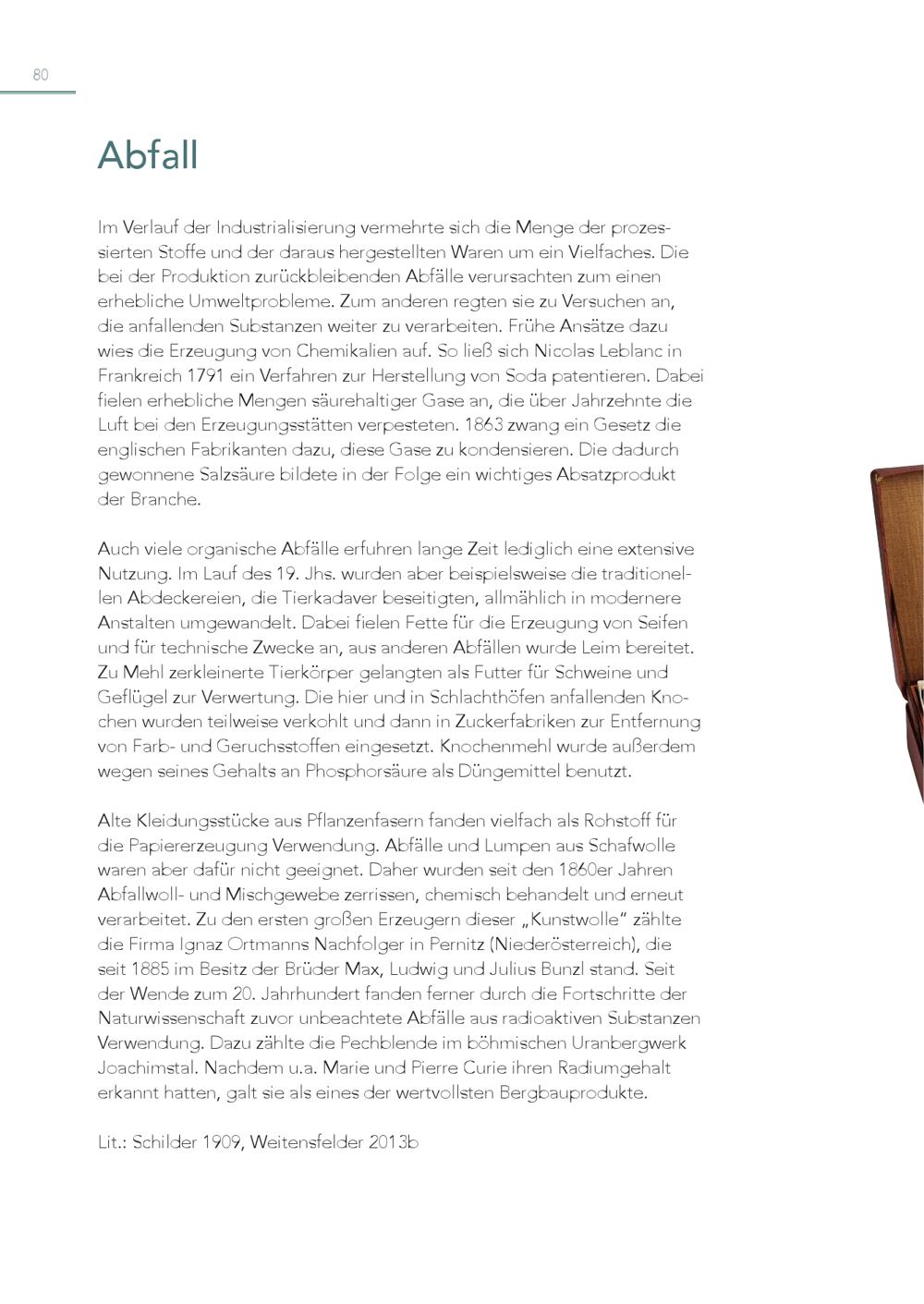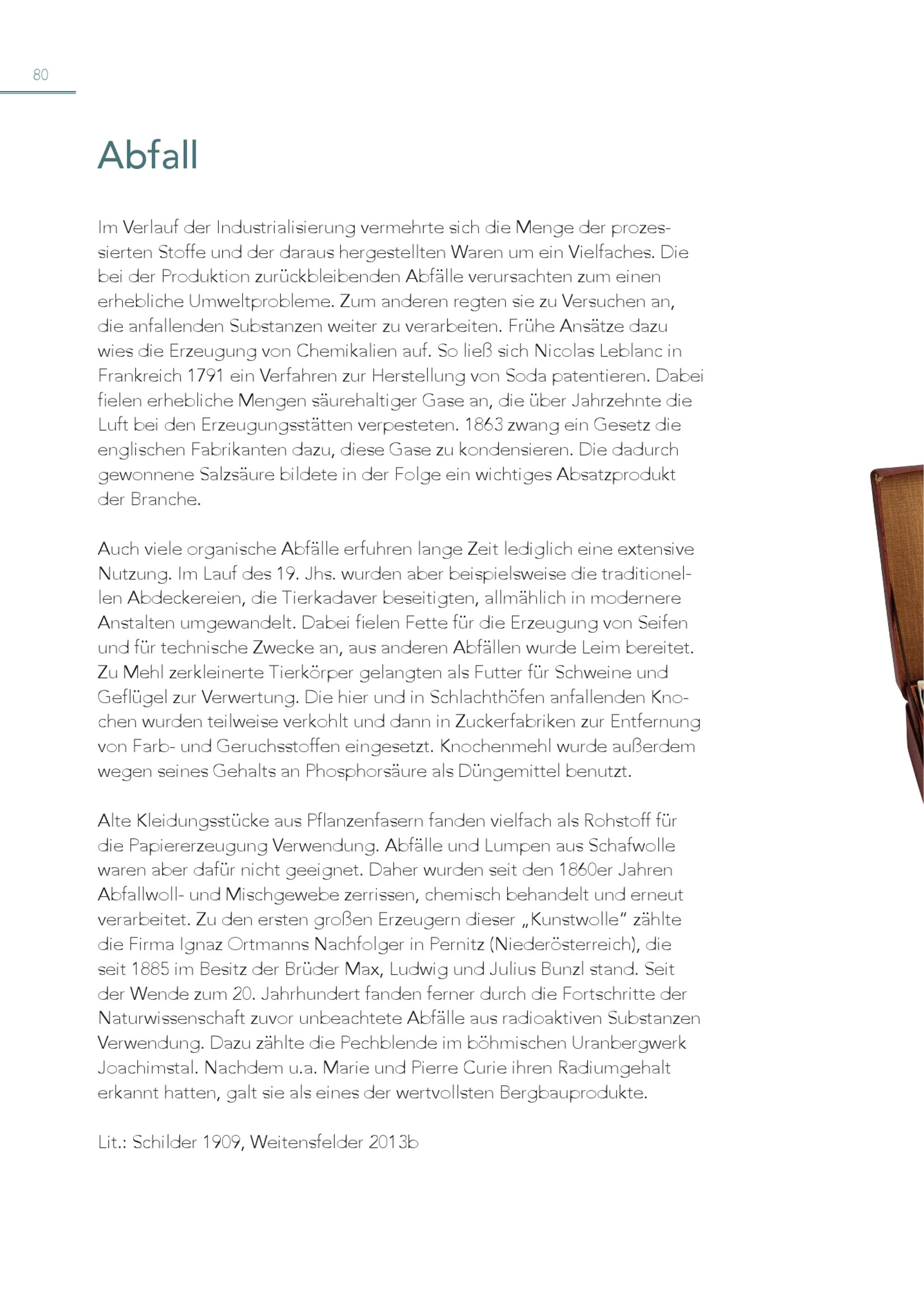 80 Abfall Im Verlauf der Industrialisierung vermehrte sich die Menge der prozes sierten Stoffe und der daraus hergestellten Waren um ein Vielfaches. Die bei der Produktion zurückbleibenden Abfälle verursachten zum einen erhebliche Umweltprobleme. Zum anderen regten sie zu Versuchen an, die anfallenden Substanzen weiter zu verarbeiten. Frühe Ansätze dazu wies die Erzeugung von Chemikalien auf. So ließ sich Nicolas Leblanc in Frankreich 1791 ein Verfahren zur Herstellung von Soda patentieren. Dabei fielen erhebliche Mengen säurehaltiger Gase an, die über Jahrzehnte die Luft bei den Erzeugungsstätten verpesteten. 1863 zwang ein Gesetz die englischen Fabrikanten dazu, diese Gase zu kondensieren. Die dadurch gewonnene Salzsäure bildete in der Folge ein wichtiges Absatzprodukt der Branche. Auch viele organische Abfälle erfuhren lange Zeit lediglich eine extensive Nutzung. Im Lauf des 19. Jhs. wurden aber beispielsweise die traditionel len Abdeckereien, die Tierkadaver beseitigten, allmählich in modernere Anstalten umgewandelt. Dabei fielen Fette für die Erzeugung von Seifen und für technische Zwecke an, aus anderen Abfällen wurde Leim bereitet. Zu Mehl zerkleinerte Tierkörper gelangten als Futter für Schweine und Geflügel zur Verwertung. Die hier und in Schlachthöfen anfallenden Kno chen wurden teilweise verkohlt und dann in Zuckerfabriken zur Entfernung von Farb- und Geruchsstoffen eingesetzt. Knochenmehl wurde außerdem wegen seines Gehalts an Phosphorsäure als Düngemittel benutzt. Alte Kleidungsstücke aus Pflanzenfasern fanden vielfach als Rohstoff für die Papiererzeugung Verwendung. Abfälle und Lumpen aus Schafwolle waren aber dafür nicht geeignet. Daher wurden seit den 1860er Jahren Abfallwoll- und Mischgewebe zerrissen, chemisch behandelt und erneut verarbeitet. Zu den ersten großen Erzeugern dieser„Kunstwolle“ zählte die Firma Ignaz Ortmanns Nachfolger in Pernitz(Niederösterreich), die seit 1885 im Besitz der Brüder Max, Ludwig und Julius Bunzl stand. Seit der Wende zum 20. Jahrhundert fanden ferner durch die Fortschritte der Naturwissenschaft zuvor unbeachtete Abfälle aus radioaktiven Substanzen Verwendung. Dazu zählte die Pechblende im böhmischen Uranbergwerk Joachimstal. Nachdem u.a. Marie und Pierre Curie ihren Radiumgehalt erkannt hatten, galt sie als eines der wertvollsten Bergbauprodukte. Lit.: Schilder 1909, Weitensfelder 2013b