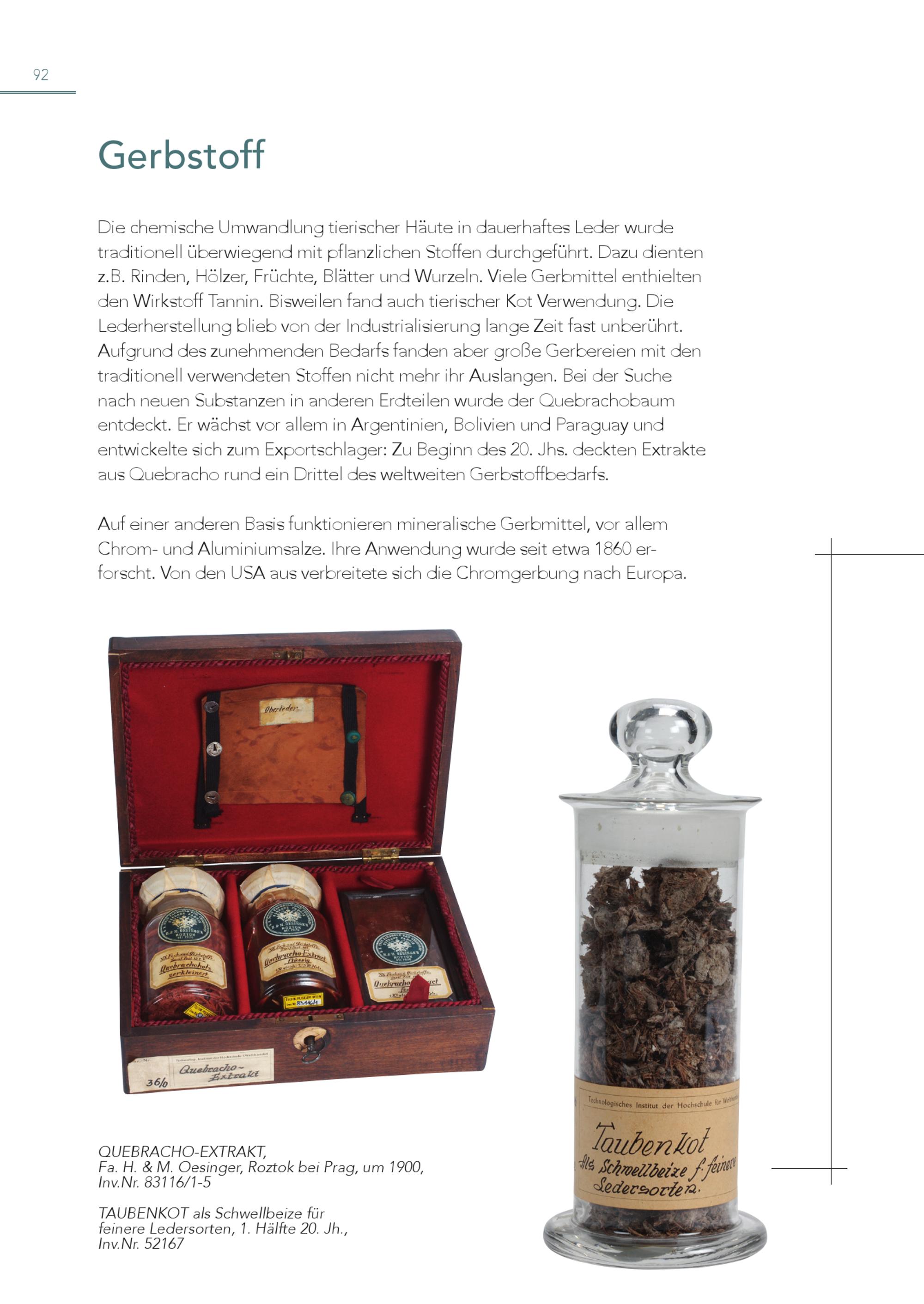 92 Gerbstoff Die chemische Umwandlung tierischer Häute in dauerhaftes Leder wurde traditionell überwiegend mit pflanzlichen Stoffen durchgeführt. Dazu dienten z.B. Rinden, Hölzer, Früchte, Blätter und Wurzeln. Viele Gerbmittel enthielten den Wirkstoff Tannin. Bisweilen fand auch tierischer Kot Verwendung. Die Lederherstellung blieb von der Industrialisierung lange Zeit fast unberührt. Aufgrund des zunehmenden Bedarfs fanden aber große Gerbereien mit den traditionell verwendeten Stoffen nicht mehr ihr Auslangen. Bei der Suche nach neuen Substanzen in anderen Erdteilen wurde der Quebrachobaum entdeckt. Er wächst vor allem in Argentinien, Bolivien und Paraguay und entwickelte sich zum Exportschlager: Zu Beginn des 20. Jhs. deckten Extrakte aus Quebracho rund ein Drittel des weltweiten Gerbstoffbedarfs. Auf einer anderen Basis funktionieren mineralische Gerbmittel, vor allem Chrom- und Aluminiumsalze. Ihre Anwendung wurde seit etwa 1860 erforscht. Von den USA aus verbreitete sich die Chromgerbung nach Europa. QUEBRACHO-EXTRAKT, Fa. H.& M. Oesinger, Roztok bei Prag, um 1900, Inv.Nr. 83116/1-5 TAUBENKOT als Schwellbeize für feinere Ledersorten, 1. Hälfte 20. Jh., Inv.Nr. 52167