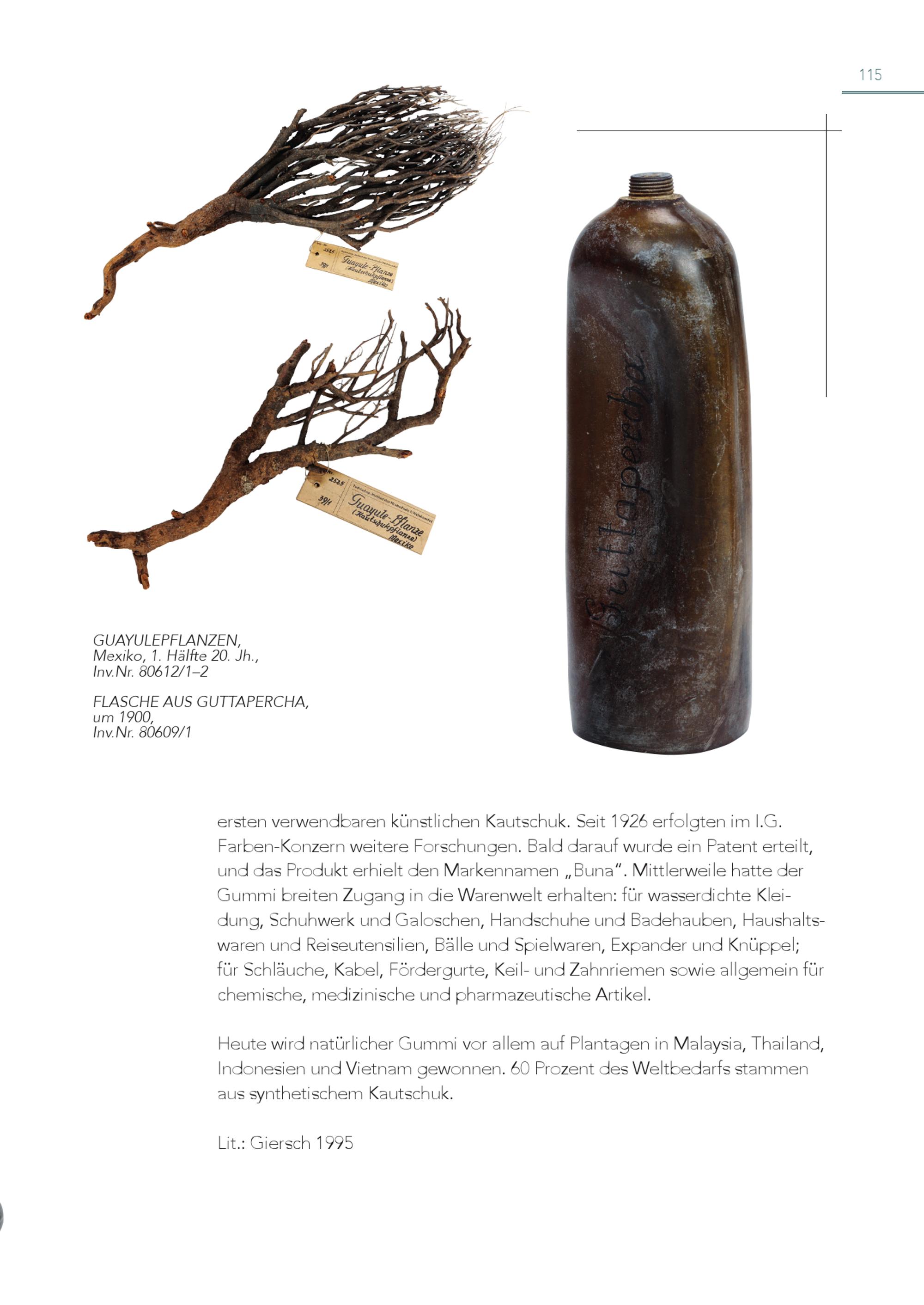 115 GUAYULEPFLANZEN, Mexiko, 1. Hälfte 20. Jh., Inv.Nr. 80612/1–2 FLASCHE AUS GUTTAPERCHA, um 1900, Inv.Nr. 80609/1 ersten verwendbaren künstlichen Kautschuk. Seit 1926 erfolgten im I.G. Farben-Konzern weitere Forschungen. Bald darauf wurde ein Patent erteilt, und das Produkt erhielt den Markennamen„Buna“. Mittlerweile hatte der Gummi breiten Zugang in die Warenwelt erhalten: für wasserdichte Klei dung, Schuhwerk und Galoschen, Handschuhe und Badehauben, Haushaltswaren und Reiseutensilien, Bälle und Spielwaren, Expander und Knüppel; für Schläuche, Kabel, Fördergurte, Keil- und Zahnriemen sowie allgemein für chemische, medizinische und pharmazeutische Artikel. Heute wird natürlicher Gummi vor allem auf Plantagen in Malaysia, Thailand, Indonesien und Vietnam gewonnen. 60 Prozent des Weltbedarfs stammen aus synthetischem Kautschuk. Lit.: Giersch 1995