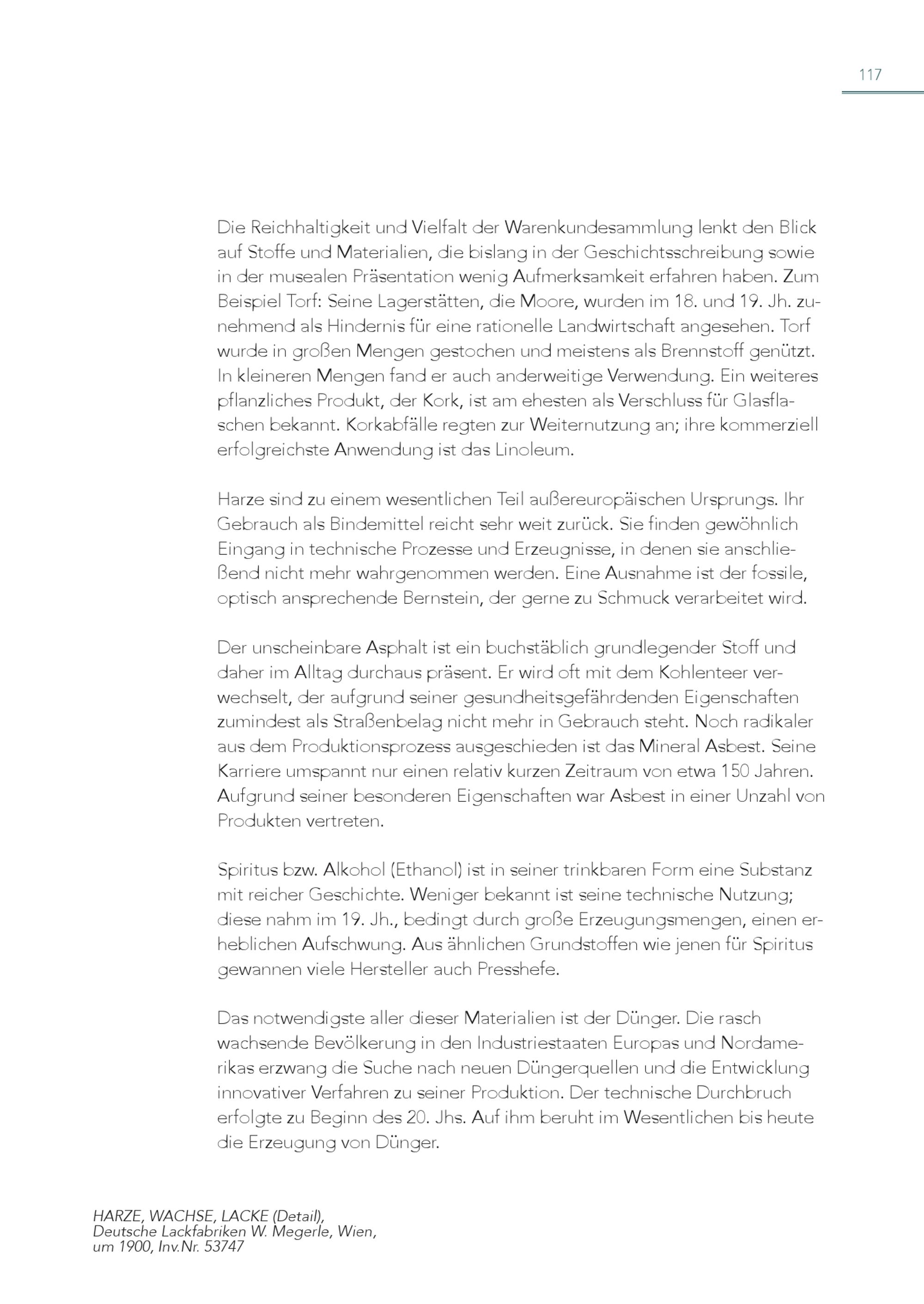 117 Die Reichhaltigkeit und Vielfalt der Warenkundesammlung lenkt den Blick auf Stoffe und Materialien, die bislang in der Geschichtsschreibung sowie in der musealen Präsentation wenig Aufmerksamkeit erfahren haben. Zum Beispiel Torf: Seine Lagerstätten, die Moore, wurden im 18. und 19. Jh. zunehmend als Hindernis für eine rationelle Landwirtschaft angesehen. Torf wurde in großen Mengen gestochen und meistens als Brennstoff genützt. In kleineren Mengen fand er auch anderweitige Verwendung. Ein weiteres pflanzliches Produkt, der Kork, ist am ehesten als Verschluss für Glasfla schen bekannt. Korkabfälle regten zur Weiternutzung an; ihre kommerziell erfolgreichste Anwendung ist das Linoleum. Harze sind zu einem wesentlichen Teil außereuropäischen Ursprungs. Ihr Gebrauch als Bindemittel reicht sehr weit zurück. Sie finden gewöhnlich Eingang in technische Prozesse und Erzeugnisse, in denen sie anschließend nicht mehr wahrgenommen werden. Eine Ausnahme ist der fossile, optisch ansprechende Bernstein, der gerne zu Schmuck verarbeitet wird. Der unscheinbare Asphalt ist ein buchstäblich grundlegender Stoff und daher im Alltag durchaus präsent. Er wird oft mit dem Kohlenteer ver wechselt, der aufgrund seiner gesundheitsgefährdenden Eigenschaften zumindest als Straßenbelag nicht mehr in Gebrauch steht. Noch radikaler aus dem Produktionsprozess ausgeschieden ist das Mineral Asbest. Seine Karriere umspannt nur einen relativ kurzen Zeitraum von etwa 150 Jahren. Aufgrund seiner besonderen Eigenschaften war Asbest in einer Unzahl von Produkten vertreten. Spiritus bzw. Alkohol(Ethanol) ist in seiner trinkbaren Form eine Substanz mit reicher Geschichte. Weniger bekannt ist seine technische Nutzung; diese nahm im 19. Jh., bedingt durch große Erzeugungsmengen, einen erheblichen Aufschwung. Aus ähnlichen Grundstoffen wie jenen für Spiritus gewannen viele Hersteller auch Presshefe. Das notwendigste aller dieser Materialien ist der Dünger. Die rasch wachsende Bevölkerung in den Industriestaaten Europas und Nordame rikas erzwang die Suche nach neuen Düngerquellen und die Entwicklung innovativer Verfahren zu seiner Produktion. Der technische Durchbruch erfolgte zu Beginn des 20. Jhs. Auf ihm beruht im Wesentlichen bis heute die Erzeugung von Dünger. HARZE, WACHSE, LACKE(Detail), Deutsche Lackfabriken W. Megerle, Wien, um 1900, Inv.Nr. 53747