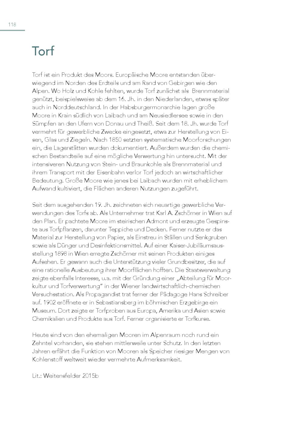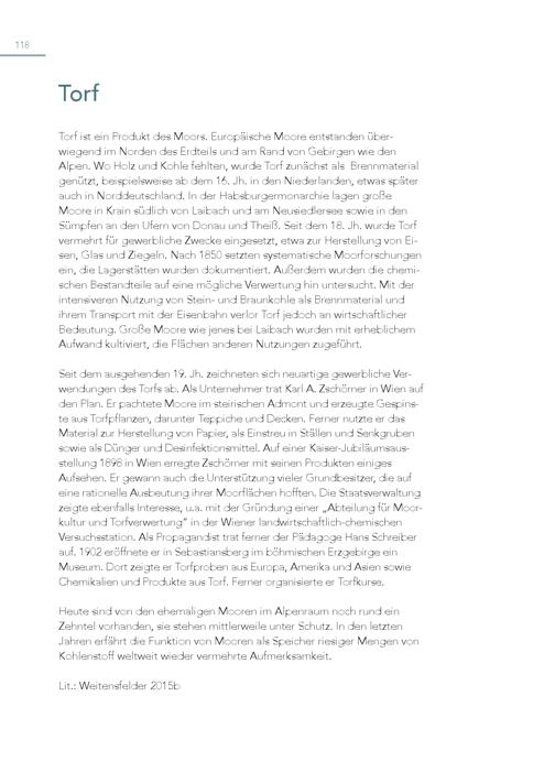 118 Torf Torf ist ein Produkt des Moors. Europäische Moore entstanden überwiegend im Norden des Erdteils und am Rand von Gebirgen wie den Alpen. Wo Holz und Kohle fehlten, wurde Torf zunächst als Brennmaterial genützt, beispielsweise ab dem 16. Jh. in den Niederlanden, etwas später auch in Norddeutschland. In der Habsburgermonarchie lagen große Moore in Krain südlich von Laibach und am Neusiedlersee sowie in den Sümpfen an den Ufern von Donau und Theiß. Seit dem 18. Jh. wurde Torf vermehrt für gewerbliche Zwecke eingesetzt, etwa zur Herstellung von Eisen, Glas und Ziegeln. Nach 1850 setzten systematische Moorforschungen ein, die Lagerstätten wurden dokumentiert. Außerdem wurden die chemischen Bestandteile auf eine mögliche Verwertung hin untersucht. Mit der intensiveren Nutzung von Stein- und Braunkohle als Brennmaterial und ihrem Transport mit der Eisenbahn verlor Torf jedoch an wirtschaftlicher Bedeutung. Große Moore wie jenes bei Laibach wurden mit erheblichem Aufwand kultiviert, die Flächen anderen Nutzungen zugeführt. Seit dem ausgehenden 19. Jh. zeichneten sich neuartige gewerbliche Verwendungen des Torfs ab. Als Unternehmer trat Karl A. Zschörner in Wien auf den Plan. Er pachtete Moore im steirischen Admont und erzeugte Gespinste aus Torfpflanzen, darunter Teppiche und Decken. Ferner nutzte er das Material zur Herstellung von Papier, als Einstreu in Ställen und Senkgruben sowie als Dünger und Desinfektionsmittel. Auf einer Kaiser-Jubiläumsaus stellung 1898 in Wien erregte Zschörner mit seinen Produkten einiges Aufsehen. Er gewann auch die Unterstützung vieler Grundbesitzer, die auf eine rationelle Ausbeutung ihrer Moorflächen hofften. Die Staatsverwaltung zeigte ebenfalls Interesse, u.a. mit der Gründung einer„Abteilung für Moorkultur und Torfverwertung“ in der Wiener landwirtschaftlich-chemischen Versuchsstation. Als Propagandist trat ferner der Pädagoge Hans Schreiber auf. 1902 eröffnete er in Sebastiansberg im böhmischen Erzgebirge ein Museum. Dort zeigte er Torfproben aus Europa, Amerika und Asien sowie Chemikalien und Produkte aus Torf. Ferner organisierte er Torfkurse. Heute sind von den ehemaligen Mooren im Alpenraum noch rund ein Zehntel vorhanden, sie stehen mittlerweile unter Schutz. In den letzten Jahren erfährt die Funktion von Mooren als Speicher riesiger Mengen von Kohlenstoff weltweit wieder vermehrte Aufmerksamkeit. Lit.: Weitensfelder 2015b